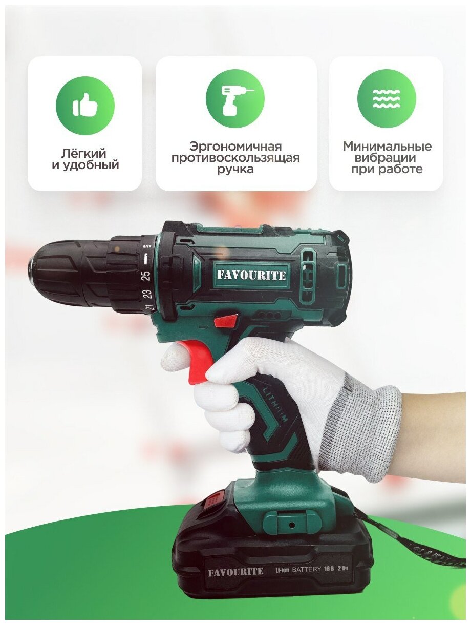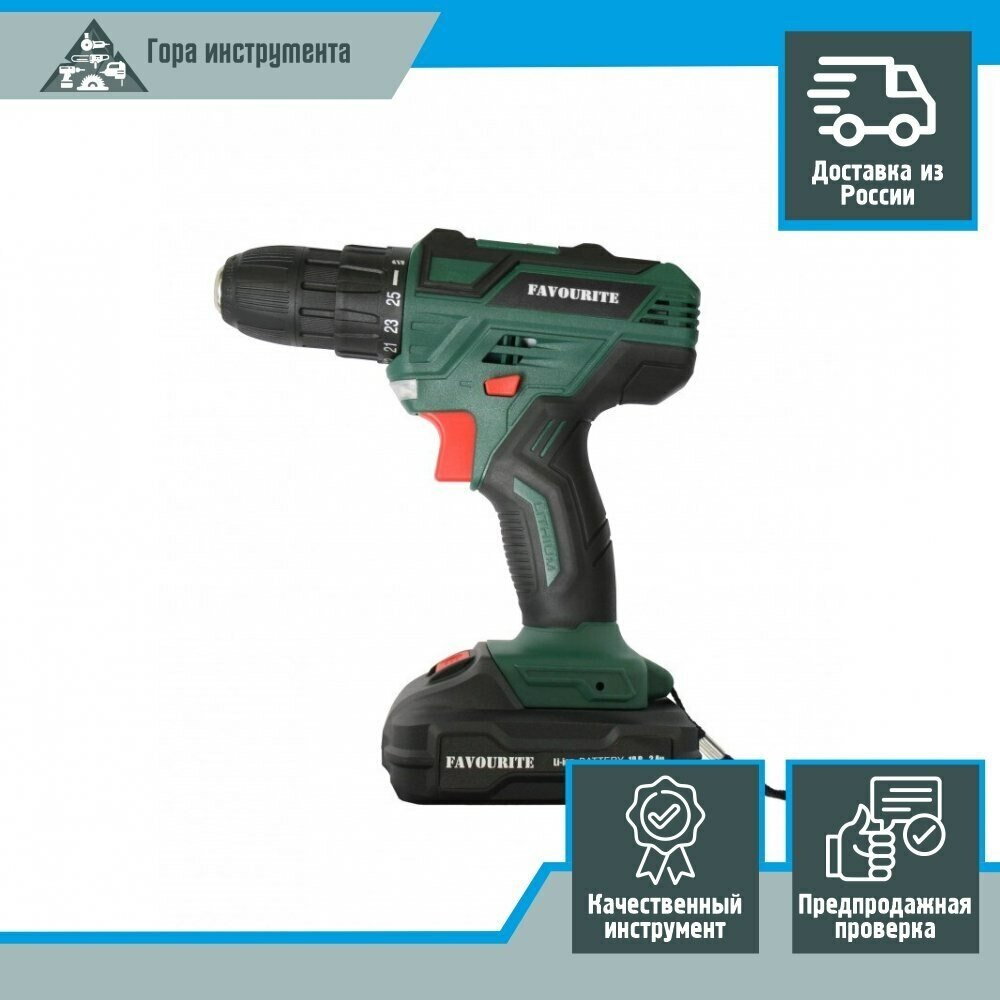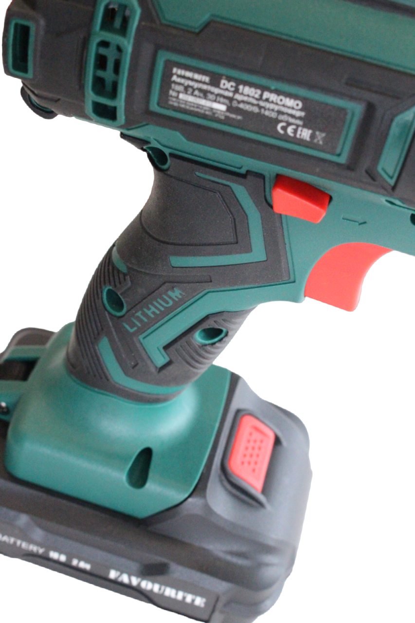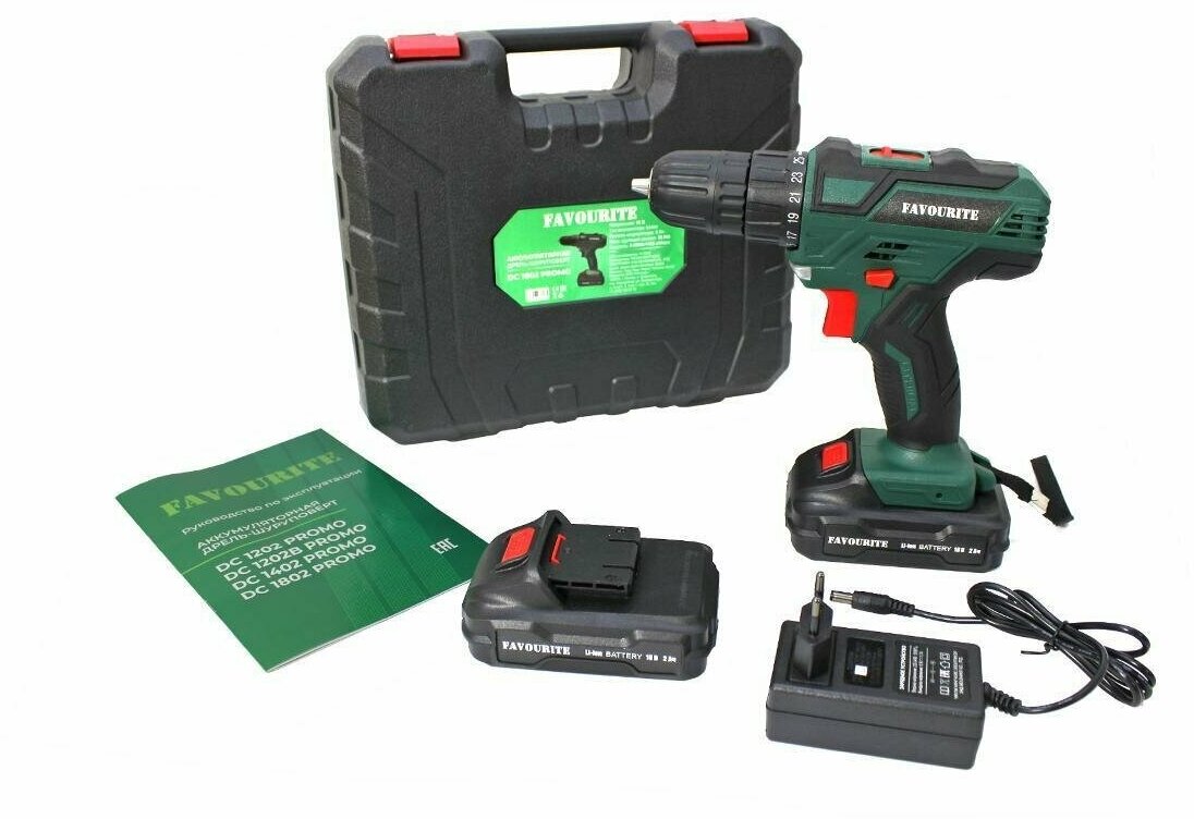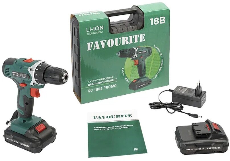 Аккумуляторная дрель-шуруповёрт Favourite DC 1802 PROMO предназначена для работы с крепежом и сверления отверстий. Комплектация: Аккумуляторная дрель-шуруповёрт; Аккумулятор - 2 шт; Зарядное устройство; Инструкция; Кейс. Характеристики: Тип двигателя: щеточный; Наличие реверса: да; Наличие подсветки: да; Тормоз двигателя: есть; Тип патрона: быстрозажимной; Число скоростей: 2; Частота вращения шпинделя: 1350 об/мин; Тип аккумулятора: Li-lon; Количество аккумуляторов в комплекте: 2; Крепление на ремень: да. Преимущества: 25 ступеней крутящего момента позволяют подбирать наиболее подходящий режим работы для конкретных задач; Для комфортного использования предусмотрена удобная рукоять; Аккумуляторная технология избавляет оператора от необходимости следить за шнуром питания. Два Li-ion аккумулятора без эффекта памяти с ЗУ, подсветка рабочей зоны делают работу с инструментом легкой и приятной. Дрель-шуруповерт Favourite DC 1802 PROMO надежный электроинструмент!