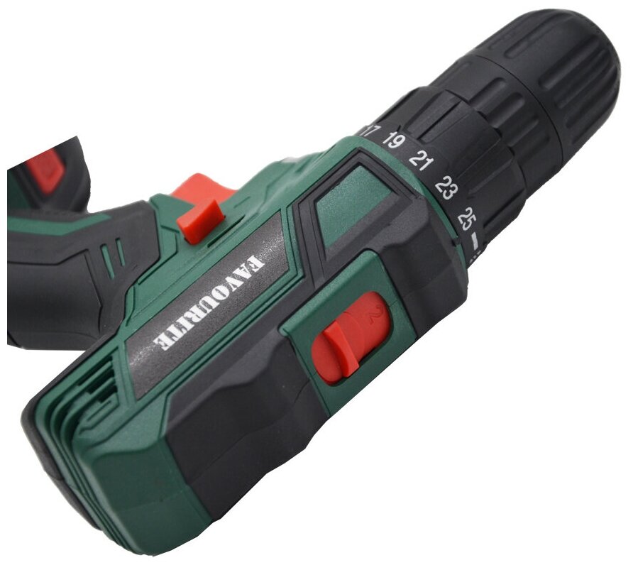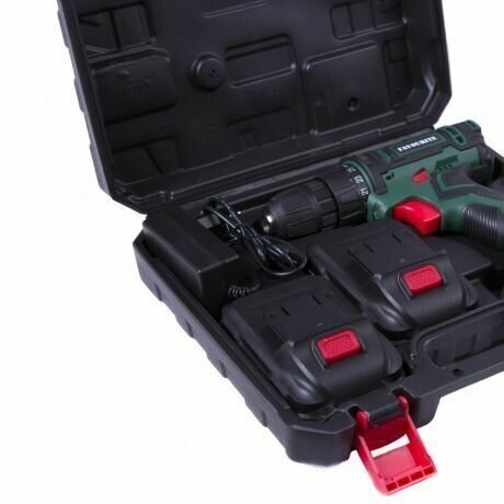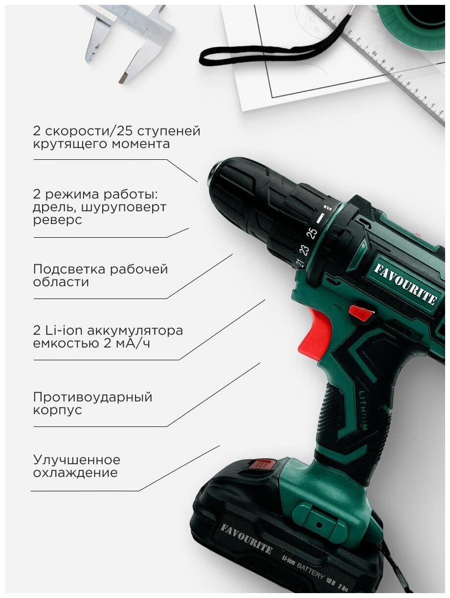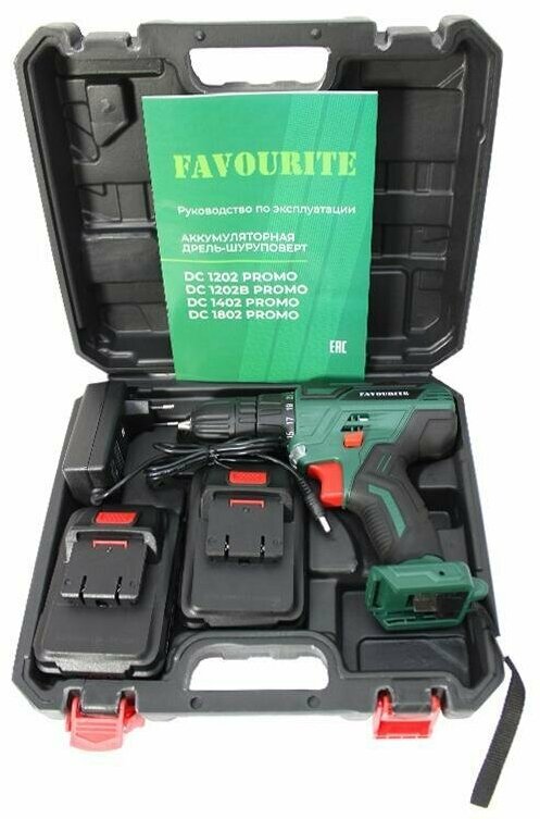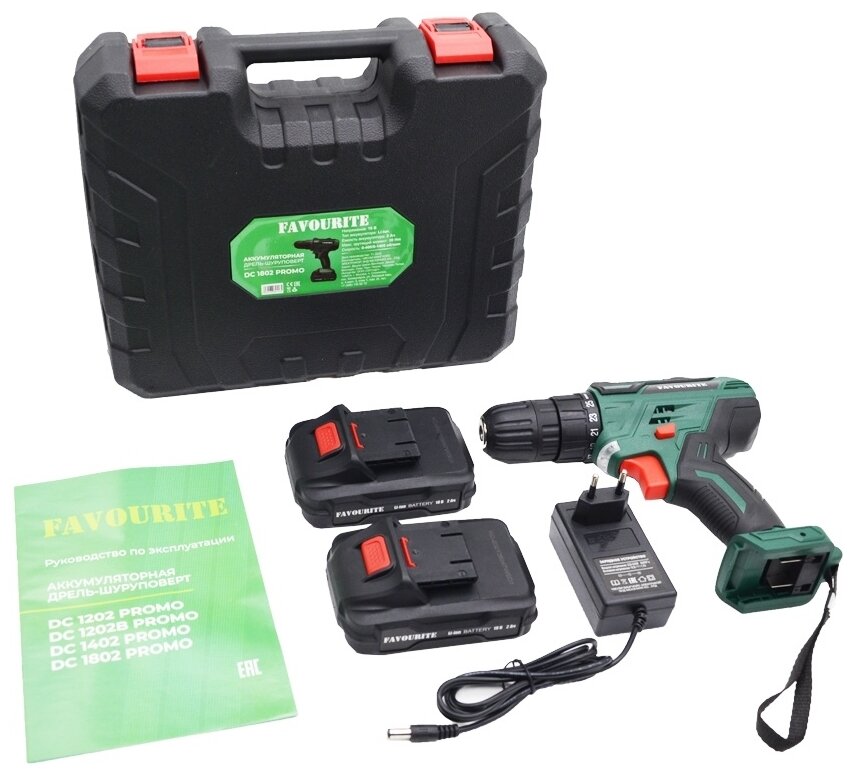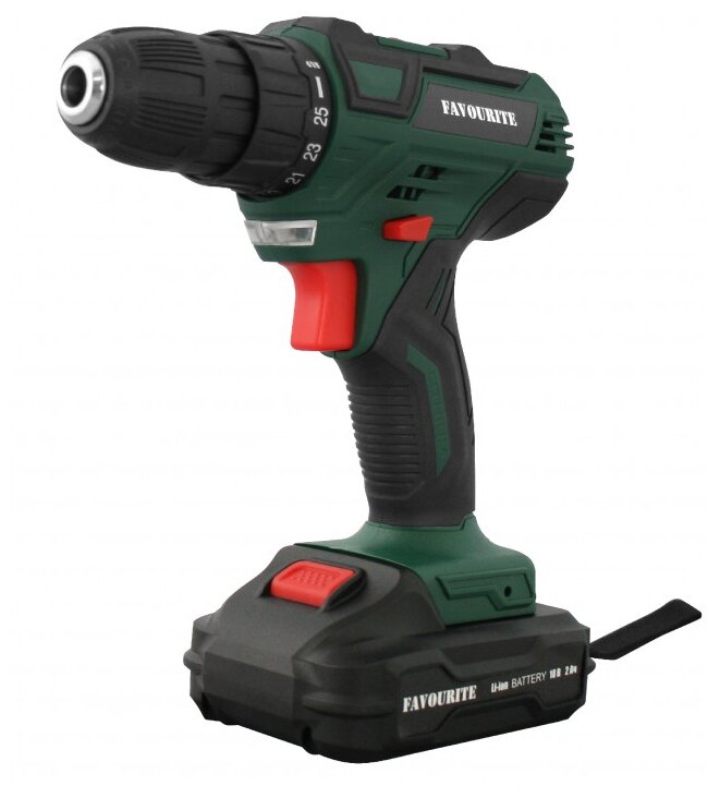 Аккумуляторная дрель-шуруповёрт Favourite DC 1802 PROMO предназначена для работы с крепежом и сверления отверстий. Комплектация: Аккумуляторная дрель-шуруповёрт; Аккумулятор - 2 шт; Зарядное устройство; Инструкция; Кейс. Характеристики: Тип двигателя: щеточный; Наличие реверса: да; Наличие подсветки: да; Тормоз двигателя: есть; Тип патрона: быстрозажимной; Число скоростей: 2; Частота вращения шпинделя: 1350 об/мин; Тип аккумулятора: Li-lon; Количество аккумуляторов в комплекте: 2; Крепление на ремень: да. Преимущества: 25 ступеней крутящего момента позволяют подбирать наиболее подходящий режим работы для конкретных задач; Для комфортного использования предусмотрена удобная рукоять; Аккумуляторная технология избавляет оператора от необходимости следить за шнуром питания. Два Li-ion аккумулятора без эффекта памяти с ЗУ, подсветка рабочей зоны делают работу с инструментом легкой и приятной. Дрель-шуруповерт Favourite DC 1802 PROMO надежный электроинструмент!