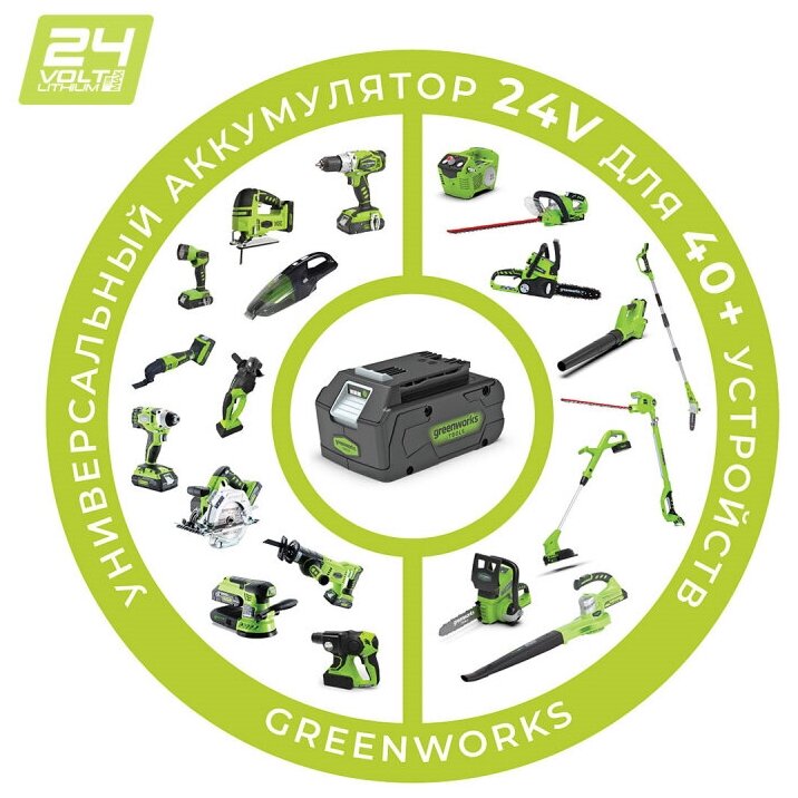 - Работа от 24V аккумулятора совместимого с другими устройствами из линейки G-24