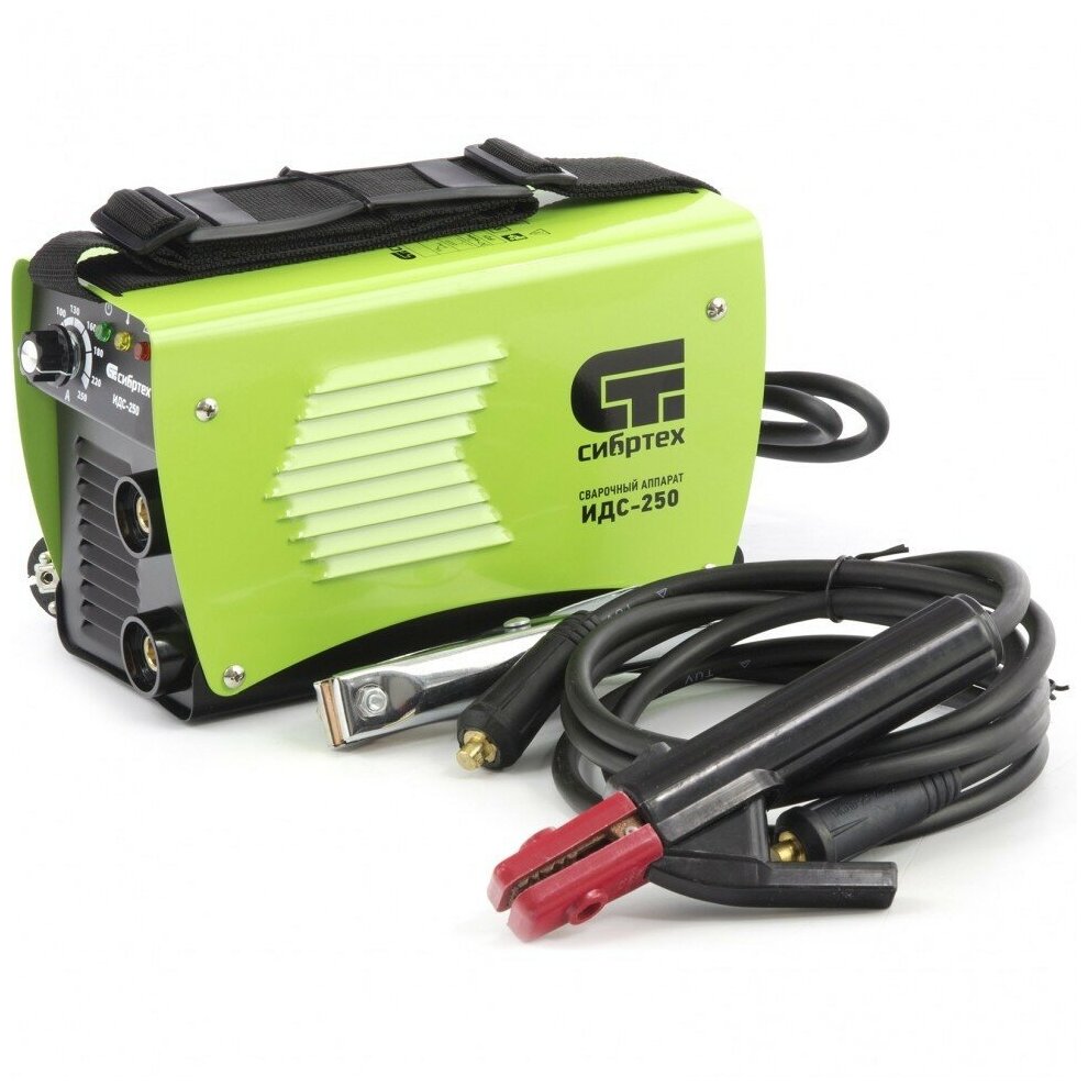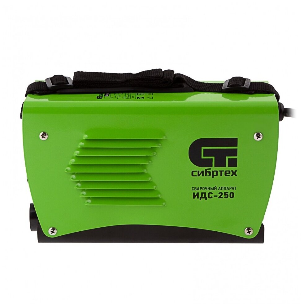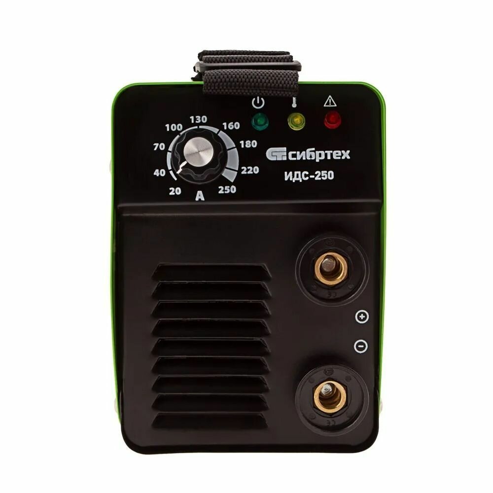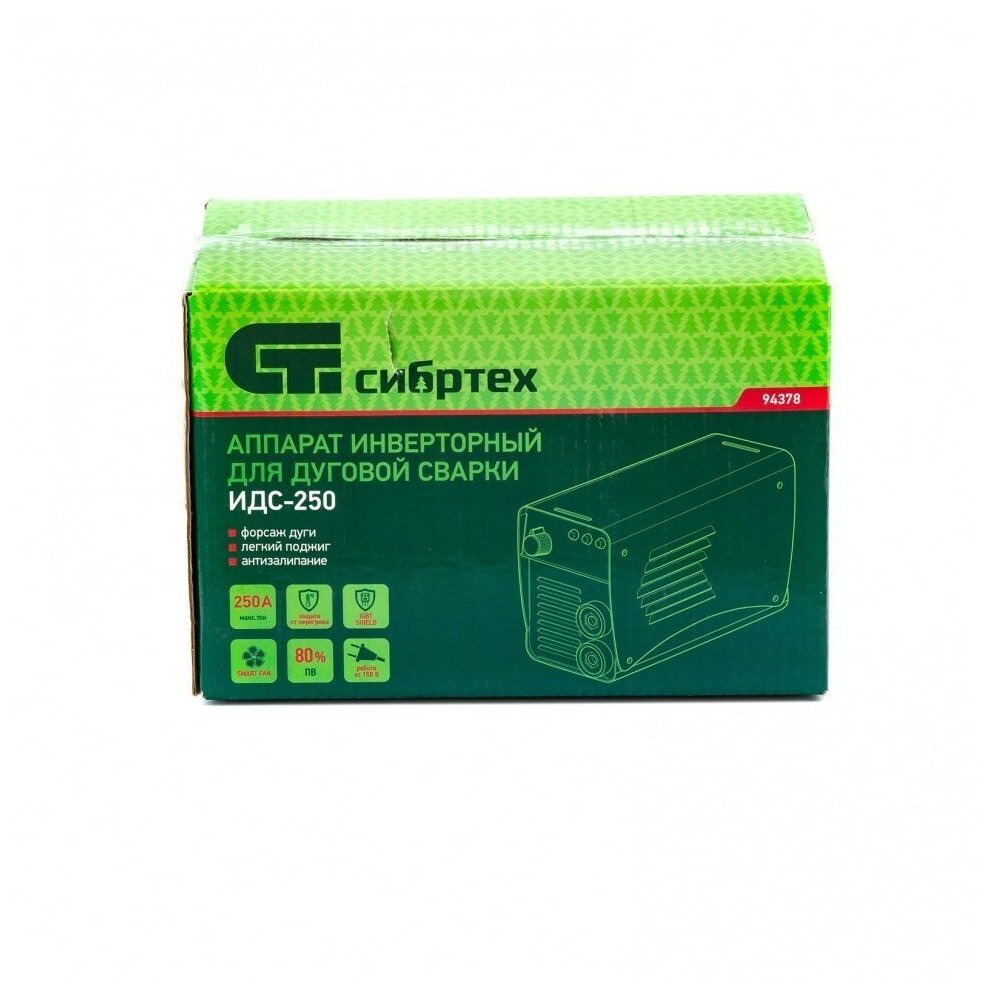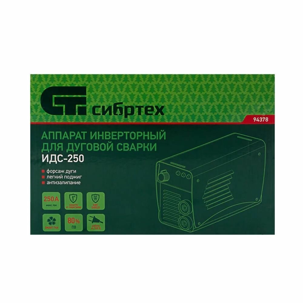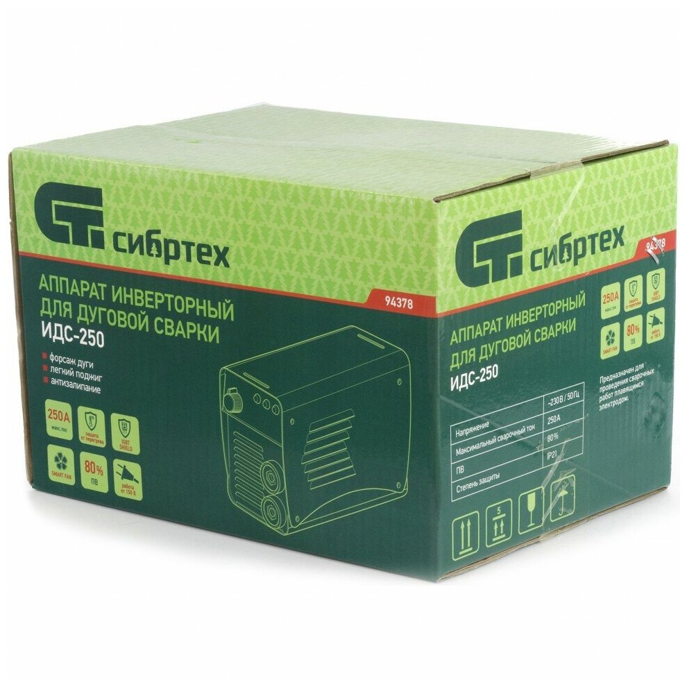 Инверторный аппарат дуговой сварки Сибртех ИДС-250 94378 с максимальной силой сварочного тока 250 А и продолжительностью включения 80% работает с электродами диаметром 1,6-5 мм. Позволяет сваривать металлические конструкции толщиной до 14 мм. Будет полезен в гараже, частном хозяйстве, на строительной площадке, а также в сфере ЖКХ. Аппарат стабильно работает даже при пониженном входном напряжении 150 Вт. Модель отличается простым управлением и бесшумной работой.