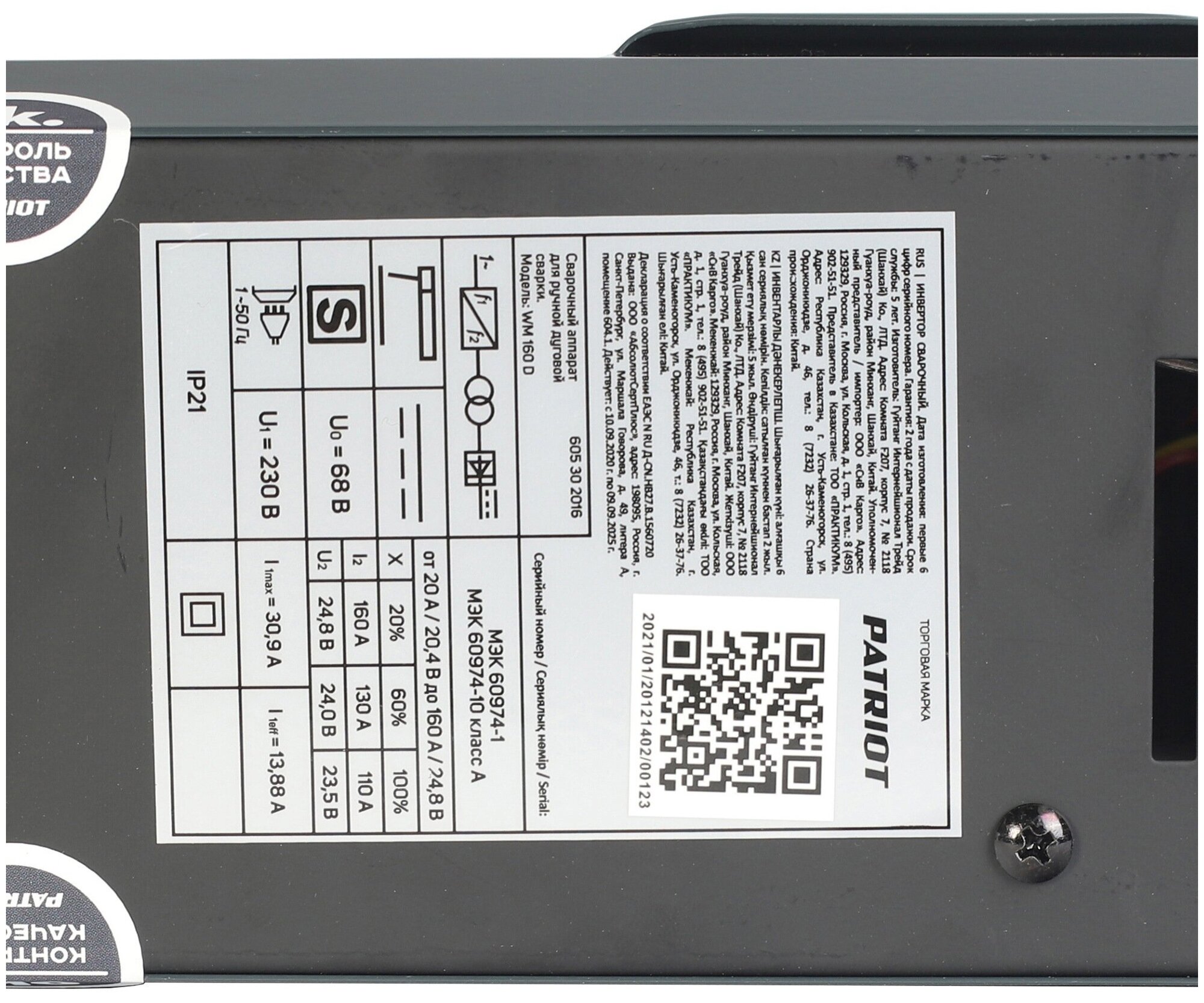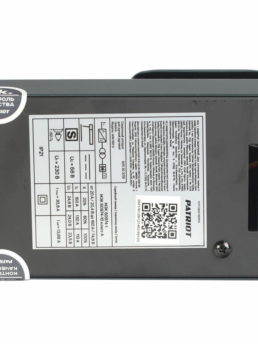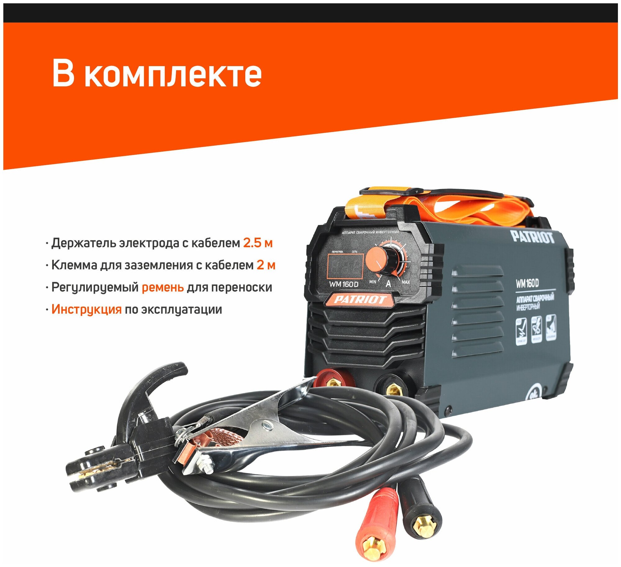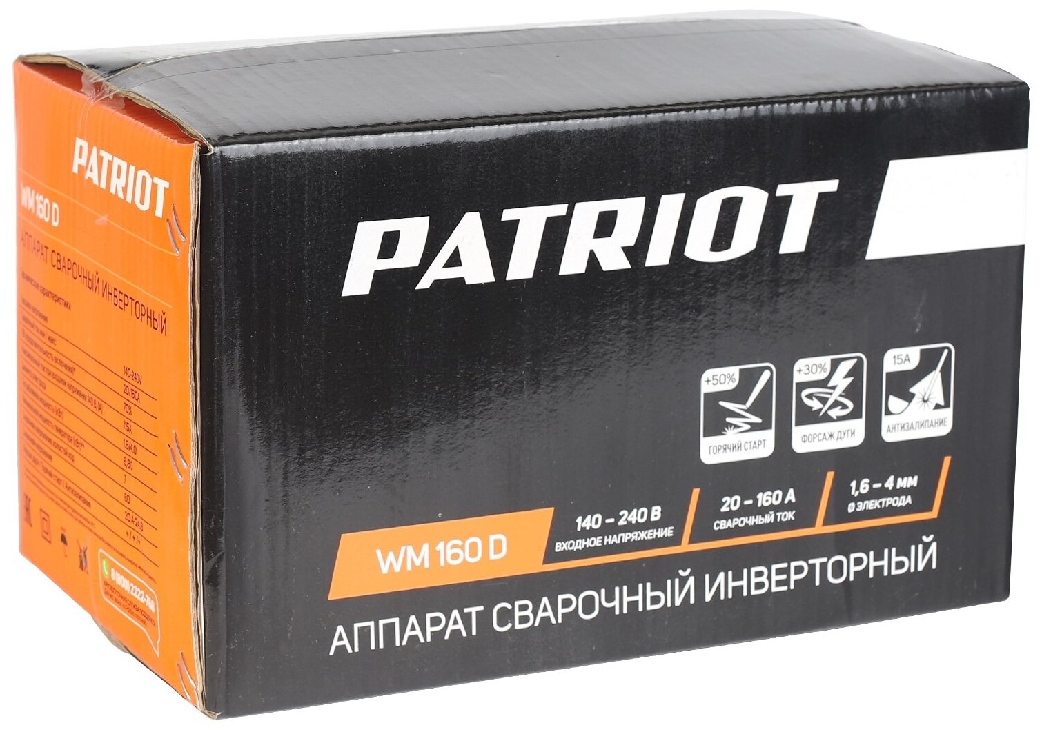 Аппарат сварочный инверторный PATRIOT WM160D MMA, входное напряжение: 1ф,140-240В(605302016)