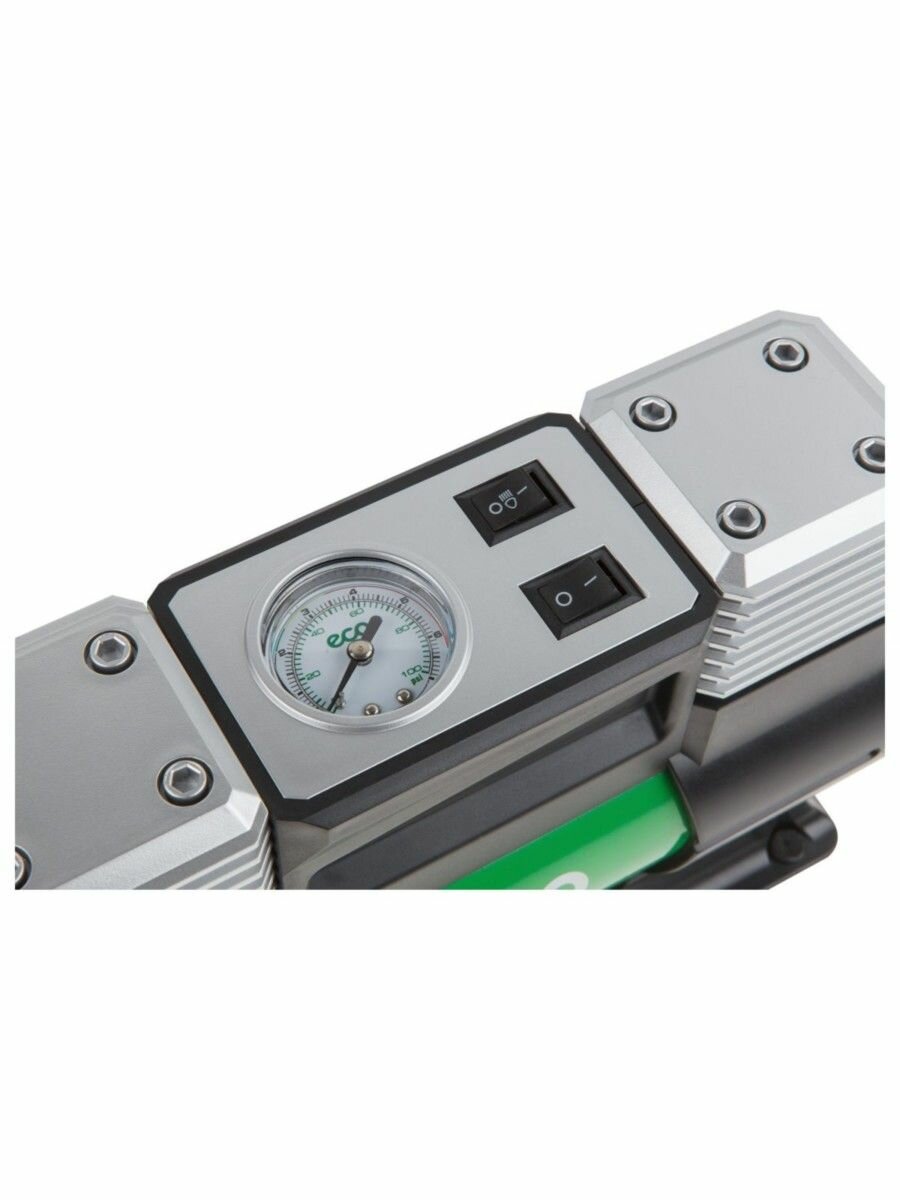 Автомобильный компрессор ECO AE-028-2 - двухцилиндровый производительный насос. Мощный двигатель со 100% медной обмоткой и большим статором обеспечивает гарантированно высокий ресурс устройства и быстроту работы.