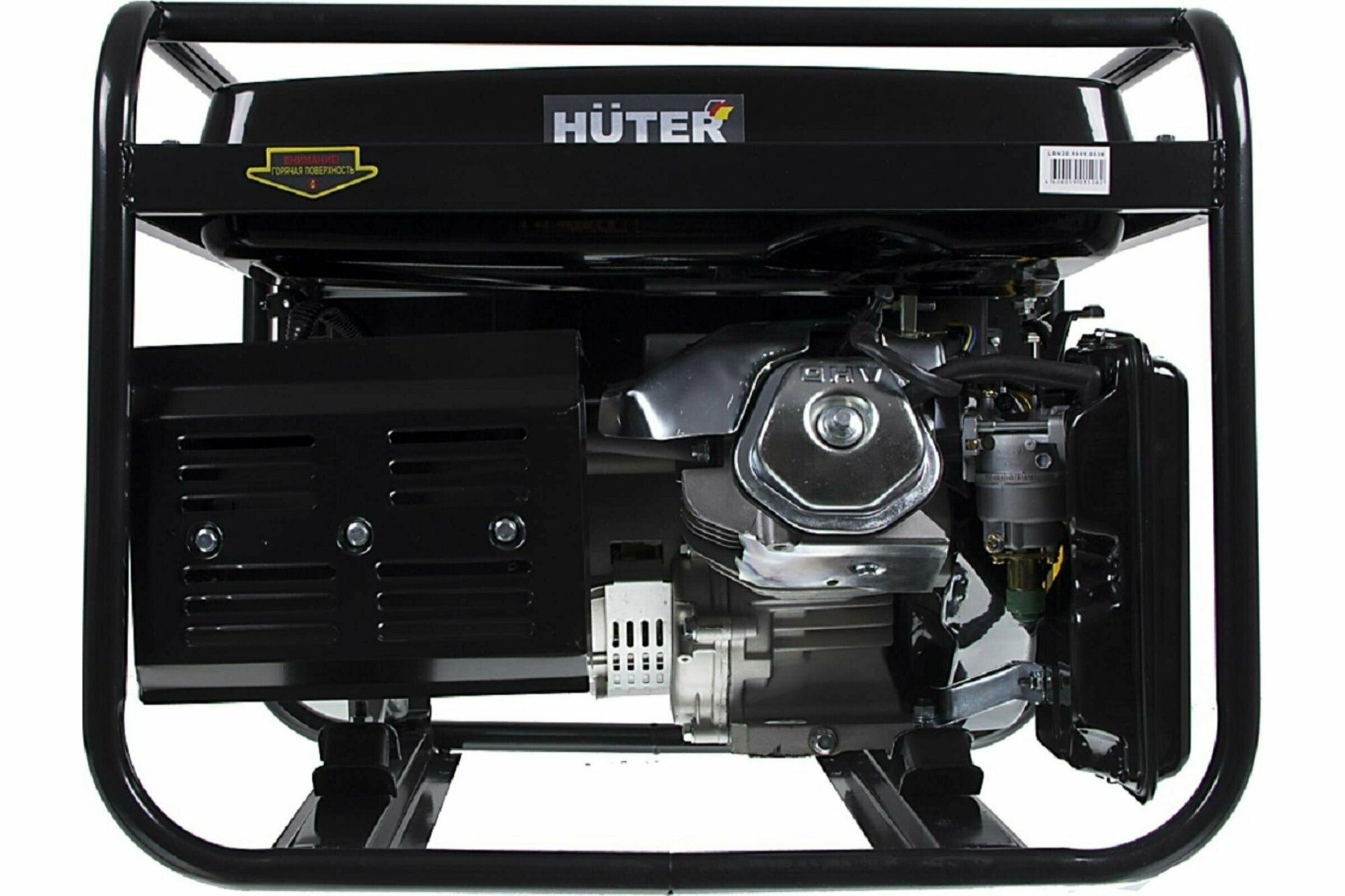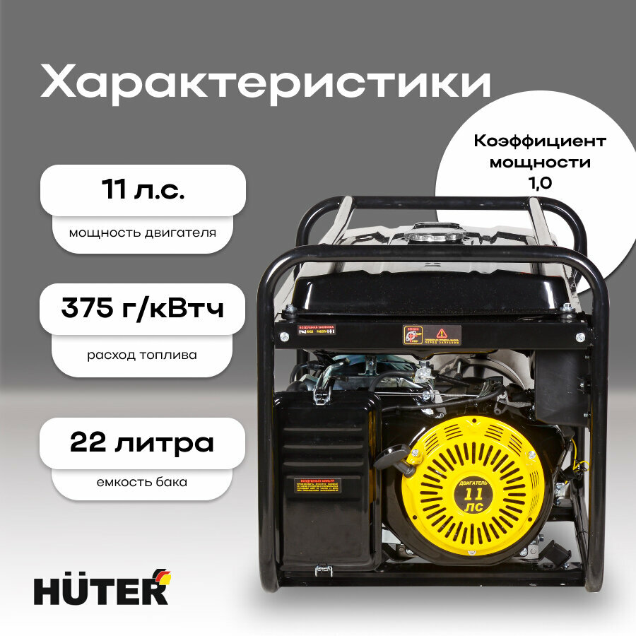 Под баком смонтированы основные рабочие агрегаты – двигатель модели Huter 182F и генераторная машина. Двигатель на данной установке применен внутреннего сгорания четырехтактный поршневой одноцилиндровый с воздушным охлаждением, верхним расположением клапанов и нижним распредвалом. Он вырабатывает 11 л. с. мощности, потребляя, в среднем, 1,5 л бензина в час. Запуск осуществляется при помощи ручного стартера. Система смазки двигателя принудительная и работает за счет разбрызгивания масла из картера по внутренним деталям. У данной модели есть автоматический контроль над количеством масла в картере. При падении его уровня ниже критического значения произойдет автоматическая остановка двигателя, что оградит его от работы при плохой смазке и предотвратит поломку. В оснащении двигателя имеются, так же, воздушный фильтр, глушитель и счетчик моточасов. Этот счетчик позволяет контролировать общее время работы установки, что дает возможность вовремя проводить необходимые профилактические мероприятия.