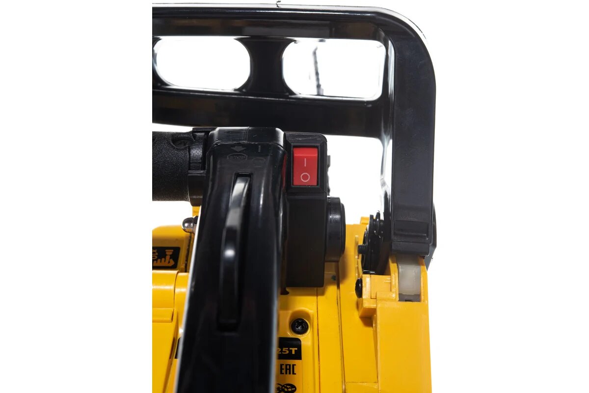 Для повышения безопасности в данной модели предусмотрены цепной тормоз для мгновенной остановки цепи при отскоке, который также является щитком для зашиты руки оператора, также уловитель цепи, исключающий травмы при её обрыве.