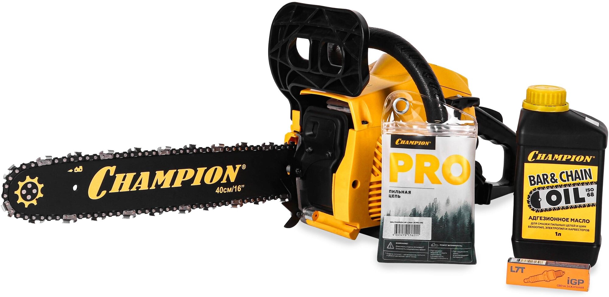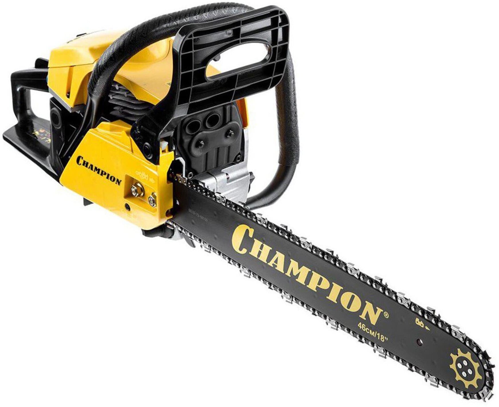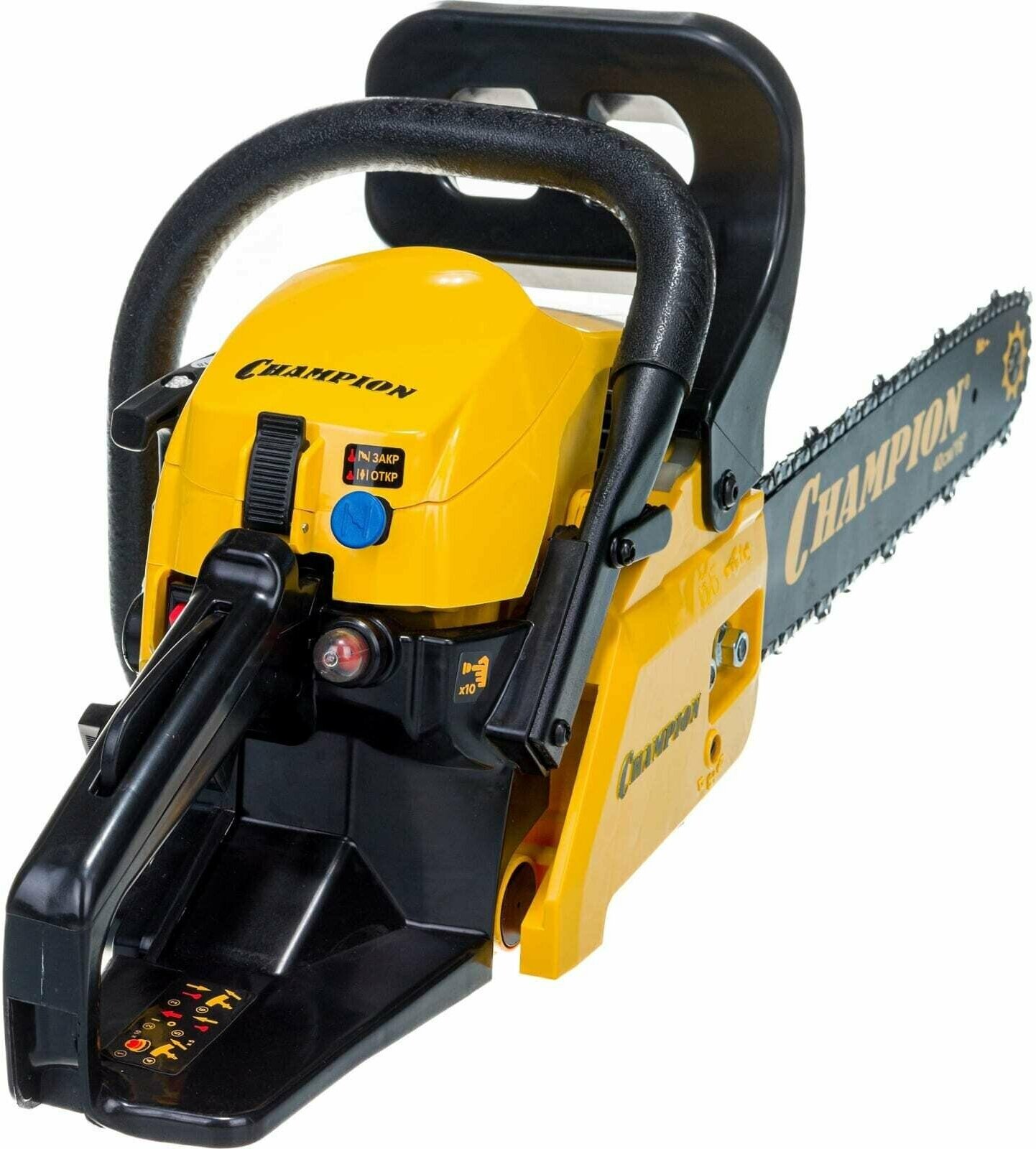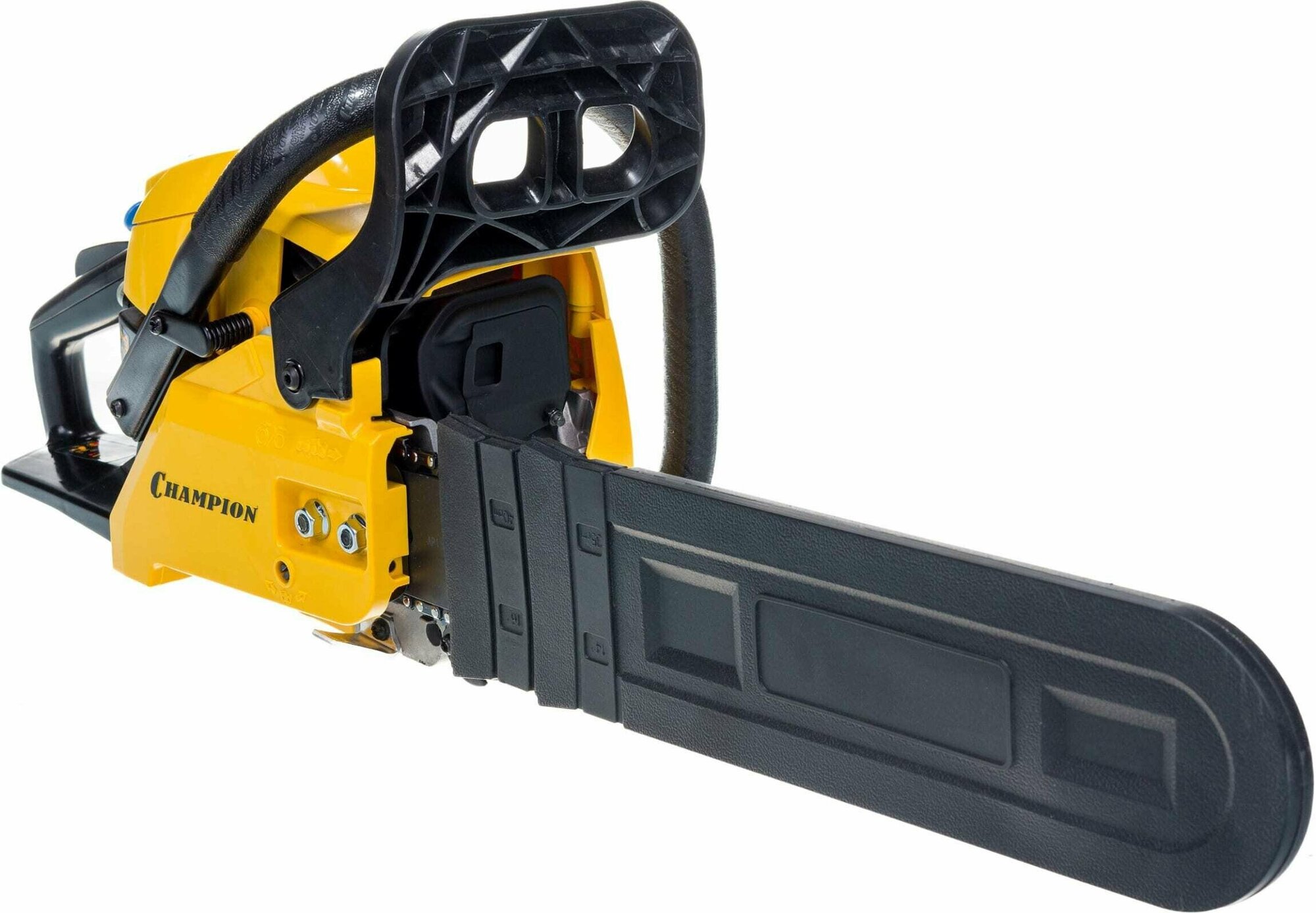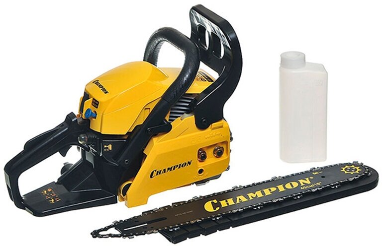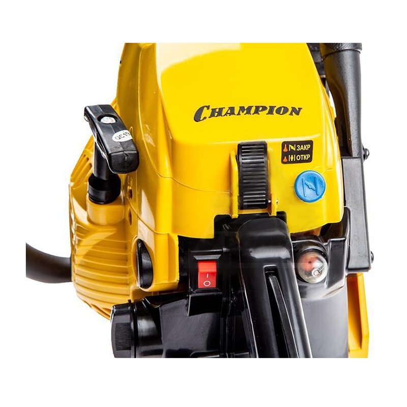 Бензопила Champion 237-16 оборудована центробежным тормозом цепи, останавливающим вращение при откидывании пилы на оператора, а так же стальным цепеуловителем, предохраняющим при обрыве цепи. Воздушный фильтр и свеча находятся под верхней пластиковой заглушкой и доступ к ним максимально упрощен. Бензопила Champion 237-16 – прекрасно справиться не только с распилкой дров и проряжанием крон деревьев, но и поможет спилить ненужное дерево на вашем участке.
