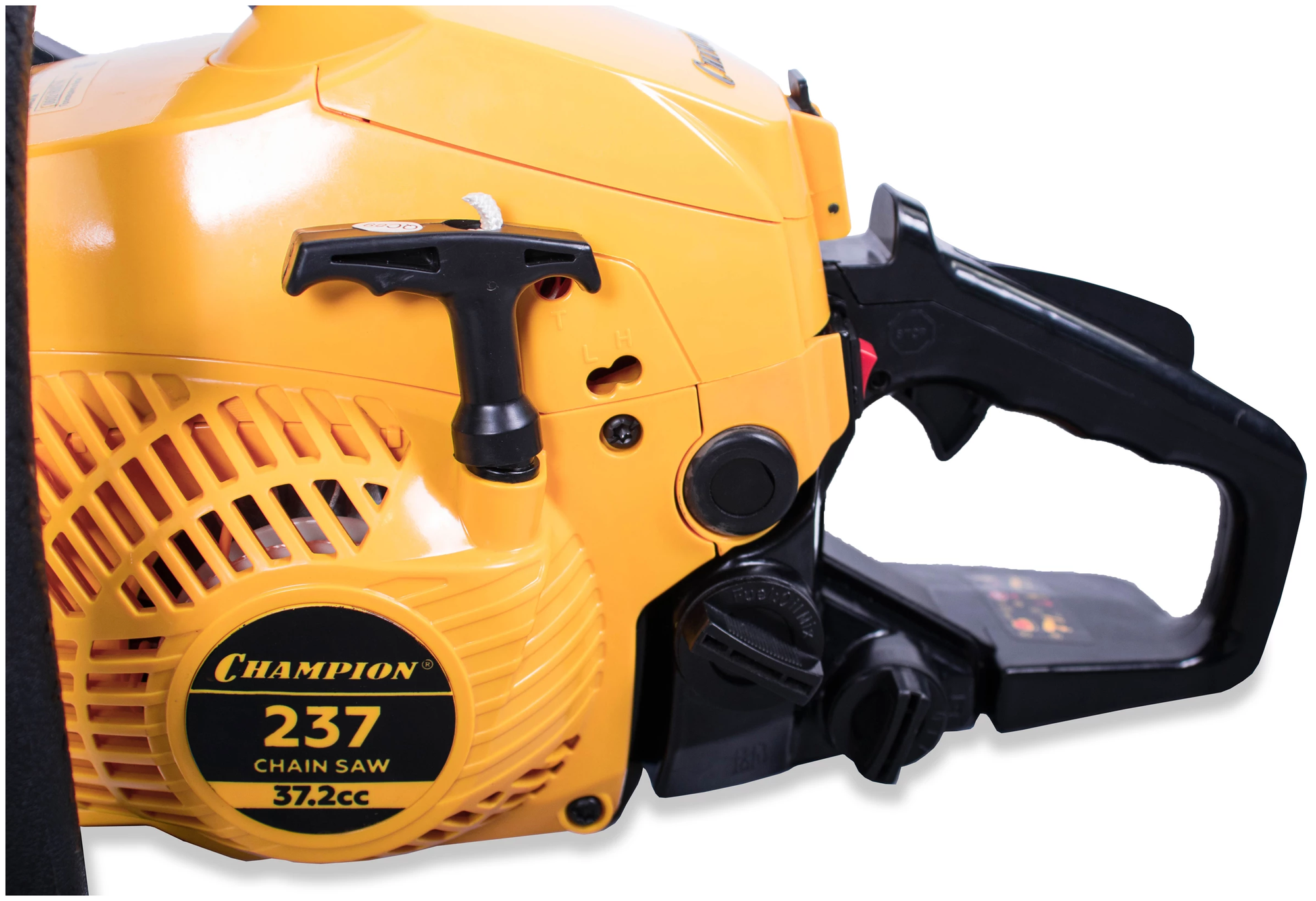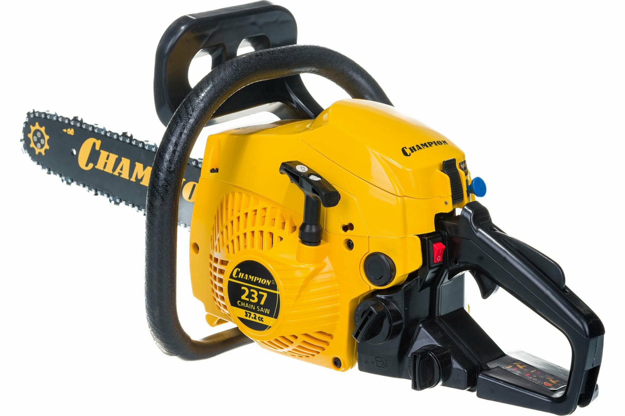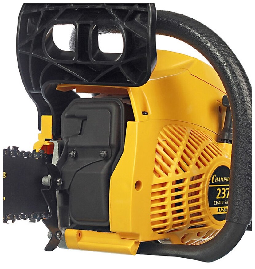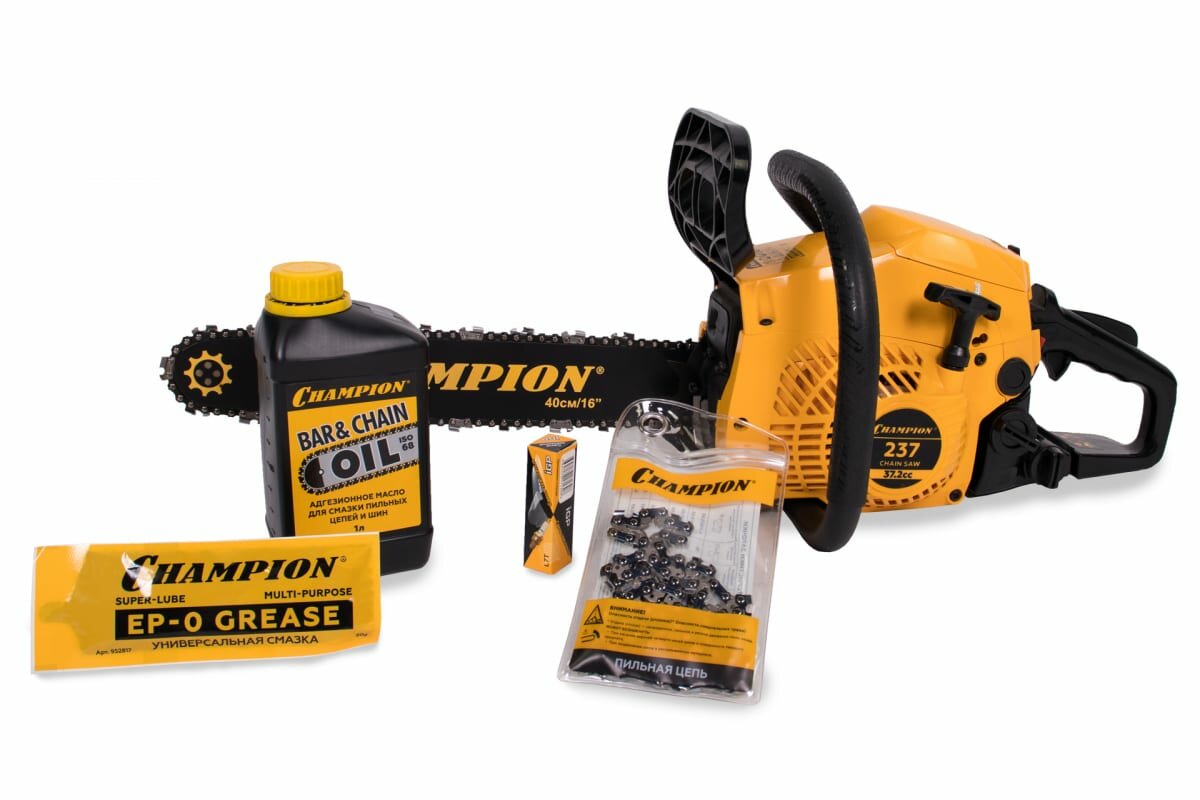 Бензопила Champion 237-16 имеет систему легкого запуска и трех диапазонную воздушную заслонку, позволяющую упростить запуск холодного двигателя. В комплект пилы входит пильная шина длинной 40 см. с четырёхточечным креплением ведомой звездочки и самая распространённая пильная цепь с шагом 3/8 дюйма и 56 звеньями. Скольжение цепи по шине производится посредством специального насоса подающего масло для смазки из резервуара емкостью 210 гр.