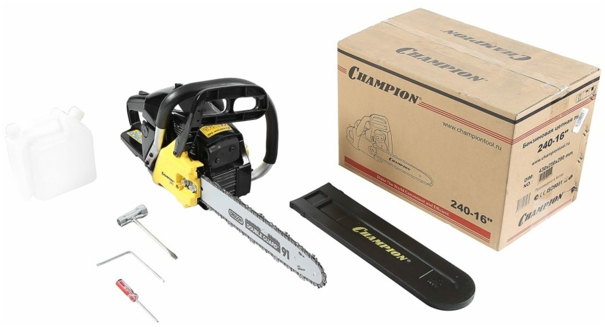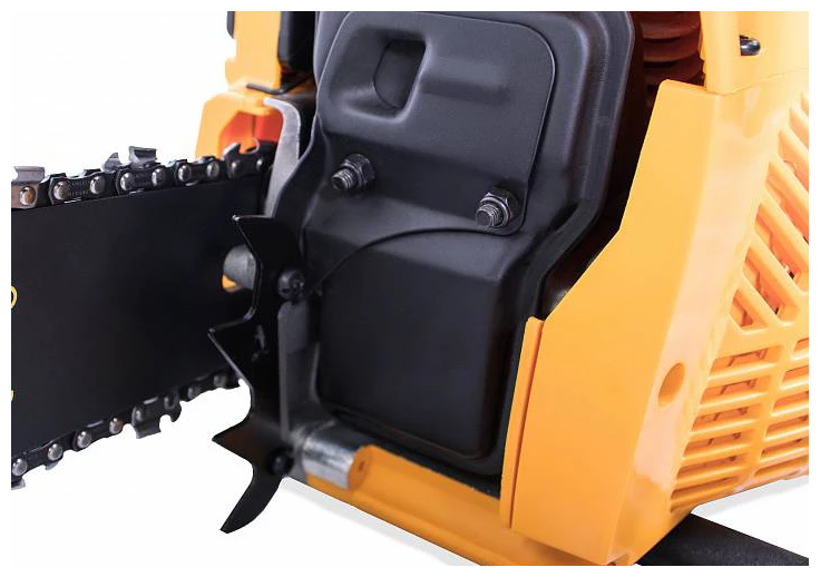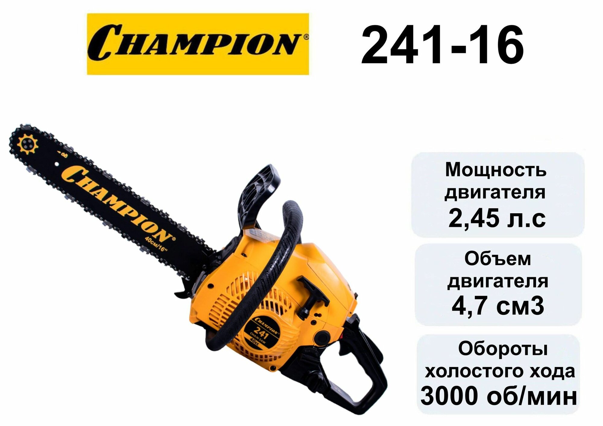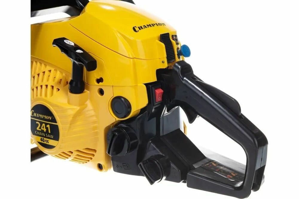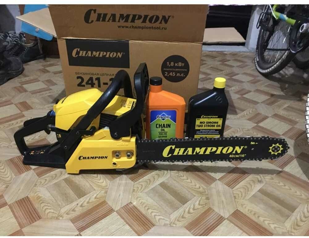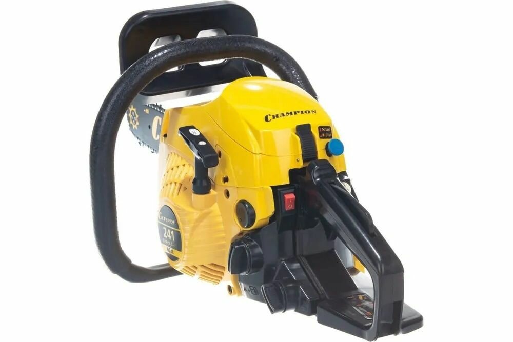 Мощность пилы составляет 2,45 лошадиных сил, а сам двигатель изготовлен с хорошими допусками, благодаря чему относится к классу ЕВРО-3 и использует топливную смесь с минимальным количеством двухтактного масла (50:1), всего 20 грамм на 1 литр бензина, как у европейских и американских брендовых пил. Бензопила Champion 241-16 поставляется со стандартной пильной цепью шагом 3/8 дюйма. Натяжка цепи производится посредством стальной натяжной рейки, ключом, поставляемым в комплекте пилы, а прижим пильного полотна производится двумя стальными гайками. Такая конструкция менее удобная, чем новомодные системы упрощенной натяжки, но более надежная и долговечная.