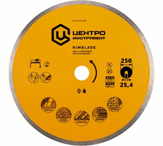 Алмазный ультратонкий диск сплошной для керамики и керамогранита для электрических плиткорезов Изготовлен по технологии горячего прессования под высоким давлением Формула "ULTRAFINE" для плавной и точной резки без сколов по разметке Rimblade (сплошная кромка) Для прямолинейного раскроя различных видов керамической плитки, керамической черепицы, керамогранита, фарфора, клинкерной плитки, в том числе рельефных Мокрый рез Наружный диаметр 250 мм Посадочный диаметр 25,4 мм Толщина диска 1,6 мм Толщина режущей кромки 2 мм Высота режущей кромки 8 мм Предельная рабочая скорость 80 м/с Предельная частота вращения 6100 об/мин
