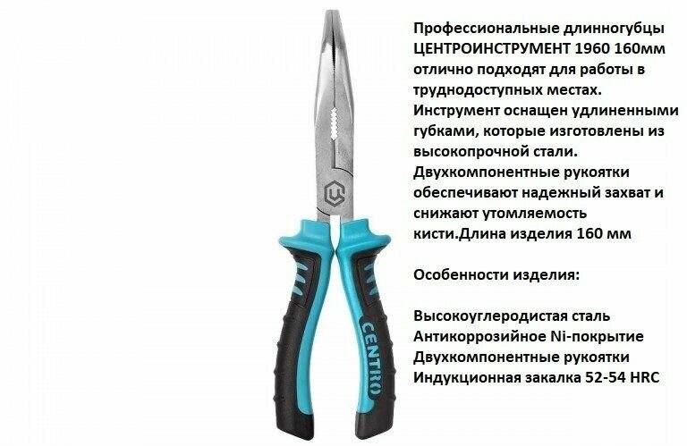 Профессиональные длинногубцы центроинструмент 1960 160мм отлично подходят для работы в труднодоступных местах. Инструмент оснащен удлиненными губками, которые изготовлены из высокопрочной стали. Двухкомпонентные рукоятки обеспечивают надежный захват и снижают утомляемость кисти.Длина изделия 160 мм