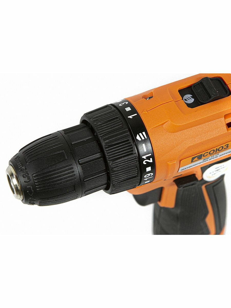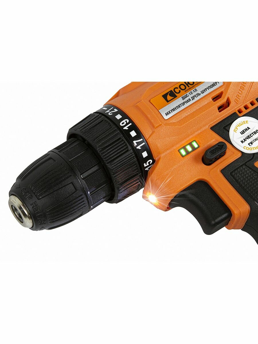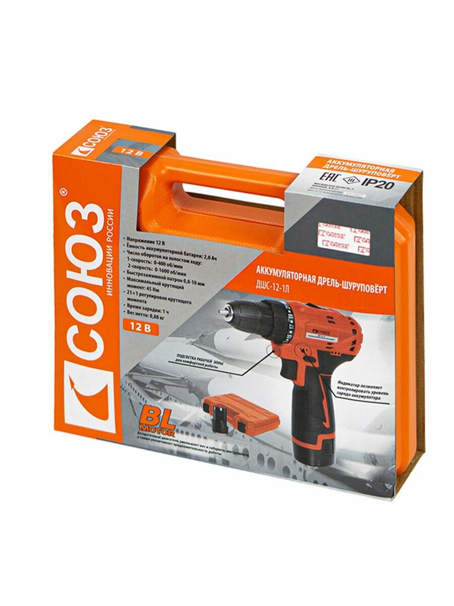 Аккумуляторная дрель-шуруповерт Союз "ДШС-12-1Л" комплектуется надежным литий-ионным аккумулятором напряжением 12 В. С помощью инструмента можно сверлить отверстия в металле и дереве, работать с крепежными элементами. Можно легко заменить рабочую оснастку благодаря быстрозажимному патрону. Реверсивный механизм предназначен для быстрого изъятия сверла из материала в случае застревания и выкручивания или ослабления крепежа. 22 ступени крутящего момента позволяют настроить инструмент под определённую толщину материала. Встроенная светодиодная подсветка эффективно освещает рабочую область направленным симметричным лучом. Корпус с улучшенной защитой от пыли и влаги выполнен из ударопрочного нейлона с резиновыми антивибрационными вставками. Кейс, 2 аккумулятора, зарядное устройство в комплекте. Максимальный крутящий момент: 45 Нм Частота вращения шпинделя: 0-400/0-1600 об/мин Диаметр сверления (дерево/металл): 20/10 мм Число ступеней регулировки: 21+1 Диаметр патрона: 0.8-10 мм Тип патрона: быстрозажимной Кол-во скоростей: 2 Тип аккумулятора: литий-ионный Емкость аккумулятора: 2 А·ч Напряжение аккумулятора: 12 В Кол-во аккумуляторов в комплекте: 2 Реверс: есть Масса нетто: 1 кг Упаковка: пластиковый кейс Гарантия: 14 месяцев Производитель: Россия Сборка: КНР Артикул: ДШС-12-1Л