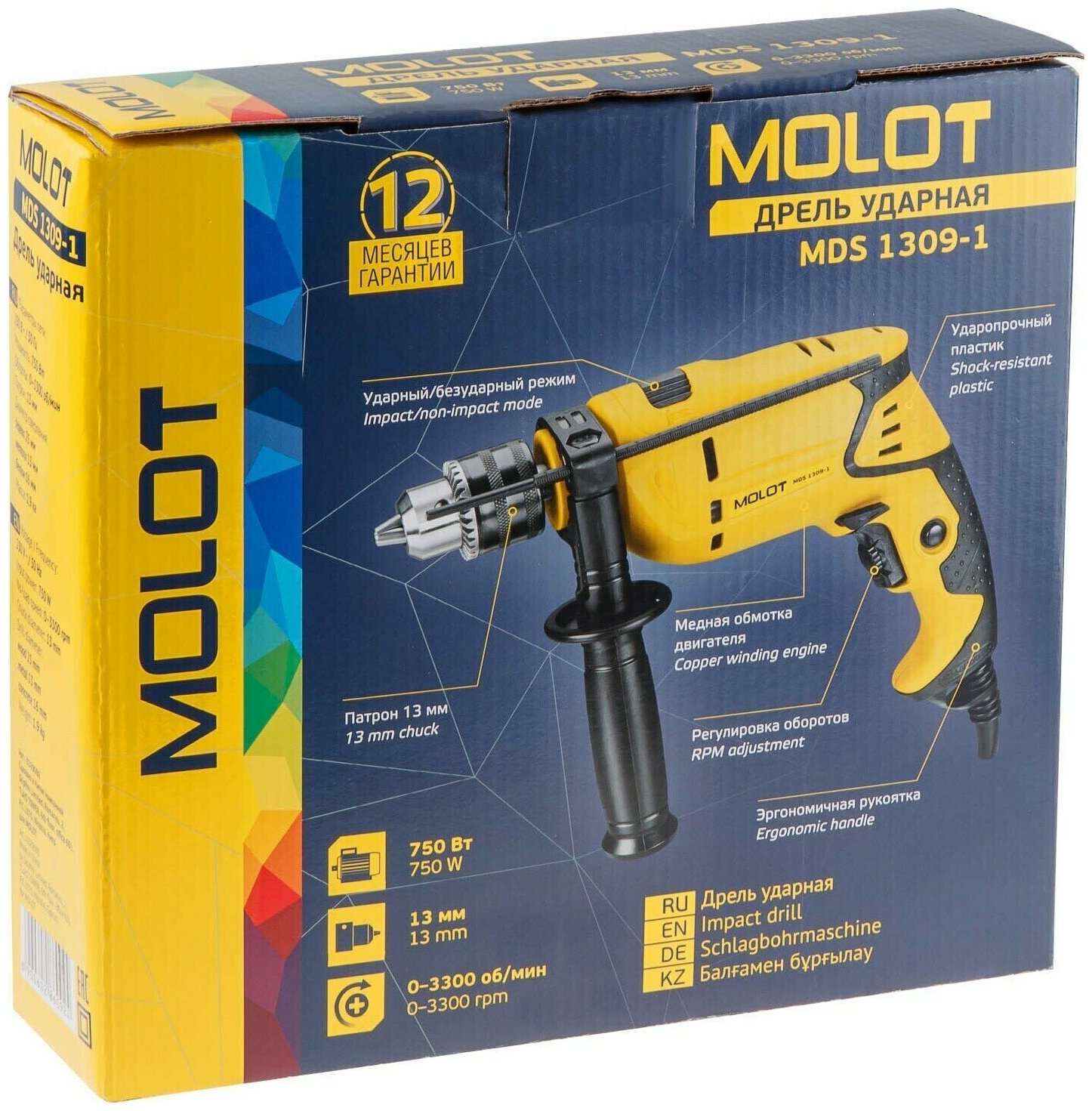 --- Дрель имеет эргономичный дизайн, дополнительная рукоятка обеспечивает надежный захват. Оснащена металлическим сверлильным патроном, дополнительно имеется регулировка скорости, ограничитель глубины, реверс и блокировка кнопки включения. --- Технические характеристики: Питание: Сеть Напряжение, В: 230 Частота, Гц: 50 Мощность (потребляемая), Вт: 800 Обороты (число), об/мин: 0-3000Тип патрона: ключевой Диаметр патрона, мм: 13 Макс. диаметр сверла при сверлении бетона, мм: 16 Макс. диаметр сверла при сверлении дерева, мм: 25 Макс. диаметр сверла при сверлении стали, мм: 13 Вес нетто, кг: 1,8 Упаковка: картонная коробка --- Комплектация: - ограничитель глубины сверления - дполнительная рукоятка - ключ - комплект щеток - паспорт --- Совместимые товары: WDBS4010C10511 Набор сверл по бет. 5шт (4-5-6-8-10 мм) WORTEX WDBS4010W10511 Набор сверл по дер. 5 шт (4-5-6-8-10 мм) WORTEX WDBS3010W10811 Набор сверл по дер. 8 шт (3-10 мм) WORTEX WDBS2008M10611 Набор сверл по мет. 6шт (2-3-4-5-6-8 мм) HSS WORTEX WDBS000U11614 Набор сверл универсальный 16 шт. WORTEX --- Гарантийный срок - 12 месяцев.
