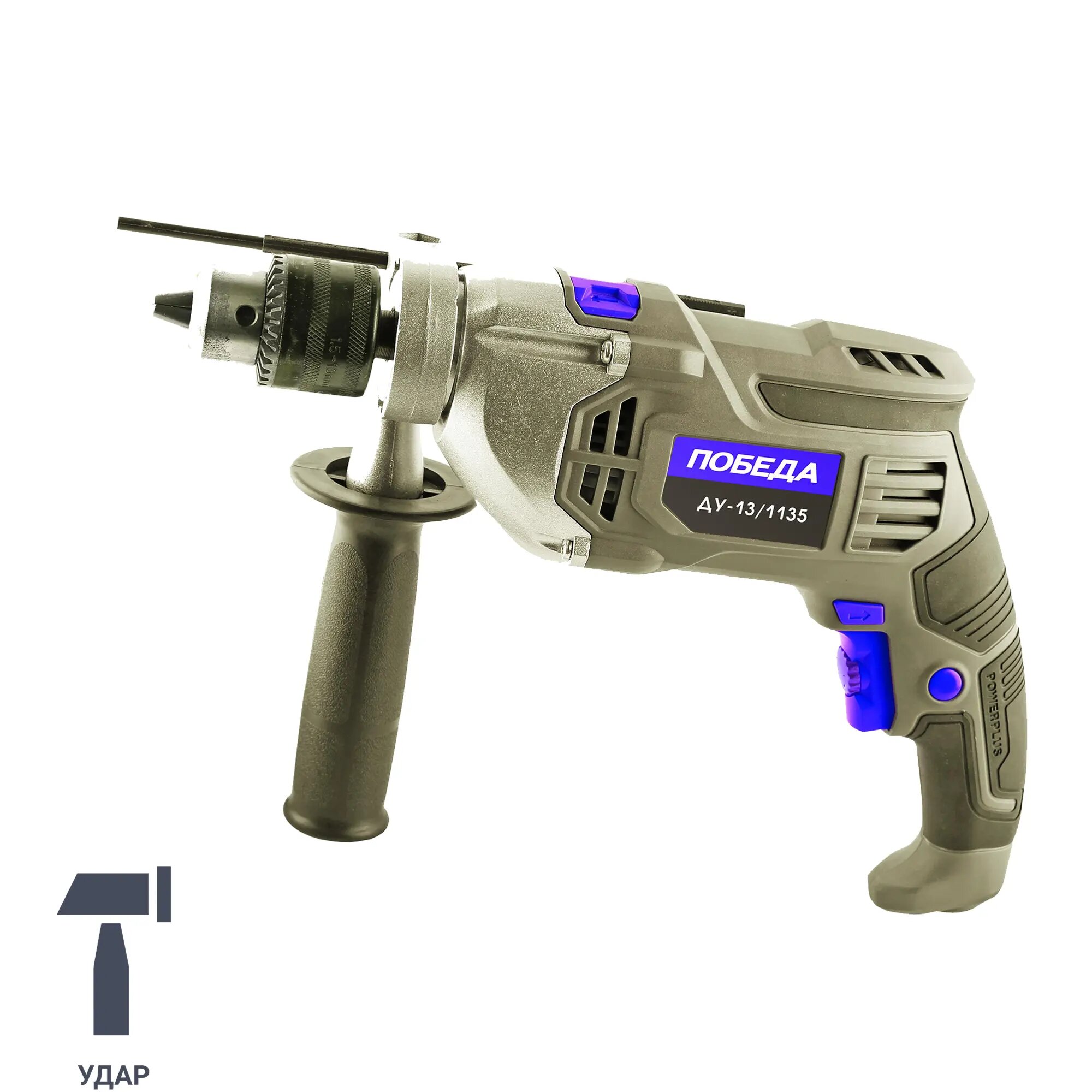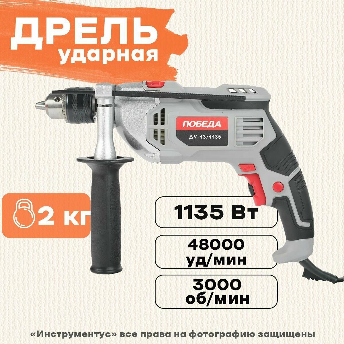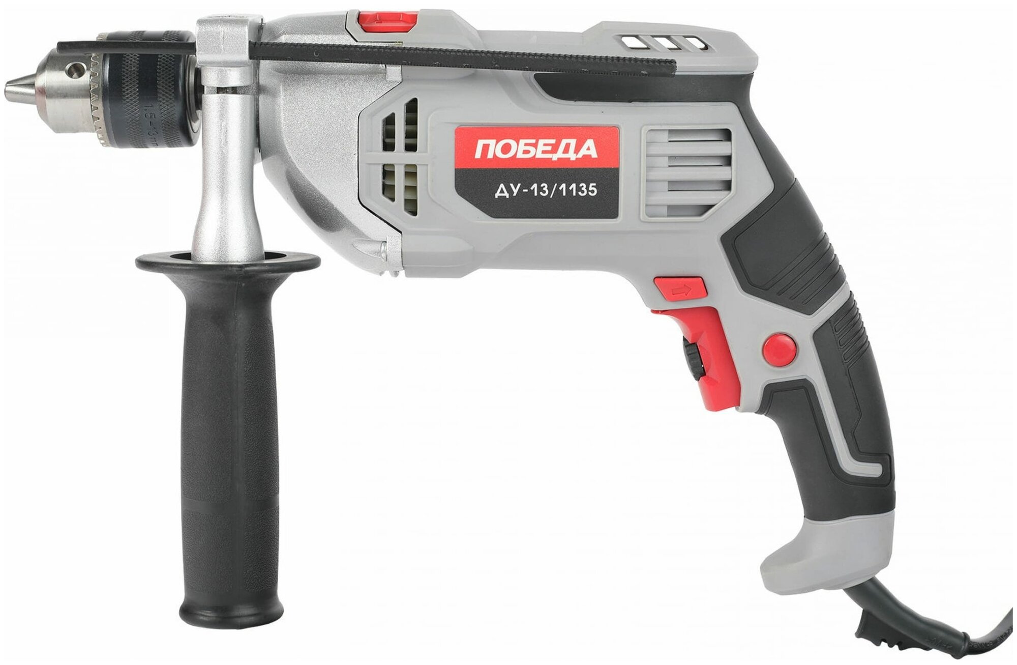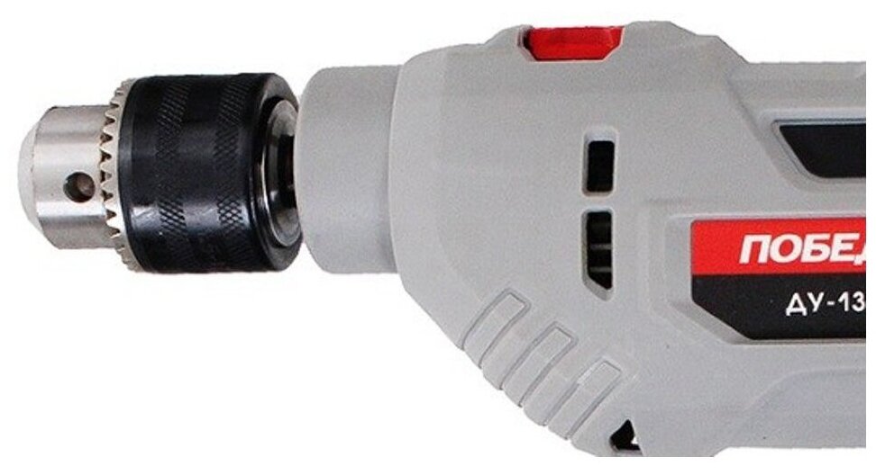 Ударная дрель победа ДУ-13/1135 120301135 предназначен для строительных и ремонтных работ. Долгий срок службы. Металлический корпус надежно защищает механизм от внешних ударов и хорошо отводит тепло. Ключевой патрон. Обеспечивает надежную фиксацию рабочих насадок и рассчитан на интенсивную эксплуатацию. Регулировка частоты вращения для настройки под нужный материал Удобная рукоятка для комфортной работы Реверс позволяет изменять направление вращения Ударный механизм облегчит сверления бетона и кирпичной кладки Ключевой патрон - для надежной фиксации оснастки Дополнительная рукоятка для надежного удержания инструмента Прорезиненный морозостойкий кабель для работы при низких температурах Металлический корпус для долгого срока службы Характеристики: Мощность: 1135 Вт Тип патрона: ключевой Крепление патрона: 1/2 Число скоростей: 1 Регулировка оборотов: да Наличие удара: да Наличие подсветки: нет Наличие реверса: да Max диаметр сверления (металл): 16 мм Мах диаметр сверления (дерево): 25 мм Мах диаметр сверления (кирпич): 13 мм Мах диаметр сверления (бетон): 16 мм Длина кабеля: 1.8 м Поддержание постоянных оборотов под нагрузкой: нет Max размер патрона: 13 мм Комплектация: коробка Частота вращения шпинделя: 0-3000 об/мин Частота ударов: 48000 уд/мин Плавный пуск: нет Легкий доступ к щеткам: нет Индикатор износа щеток: нет Морозоустойчивый кабель: да Автоматически отключающийся при износе щетки: нет Вес: 2.305 кг Комплектация: Дрель Ограничитель глубины сверления Коробка