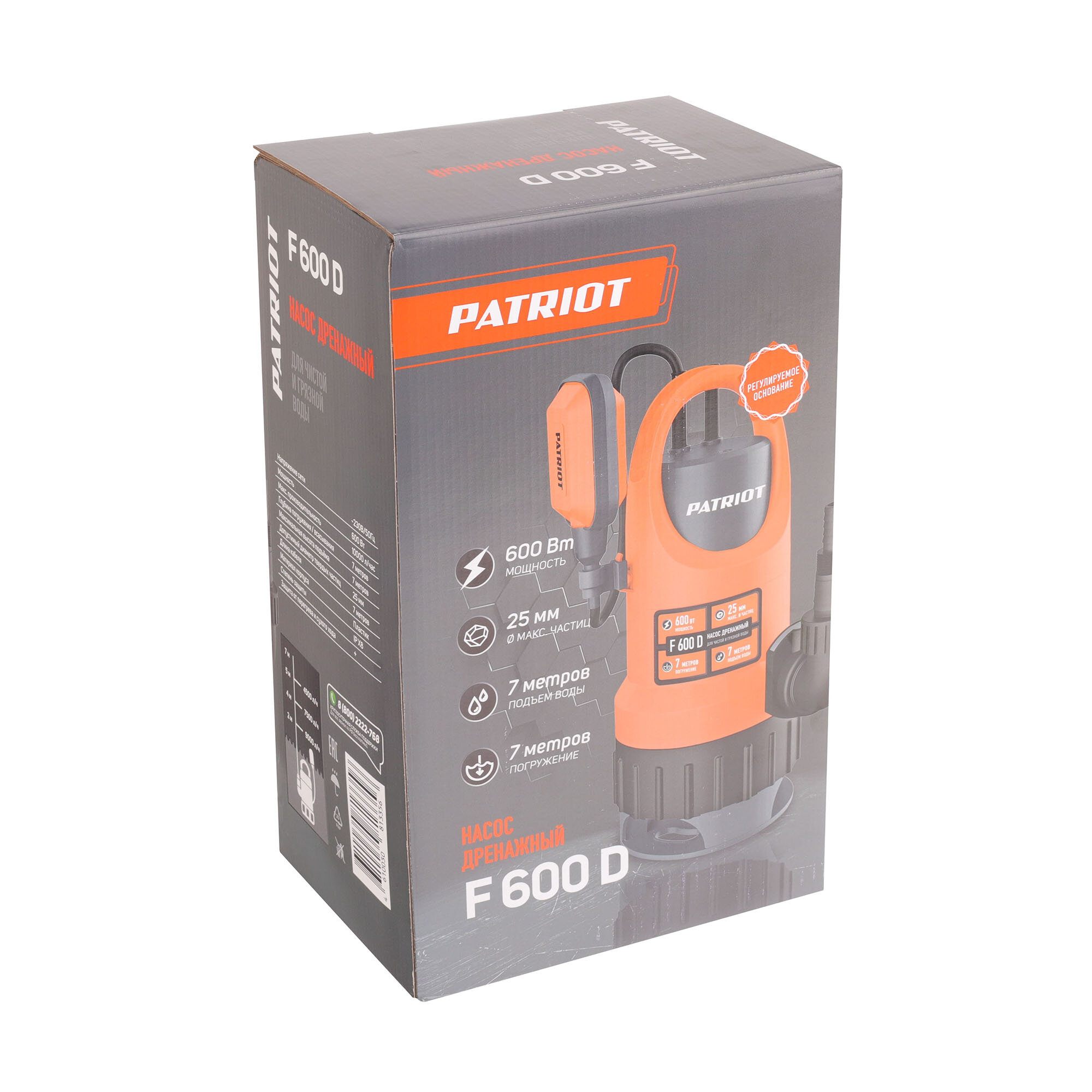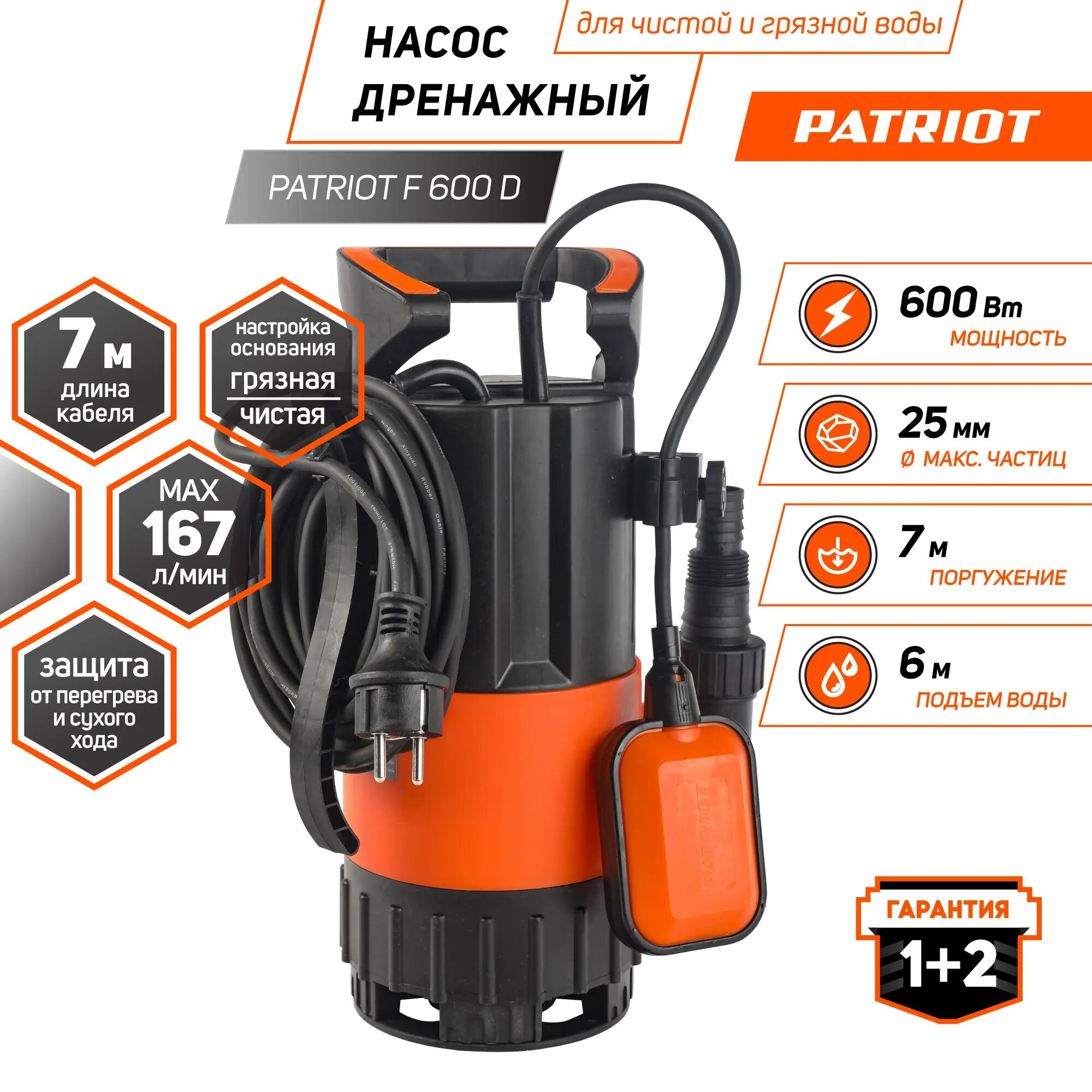 Производительность, л/час - 10000 Макс. напор, м - 6 Глубина погружения / всасывания, м - 7 Мощность двигателя, кВт - 0,6 Длина кабеля, м - 7 Допустимый диаметр твердых частиц, мм - 25 Материал корпуса - пластик Защиты от перегрева - Да Соединитель в комплекте - елочка 1; елочка 1 1/4; елочка 1 1/2 Качество воды - чистая/грязная Защита от сухого хода - Да