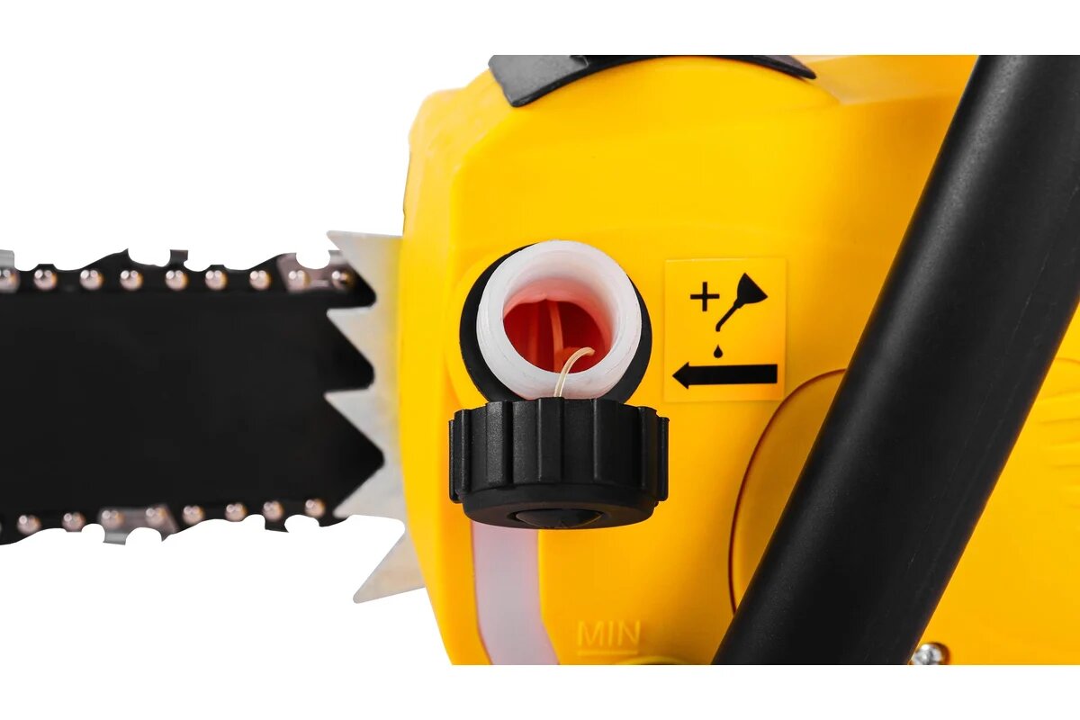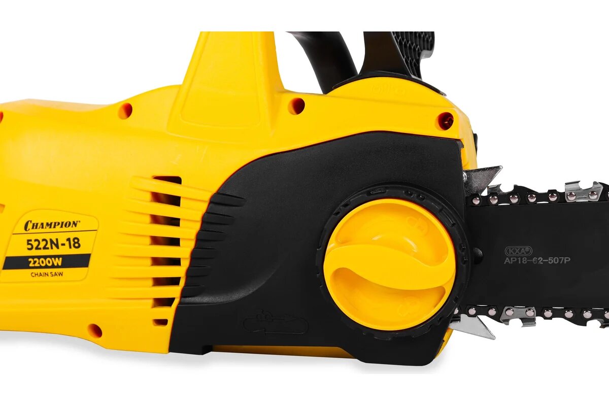 Электрическая пила Champion 522N-18 оснащена продольно расположенным двигателем мощностью 2.2 кВт. Заливная горловина масляного бака расположена под углом, что облегчает заправку пилы адгезионным маслом, а крышку в открученном состоянии удерживает страховочный поводок для защиты от утери. Крышка шины оснащена бесключевым натяжителем цепи, не требующим использования инструмента.