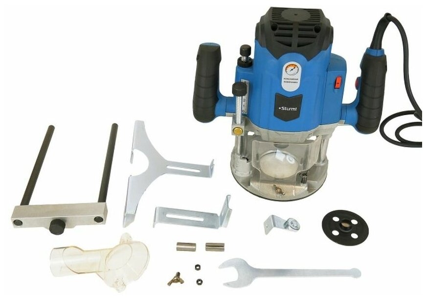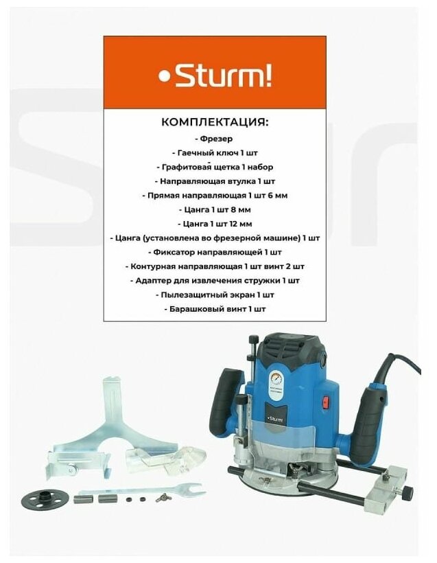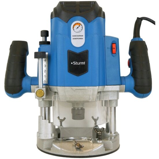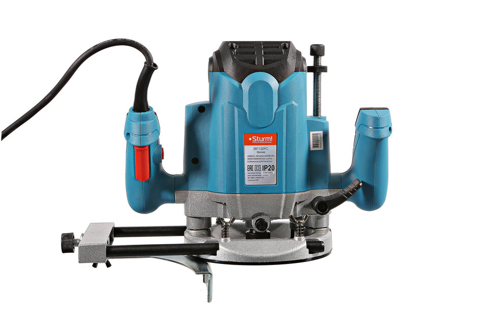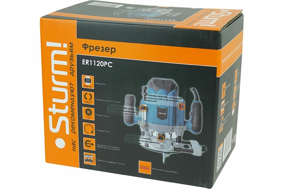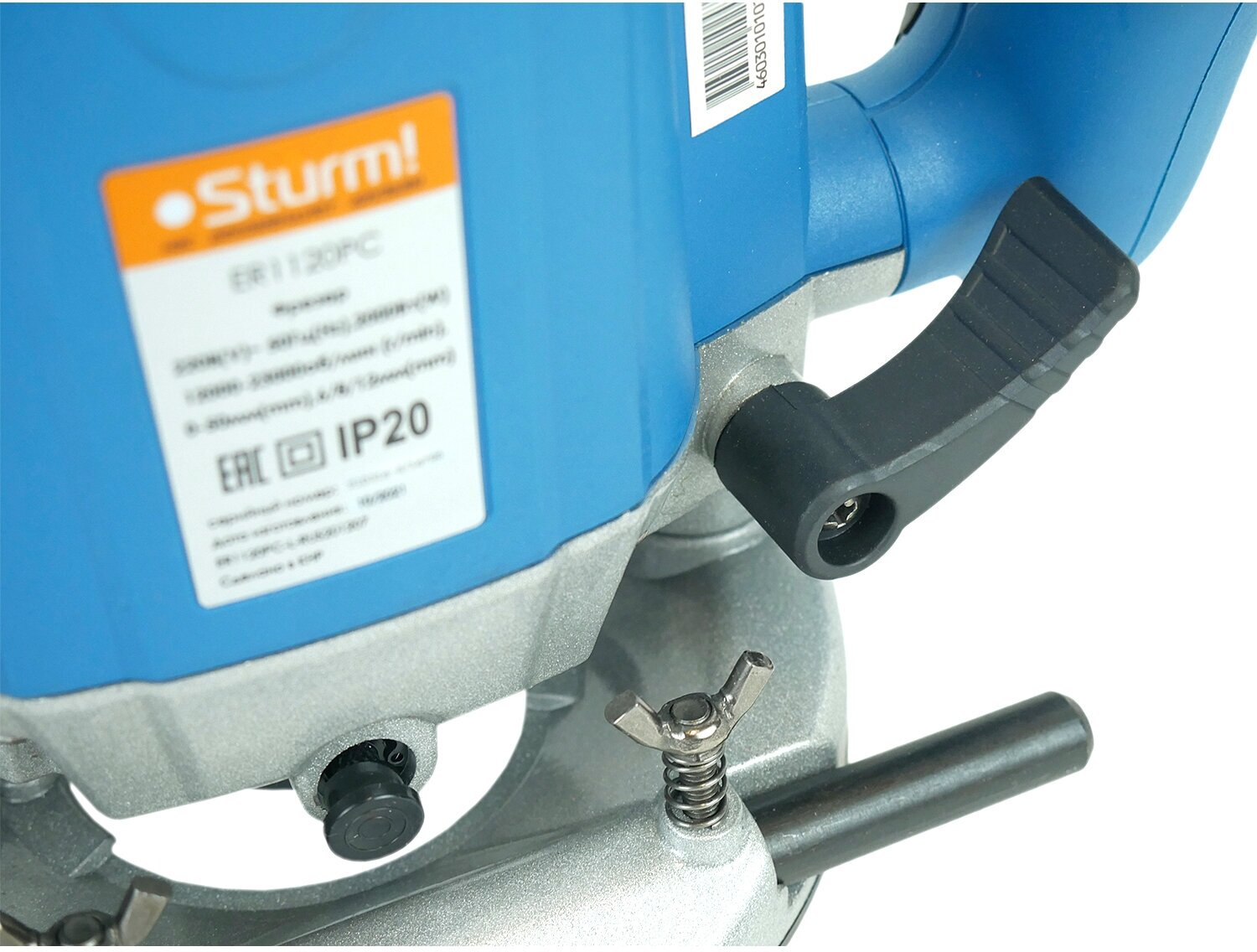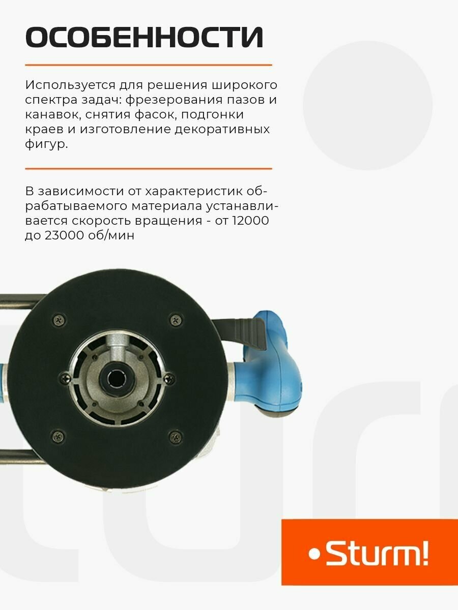 Фрезер Sturm ER1120PC – высокоэффективный инструмент, рассчитанный на интенсивную эксплуатацию в условиях профессиональных работ по обработке древесины. Используется для решения широкого спектра задач: фрезерования пазов и канавок, снятия фасок, подгонки краев и изготовление декоративных фигур. В зависимости от характеристик обрабатываемого материала устанавливается скорость вращения – от 12000 до 23000 об/мин. Мощный электродвигатель 2000 Вт позволяет обрабатывать заготовки из пород деревьев различной твердости. Удобные прорезиненные рукоятки обеспечивают хорошую управляемость и контроль за процессом обработки. Для повышения надежности и продления срока жизни инструмента в механизме установлены качественные подшипники NSK (Япония), установлены система плавного пуска и система поддержания оборотов под нагрузкой. Для безопасности пользователя установлен прозрачный защитный щиток. Технические характеристики Sturm ER1120PC Мощность, Вт От мощности фрезера зависит его максимально возможная производительность, т. е. скорость механической обработки. Чем чаще предполагается использовать фрезер и чем масштабнее предстоят работы, тем более мощная машина потребуется. Однако не забывайте, что более мощная модель массивнее и менее удобна для мобильных мелких работ. Для любительских мастерских чаще всего достаточно фрезера мощностью до 0,75-1 кВт. 2000 Размер цанги, мм Цанга — приспособление для крепления фрезы. Представляет собой пружинящую втулку с осевыми прорезями. Размер цанги определяет диаметр хвостовика оснастки, которая может использоваться в данном инструменте. Наиболее используемыми диаметрами хвостовиков являются следующие: 6 мм, 1/4" (6,35 мм), 8 мм, 3/8" (9,53 мм) — применяются в легких и средних моделях фрезеров, а также 10 мм, 12 мм, 1/2" (12,7 мм) - предназначены для самого тяжелого и мощного инструмента. 6; 8; 12 Мах размер цанги, мм 12 Регулировка оборотов Наличие регулировки частоты оборотов фрезы позволяет оптимально настроить инструмент для работы с материалами различной плотности (дерево разных пород, пластик, цветные металлы). Например, для фрезеровки пластиковых деталей понадобится существенно снизить частоту вращения фрезы для исключения оплавления материала. да Плавный пуск Наличие плавного пуска — существенная характеристика фрезера. Во-первых, наличие данной опции позволяет инструменту начать работу плавно, без рывка, что сделает работу более безопасной и комфортной. Во-вторых, система плавного пуска понижает пусковой ток до 16 А, то есть подключение фрезера к электросети не приведет к возникновению перегрузок в ней. да Поддержание постоянных оборотов под нагрузкой При увеличении нагрузки на фрезер, обороты, как правило, падают. Во избежание этого, некоторые модели фрезеров оснащаются электронной системой поддержания постоянных оборотов. Эта система контролирует скорость вращения