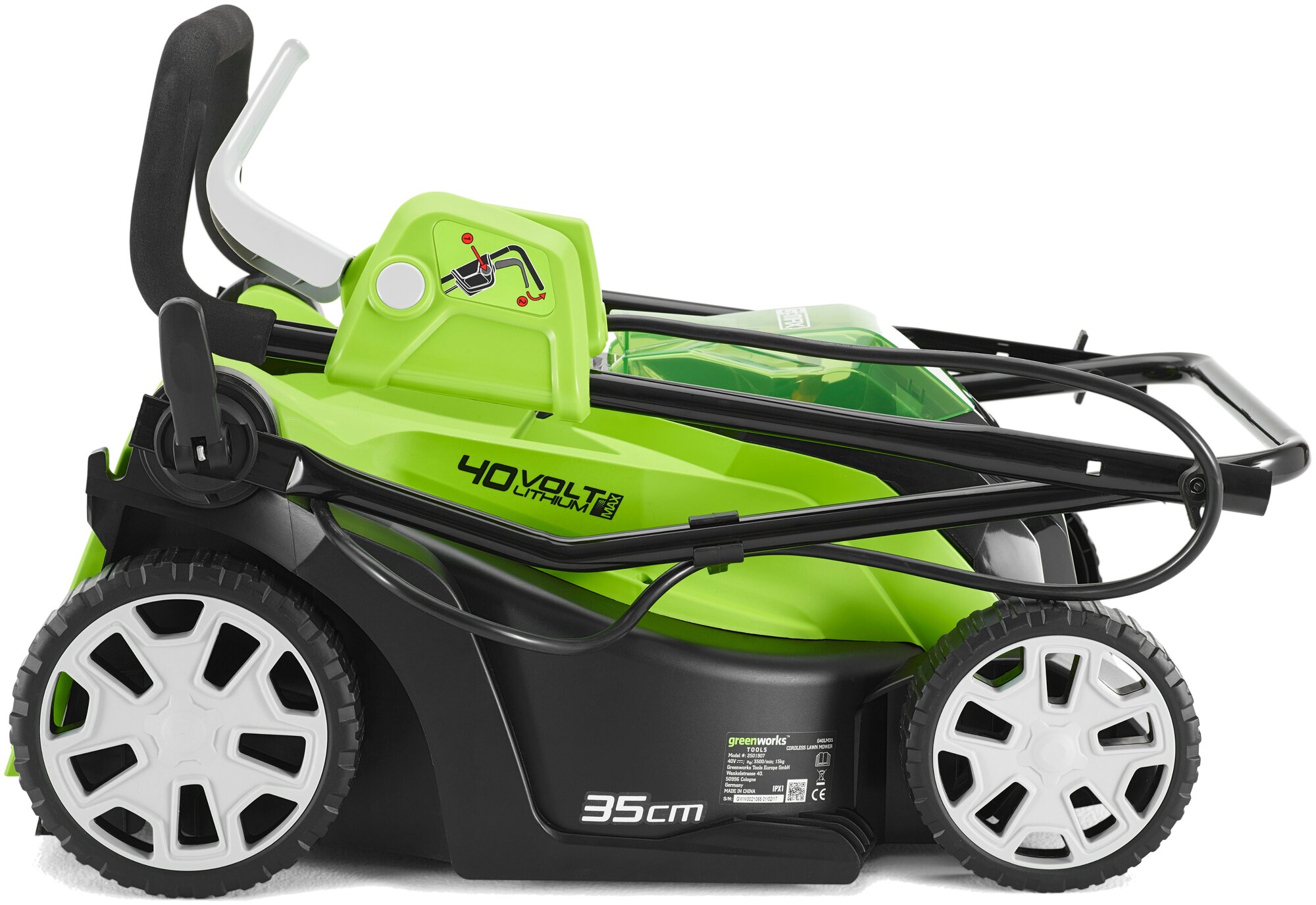 Рукоятку аккумуляторной газонокосилки Greenworks G40LM35 можно складывать для удобства хранения.