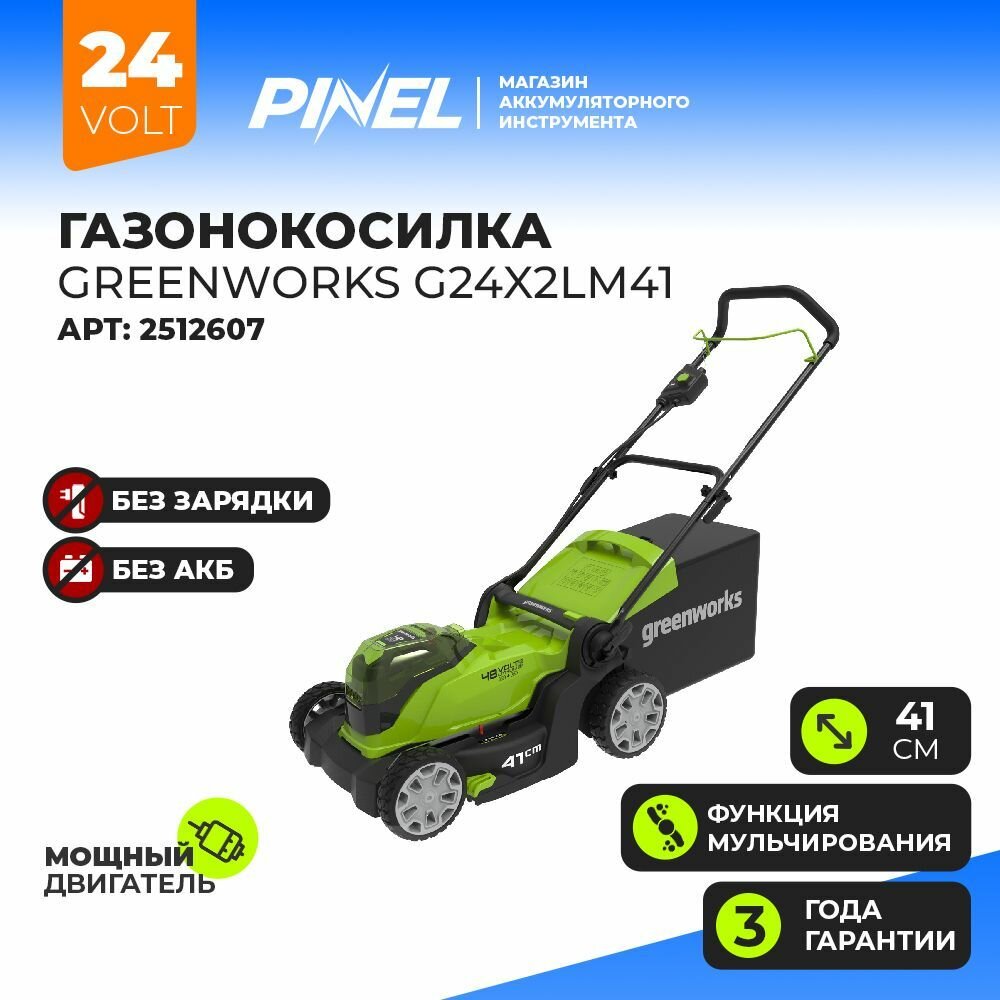 Газонокосилка аккумуляторная G-MAX 24V GREENWORKS G24X2LM41 - универсальная газонокосилка, предназначенная для использования на малых и средних садовых участках. Батарееприемник газонокосилки вмещает две аккумуляторные батареи 24В, что позволяет увеличить время её работы. Являясь частью продуктовой линейки 24В, аккумуляторная батарея может использоваться с любым другим устройством данного вольтажа , что делает работу еще более комфортной и удобной.