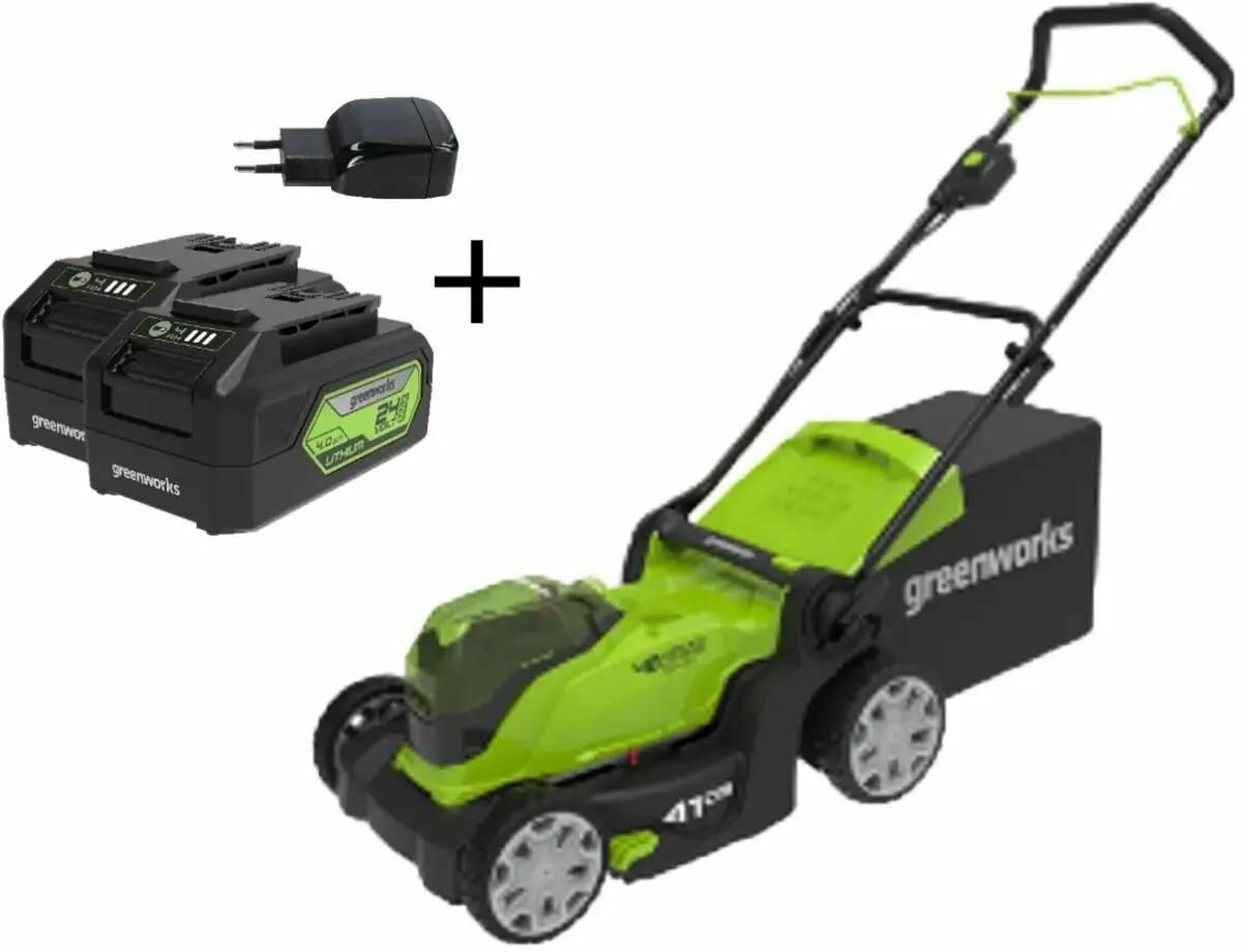 Новое инновационное решение от Greenworks позволяет устанавливать в батарееприемник газонокосилки одновременно два аккумулятора. Преимуществом такого решения является более продолжительное время кошения газонокосилки, а также возможность использования имеющихся в наличии аккумуляторных батарей 24В с другими устройствами продуктовой линейки 24В, включая триммеры, кусторезы, цепные пилы и ручные электроинструменты.