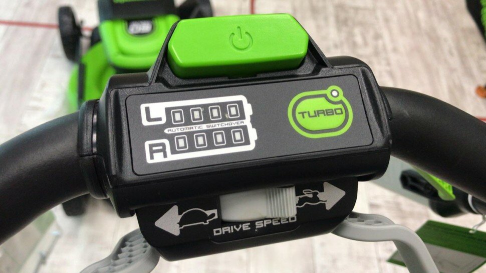 Самоходная газонокосилка с регулируемой скоростью 2,5–4,9 км/ч. Ширина кошения 51 см подходит для больших участков. Имеет 3 режима работы: сбор в травосборник, мульчирование или боковой выброс. Функция Switchover обеспечивает непрерывную работу: при разрядке первого аккумулятора автоматически включается второй (установка двух батарей необязательна).