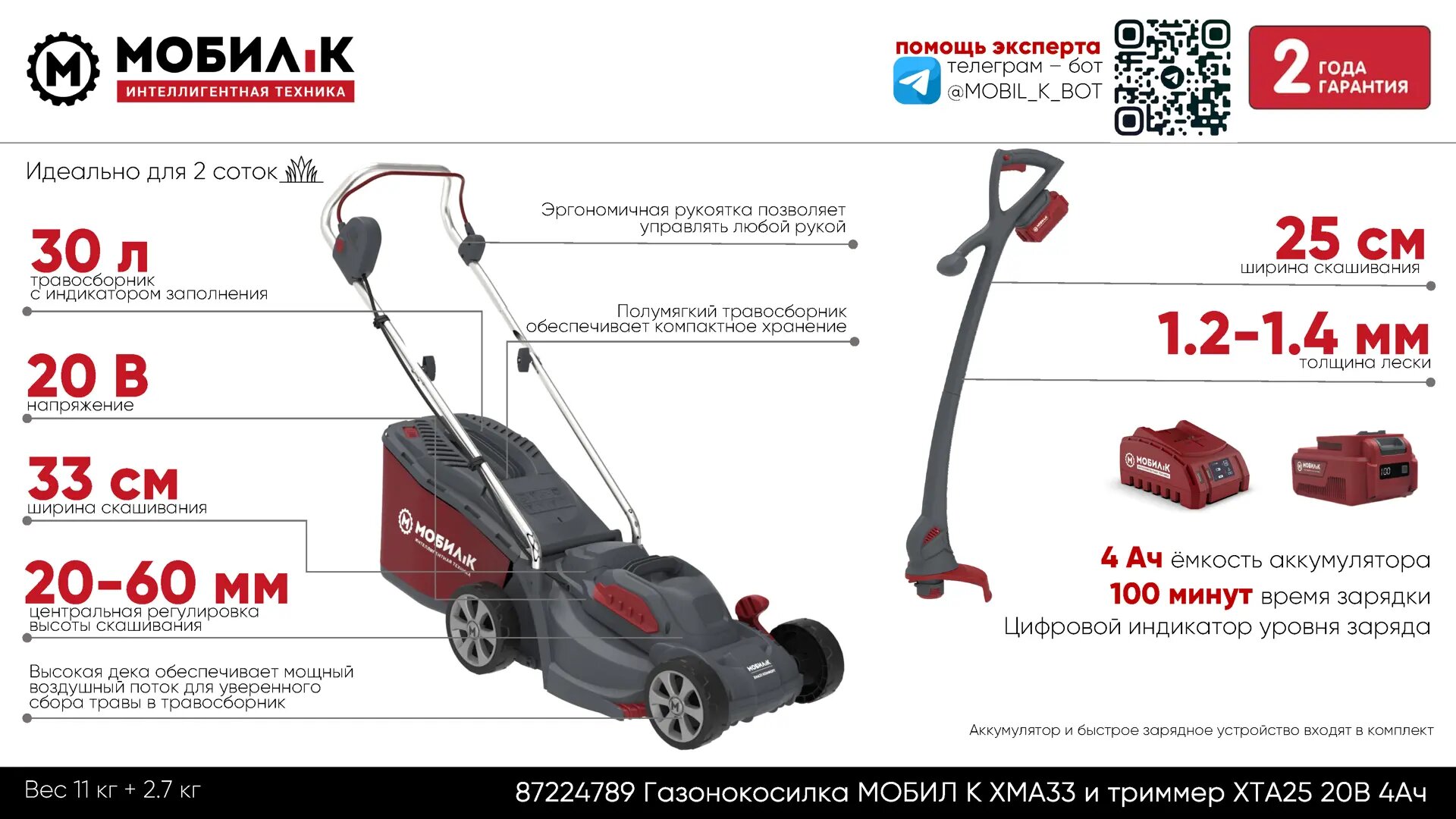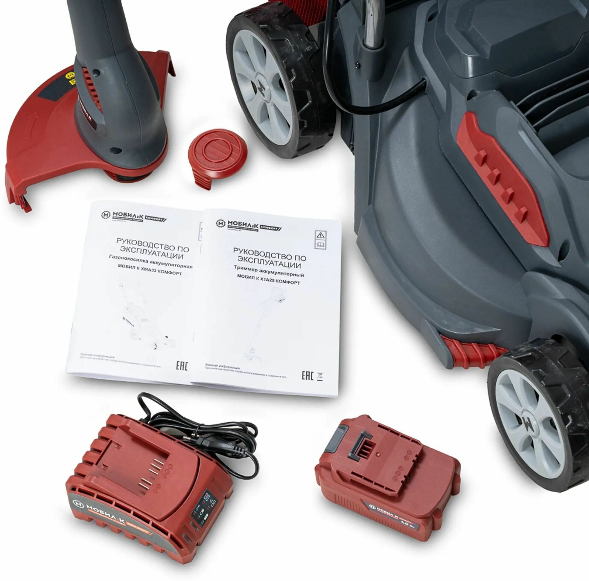 Газонокосилка аккумуляторная Мобил К XMA33 Комфорт и триммер XTA25 Комфорт – это набор, который идеально подходит для ухода за газоном и обрезки краев. Газонокосилка имеет мощный аккумулятор, что позволяет работать без перерыва до 30 минут, а ширина среза в 33 см делает ее удобной для работы с газонами любой площади. Триммер оборудован легким и удобным ручкой, что облегчает его использование для обрезки краев газона. Комфортные ручки и легкий вес делают этот набор удобным для использования и хранения.