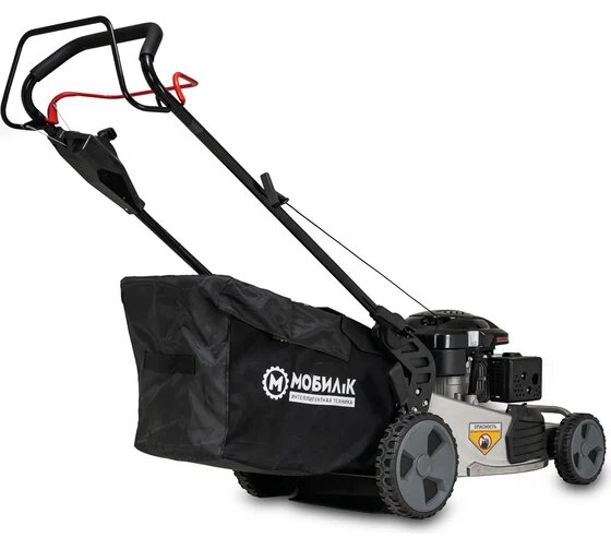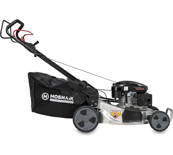 Газонокосилка мобил К оснащена эргономичной ручкой и колесами с подшипниками, что делает ее легкой в транспортировке и маневренной при работе на участках с неровной поверхностью.