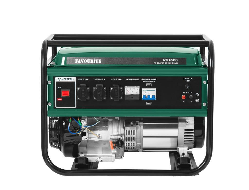 Бензиновый генератор FAVOURITE 6/6,5 кВт, 13 л. с, 3000 об/мин, 25 л, 389 см3, 438 г/кВтч PG 6500 предназначен для автономного энергосбережения в повторно-кратковременном режиме потребителей бытовых электроприборов со стандартными характеристиками сети переменного тока. Модель подойдет в качестве дополнительного источника питания для частного дома или небольшой мастерской. Двигатель способен работать безостановочно в течение длительного времени. Модель оснащена регулятором напряжения AVR. Генератор имеет ручной старт. Глушитель с повышенной производительностью способствует тихой работе. Бензиновая станция работает на бензине АИ - 92. Температурный режим эксплуатации до +30 градусов