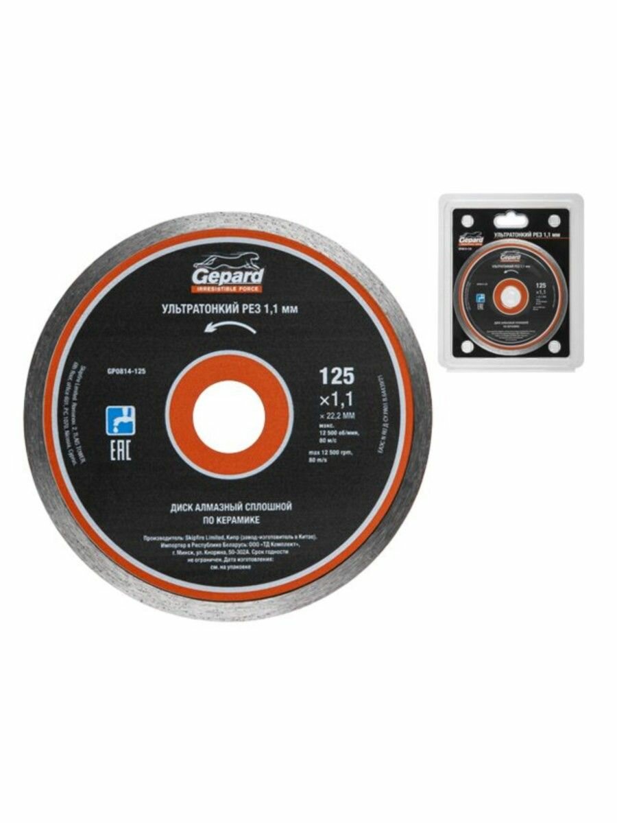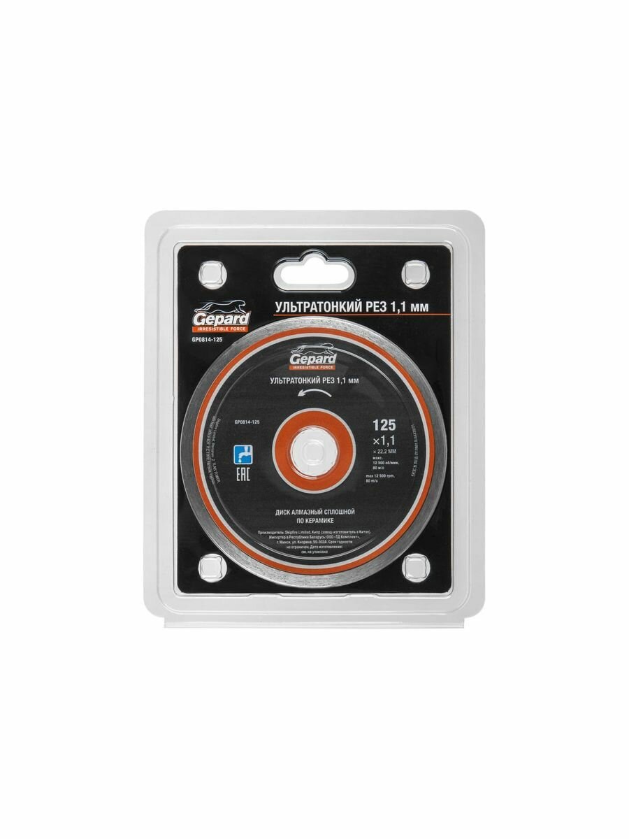 Круг алмазный 125х22 мм GEPARD по керамике (GP0814-125) применяется для деликатной резки по керамограниту, керамике, кафелю. Режущая часть выполнена методом горячего прессования, что позволяет получить чистые, ровные края без сколов и трещин. Охлаждение водой увеличивает ресурс круга. Характеристики: Диаметр 125 мм. Тип диска алмазный. Вид диска сплошной. Посадочный диаметр 22.2 мм. Толщина 1.1 мм. Тип по керамограниту. Сегментированный нет. Тип реза сухой (с СОЖ и без). Высота алмазного слоя 6 мм. Количество в упаковке 1 шт. Тип по керамограниту, керамике. Комплектация: диск алмазный - 1 шт.