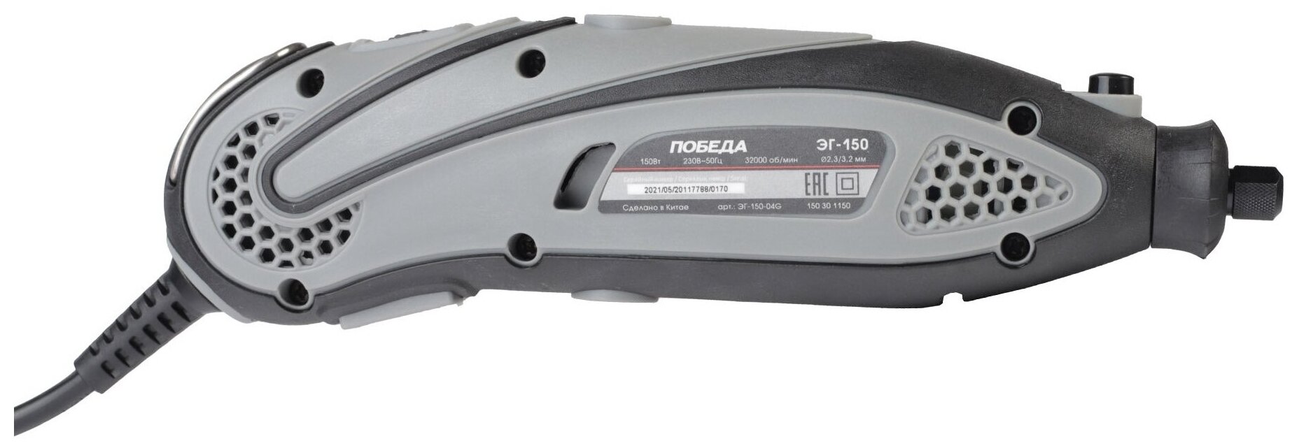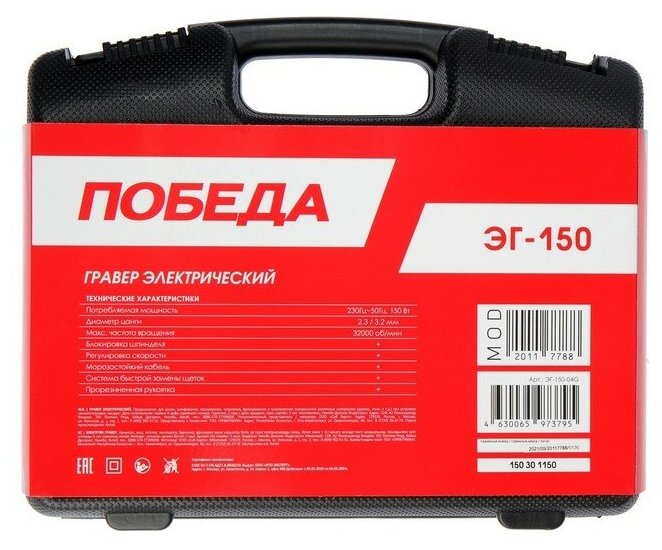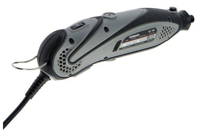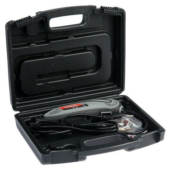 Гравер электрический ЭГ-150 для творческих работ, обработки мелких элементов и работы в труднодоступных местах. Регулируемое число оборотов позволяет подобрать оптимальный режим в зависимости от особенностей материала. Комплектация: - Гравер - 1 шт; - Набор оснастки - 38 предметов; - Кейс - 1 шт. Позволяет выполнять множество видов работ, часть из которых: шлифование, сверление, фрезерование, гравировка. Гравером отлично можно снять ржавчину, краску и заусенцы после сварки. Изделия из металла легко поддаются полировке гравером. Инструмент можно использовать в роли болгарки - пилить тонкие металлы, медные трубы и оргстекло. Можно наносить рисунки и надписи. Размер цанги: 2,3/3,2 мм; Частота оборотов: 32000 об/мин; Регулировка частоты вращения: да; Система быстрой замены щеток: да; Прорезиненная рукоятка: да; Прорезиненный морозостойкий кабель: да; Мощность: 150 Вт.