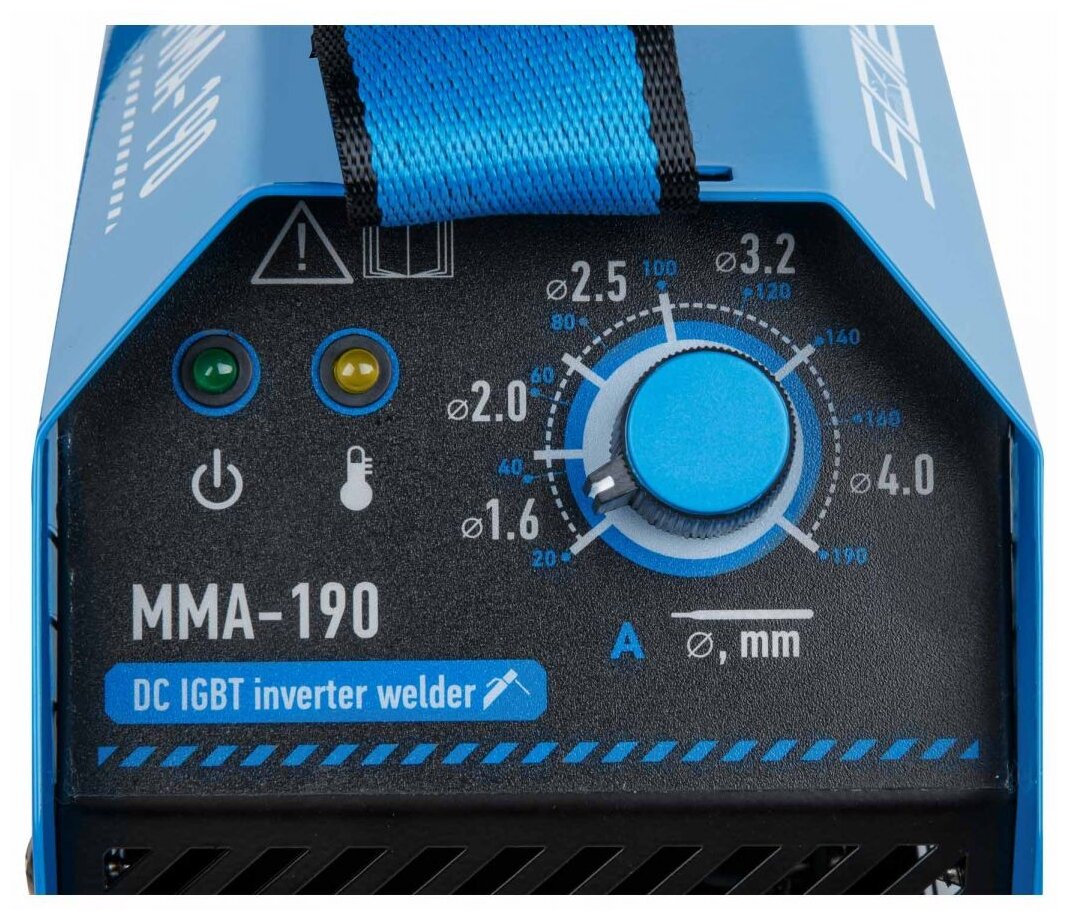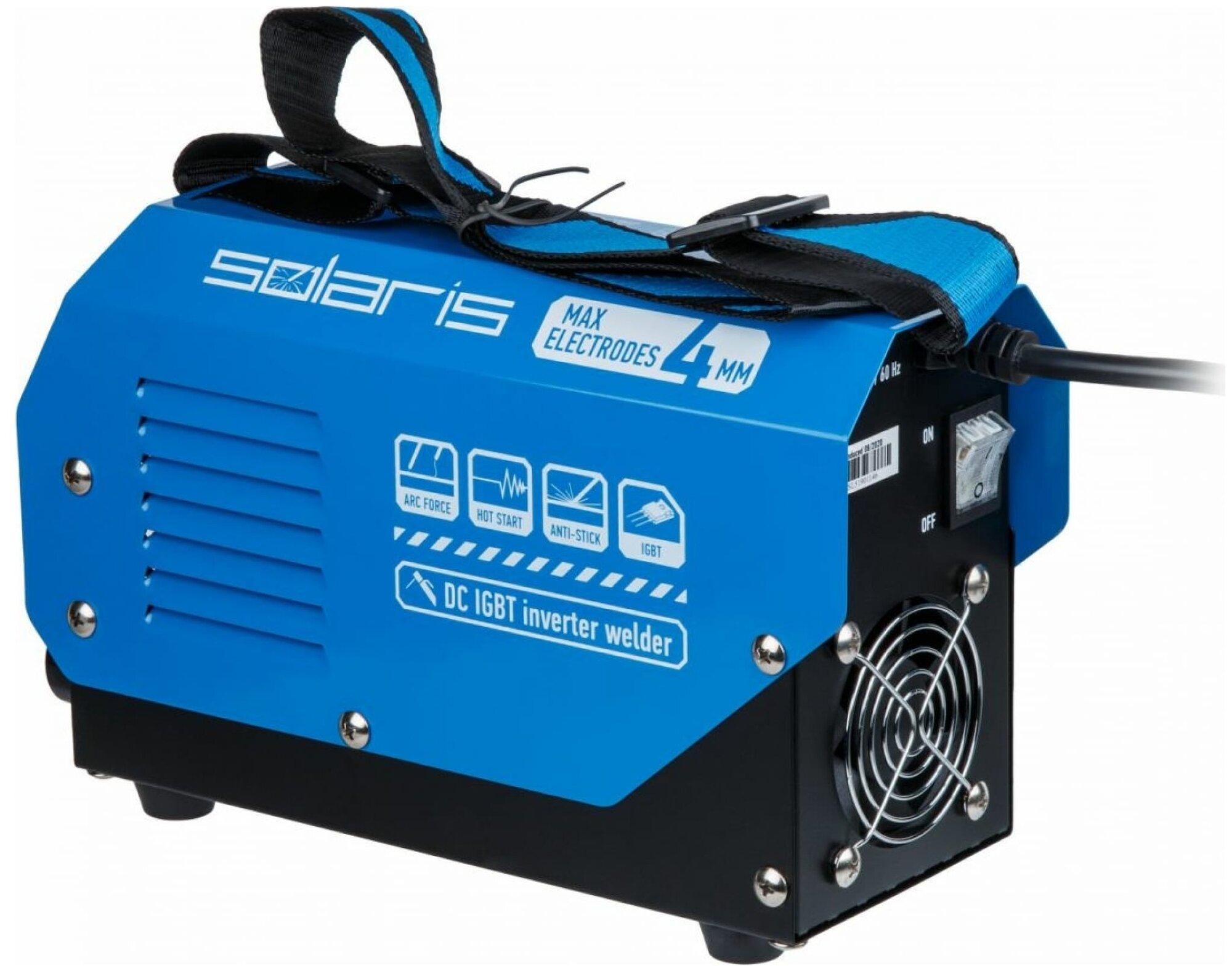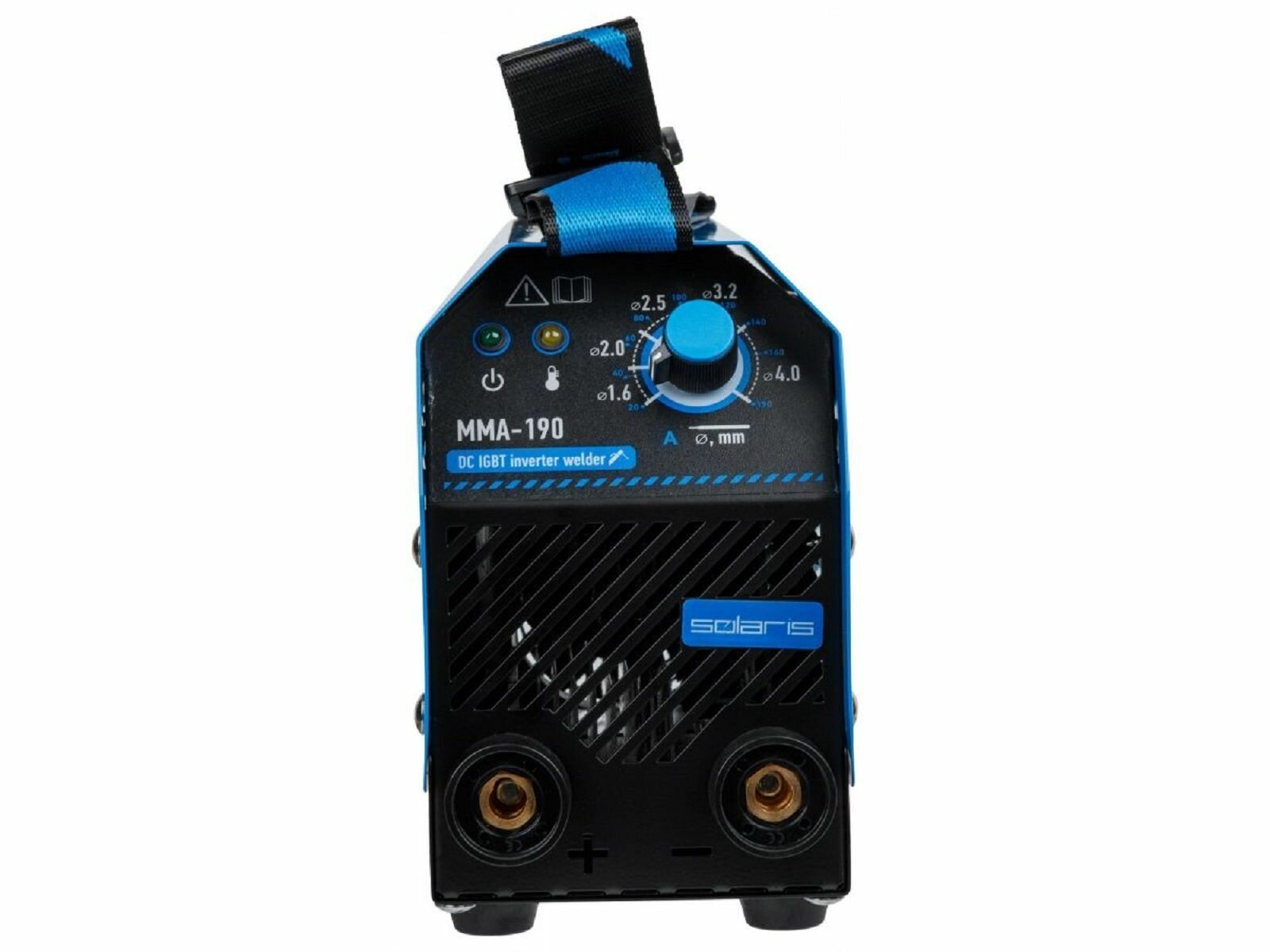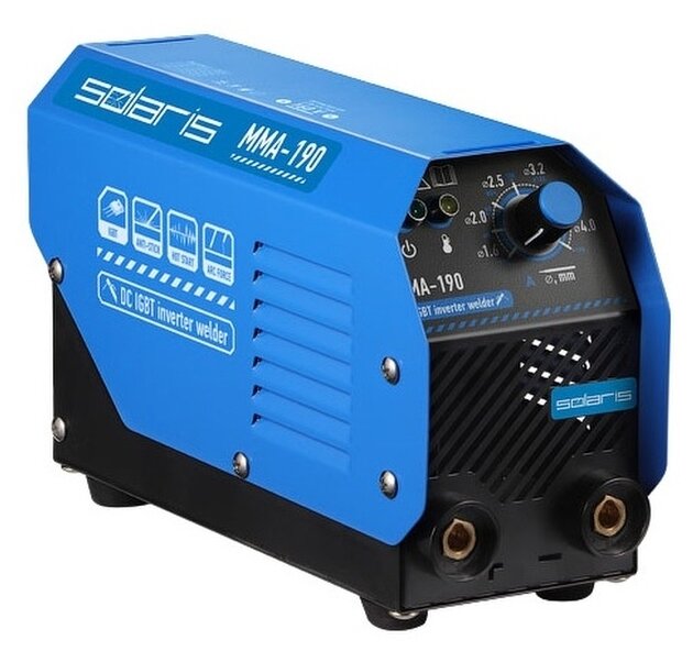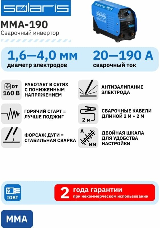 Преимущества: - инвертор работает на базе 4 шт. современных IGBT-транзисторов; - стабильная работа при входном напряжении от 160В; - функции ArcForce, HotStart, AntiStick; - эффективное охлаждение компонентов; - высокий ПВ 70% при 20 °С и 40% при 40 °С; - сварочные кабели 2 + 2 м; --- Технические характеристики: Выходные параметры: ; Диапазон сварочного тока MMA: 20-190 А; Напряжение холостого хода: 69 В; Диаметр электродов MMA: 1,6-4,0 мм; Рабочий цикл (ПВ) на макс, токе: ; == при 40°С (EN 60974-1): 40 %; == при 20°С: 70 %; Входные параметры: ; Напряжение питающей сети: 160 - 240 В; Частота питающей сети: 50/60 Гц; Тип сети: 1 фазн; Номинальный ток на входе: 19,3 А; Максимальный допустимый ток на входе: 30,6 А; Номин. потребл. мощность при макс. токе: 5,6 кВт; Рекомендуемая мощность генератора: 6,5 кВА; Эффективность: 92 %; Фактор мощности: COS 0,82; Класс изоляции: H; Степень защиты: IP21S; Вилка сетевая в комплекте: да; Масса (без принадлежностей):3,4 кг; Масса (с принадлежностями): 4,2 кг; Габаритные размеры (ДхШхВ): 285х105х175 мм; Гарантийный срок: 24 месяца; --- Комплектация: Сварочный аппарат Электрододержатель с кабелем 2 метра Клемма заземления с кабелем 2 метра Ремень транспортировочный Инструкция Коробка --- Совместимые товары: H-300C Электрододержатель Solaris H-300С; H-500C Электрододержатель Solaris H-500С; E-160C Клемма заземления 160А E-160C Solaris; E-200C Клемма заземления 200А E-200C Solaris; E-300C Клемма заземления 300А E-300C Solaris; E-500C Клемма заземления 500А E-500C Solaris; WA-2473 Разъем10-25 мм2 Solaris (папа); WA-2475 Разъем панельный 10-25 мм2 Solaris (мама); WA-2477 Разъем удлинительный 10-25 мм2 Solaris; WA-4210 Комплект сварочных проводов 2 + 2 м Solaris; WA-4211 Комплект сварочных проводов 3 + 3 м Solaris; WA-4201 Молоток сварщика 300 г Solaris; WA-4202 Молоток сварщика 500 г Solaris; WM-E6013-20010R Электроды E6013 ф 2,0мм (уп. 1,0кг) SOLARIS; WM-E6013-20025R Электроды E6013 ф 2,0мм (уп. 2,5кг) SOLARIS; WM-E6013-30010R Электроды E6013 ф 3,0мм (уп. 1,0кг) SOLARIS; WM-E6013-30025R Электроды E6013 ф 3,0мм (уп. 2,5кг) SOLARIS; ---