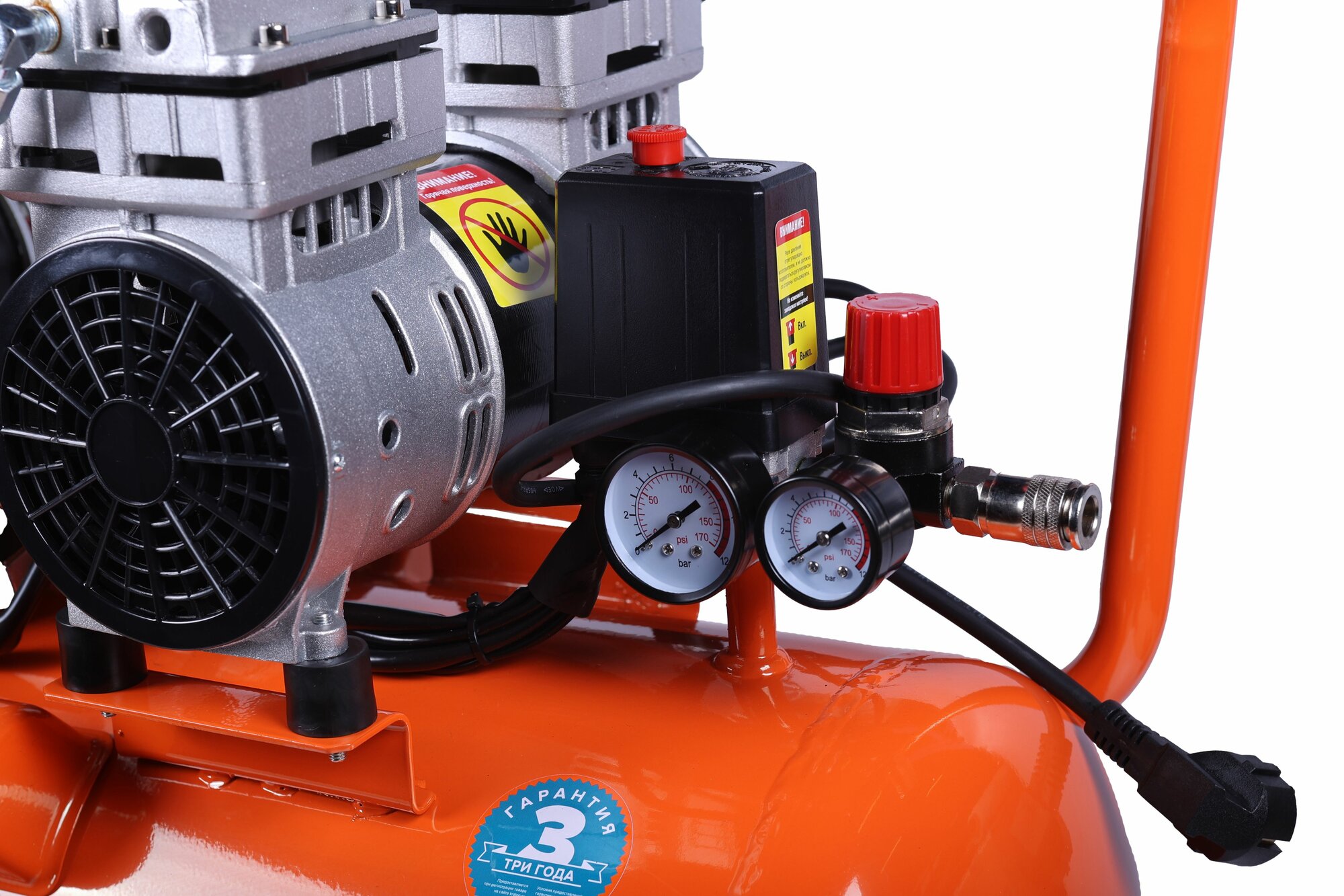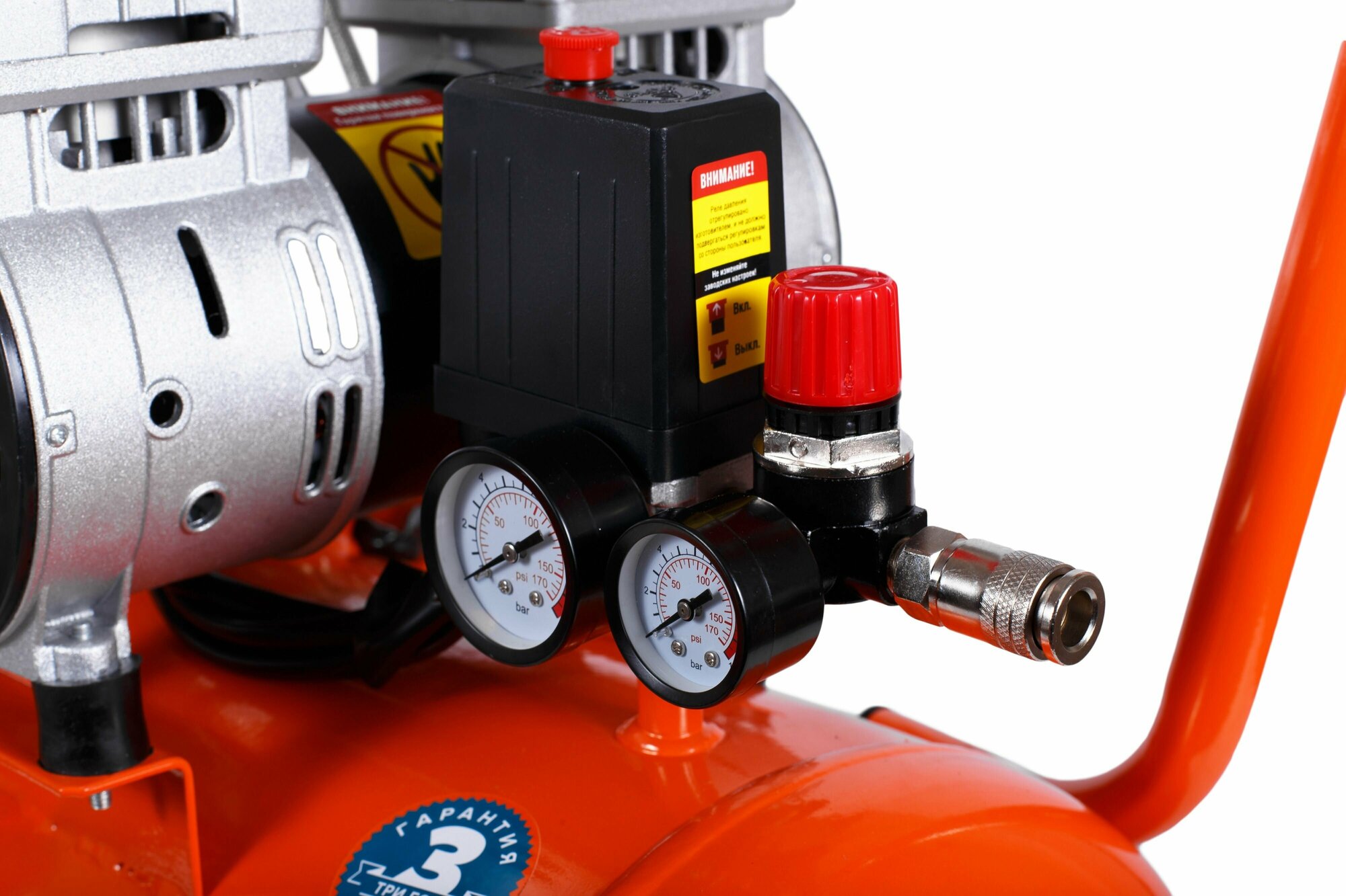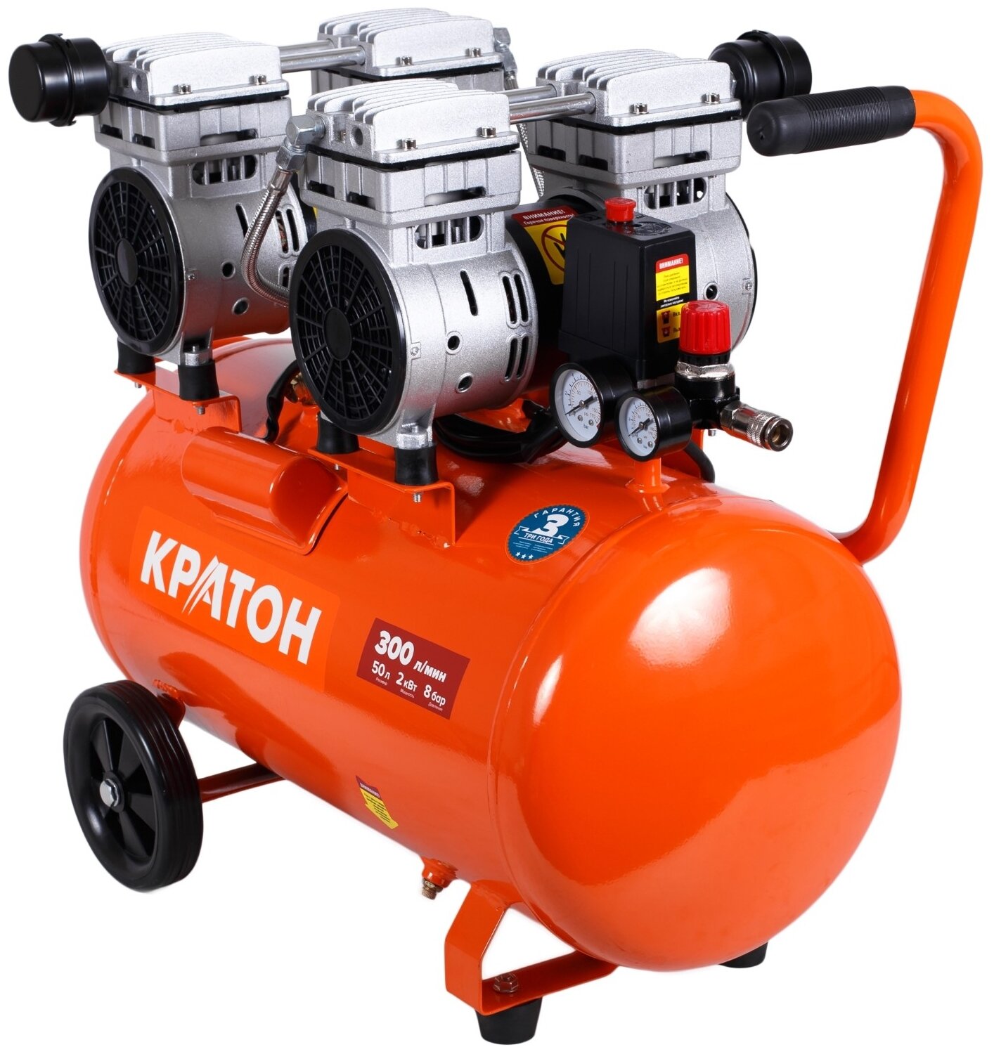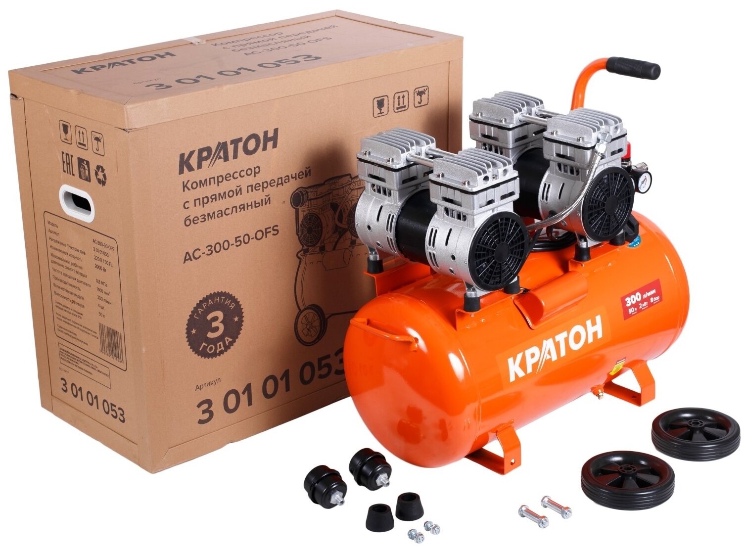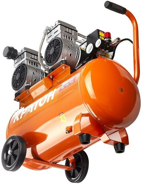 Безмасляный компрессор с прямой передачей Кратон AC-300-50-OFS 3 01 01 053 предназначается для сжатия и нагнетания атмосферного воздуха в пневмооборудование. Модель широко используется для накачки шин, а также во время покрасочных работ. Большие колеса и рукоятка эргономичной формы позволяют с удобством перемещать устройство на небольшие расстояния. Резиновая опора обеспечивает устойчивость конструкции, а также способствуют равномерному распределению вибраций. Специальное покрытие защищает поверхность ресивера от влияния коррозии и образования сколов в течение всего срока службы. Дренажный клапан служит для легкого и быстрого слива образующегося конденсата.