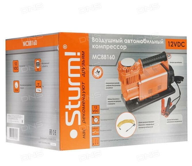 Компрессор автомобильный Sturm "MC88160" предназначен для повышения давления воздуха в покрышках (или камерах) колес автомобильного транспорта. Подключается к аккумулятору при помощи клемм, которые оснащены несколькими типами зажимов для работы с различными видами контактов. Длина шнура достаточна для работы рядом с крупногабаритными автомобилями. Устройство оснащено системой пассивного охлаждения, удобной рукояткой для транспортировки и широким основанием. Подключение шланга осуществляется через разъем типа Rapid. Небольшие размеры и удобная конструкция делают компрессор практичным устройством. Тип компрессора: автокомпрессор безмасляный поршневой Производительность: 160 л/мин Объем ресивера: нет Рабочее давление: 10 бар Мощность: 550 Вт Напряжение: 12 В Цилиндры/ступени: 1/1 Транспортировочные колеса: нет Гарантия: 14 месяцев Производитель: Германия Сборка: КНР