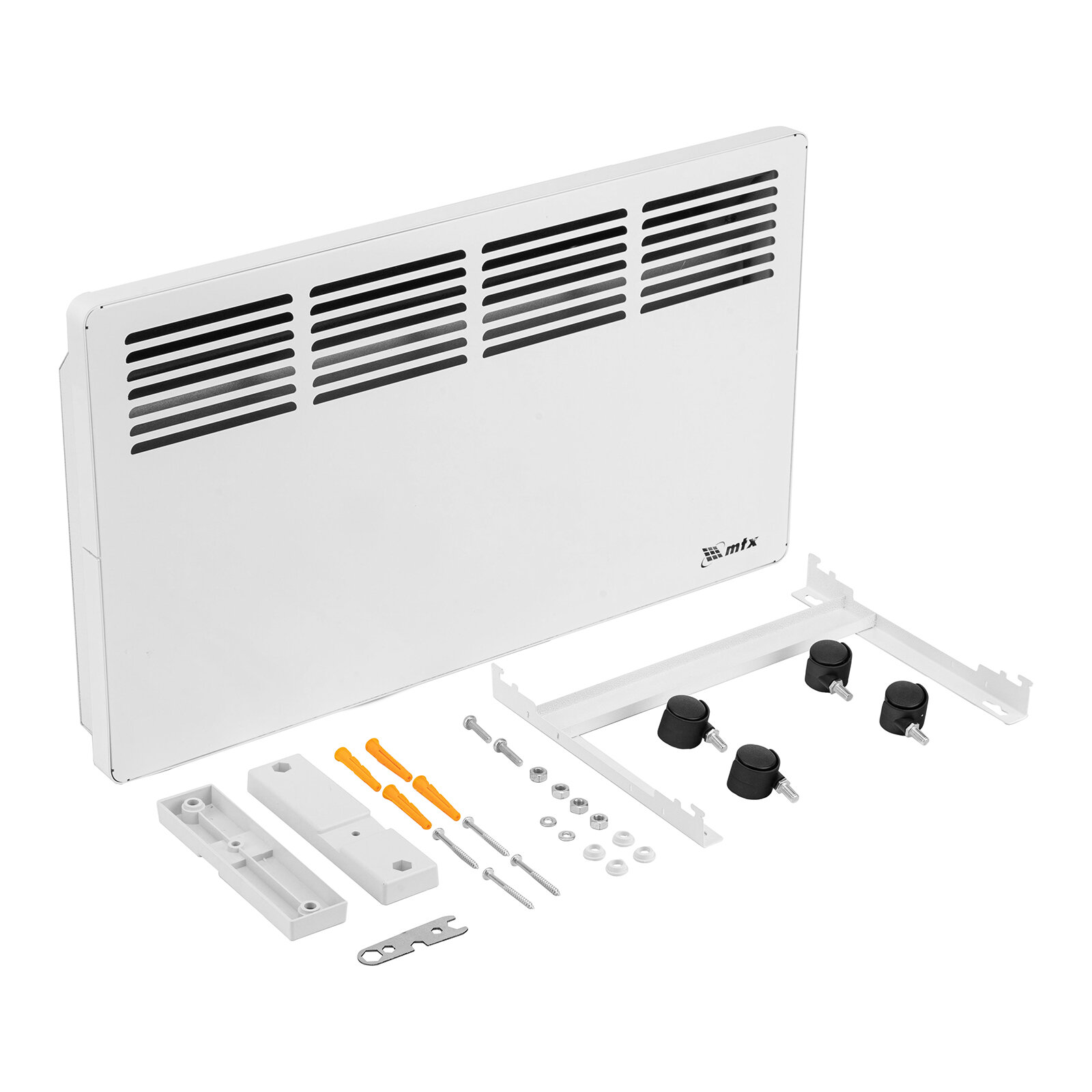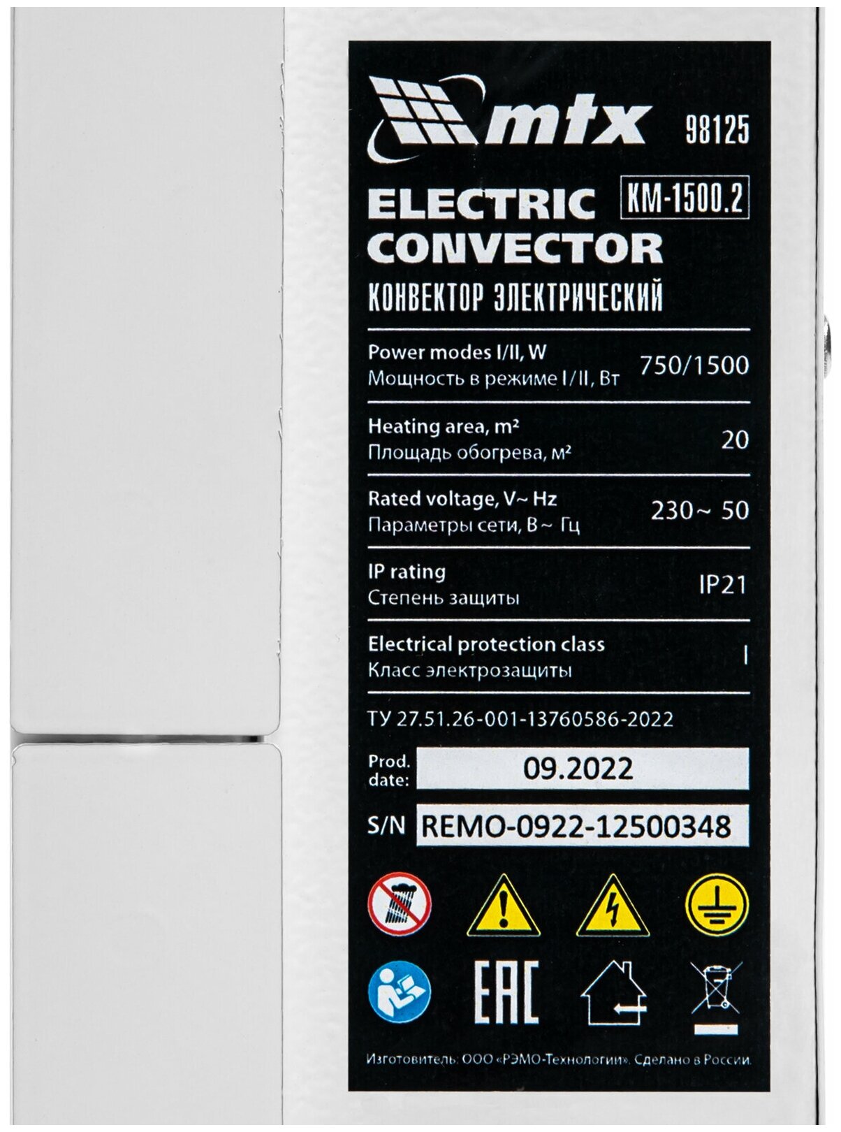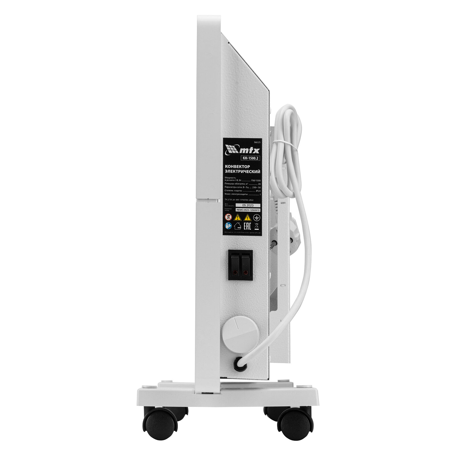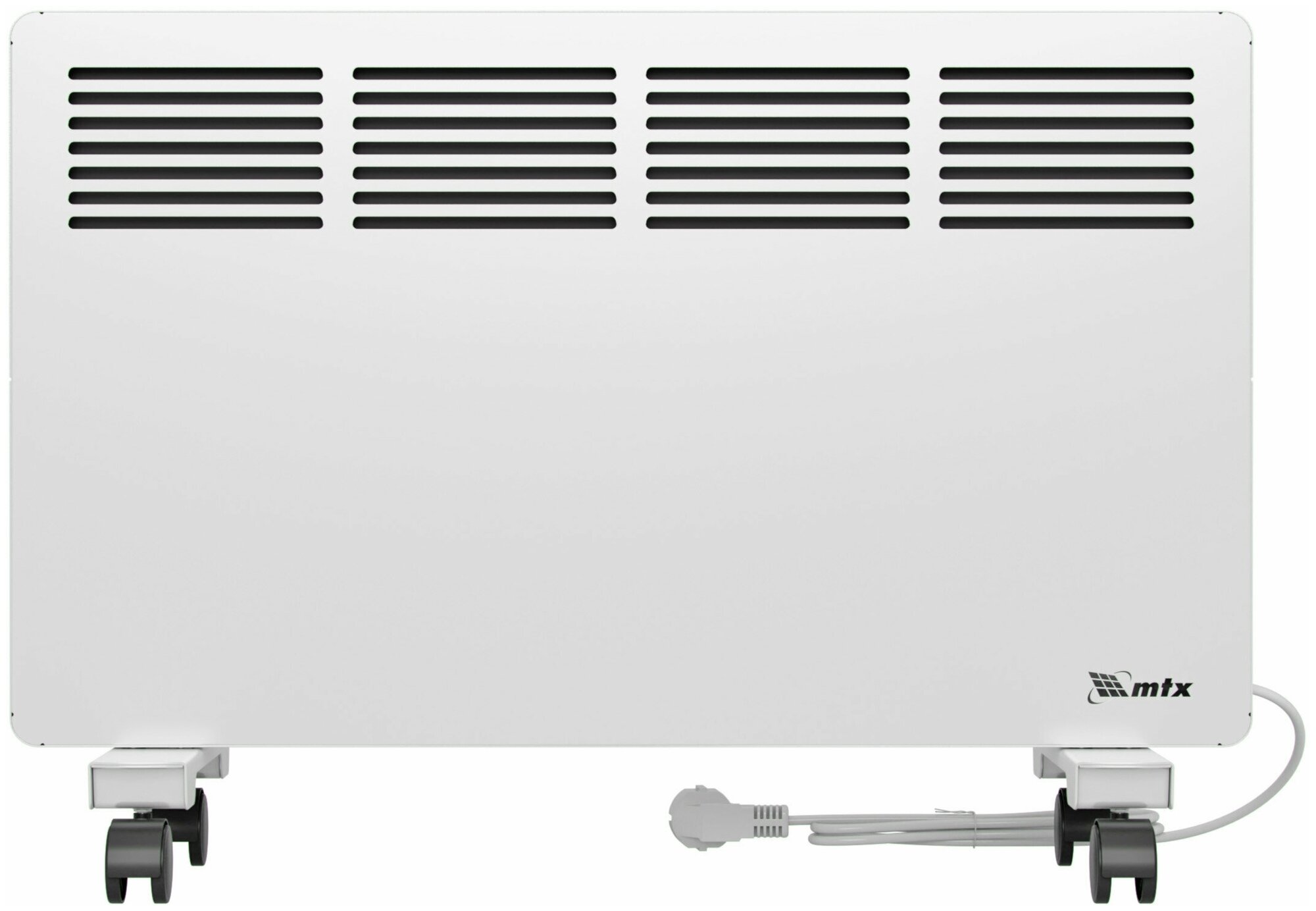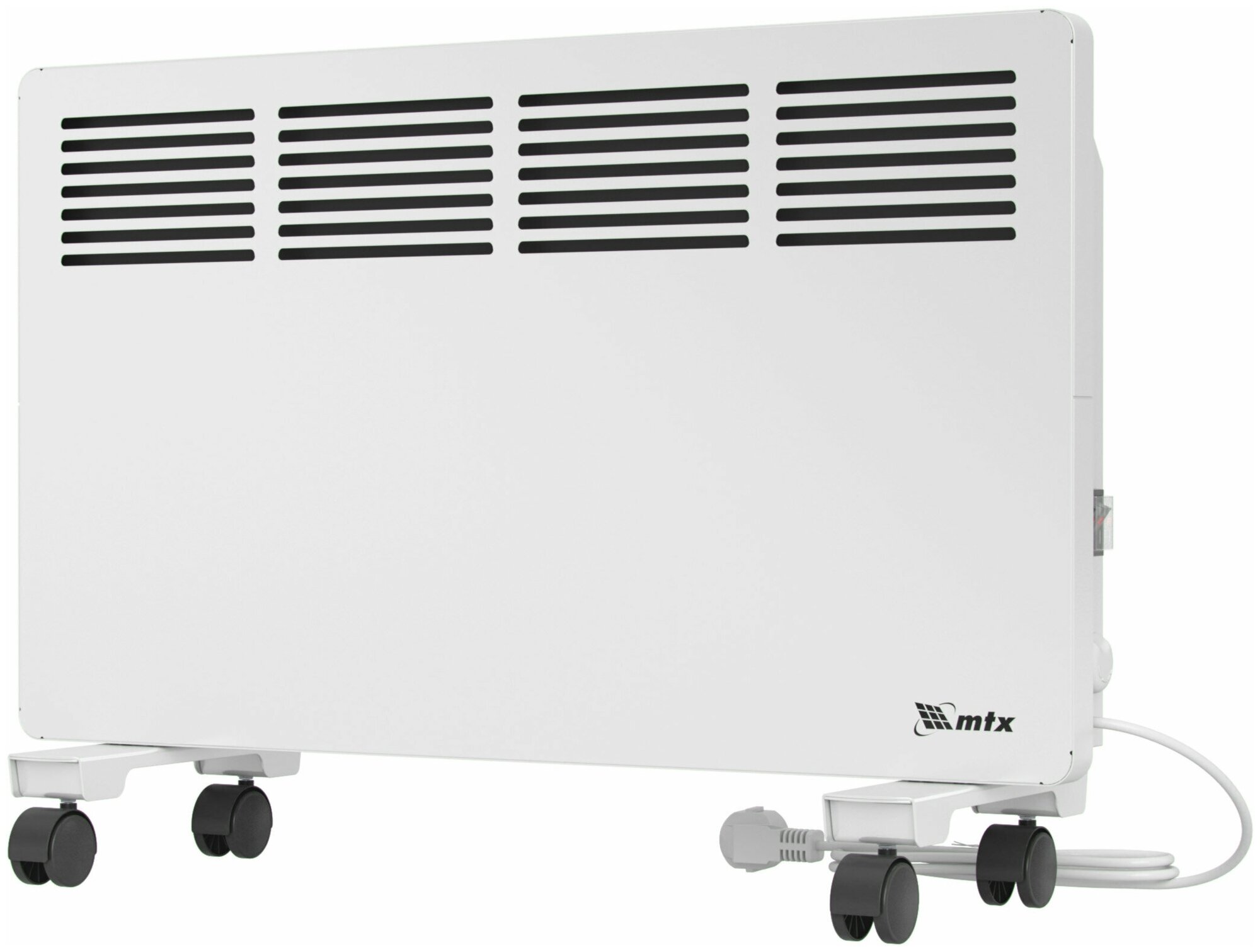 Конвектор электрический MTX KM-1500.2 98125 с X-образным нагревателем, колесами на металлической опоре и термостатом, мощностью 1500 Вт, предназначен для использования в закрытых помещениях: квартирах, офисах, загородных домах, на даче, на производстве и в общественных местах. Рекомендуемая площадь обогрева составляет 20 кв. м. Х-образный нагревательный элемент обеспечивает быстрый и равномерный прогрев помещения до необходимой температуры, при этом не сушит воздух. Преимущества2 режима работы (полный обогрев на мощности 1500 Вт и частичный на 750 Вт) — конвектор позволяет прогревать холодное помещение и поддерживать тепло в отапливаемом. Все выполнено из металла — корпус, колесные опоры, крепежная рамка. Премиум дизайн — глянцевая лицевая панель конвектора хорошо вписывается в интерьер. Антивандальное покрытие «Белая шагрень» — имеет в 3 раза выше прочность относительно обычной краски. Оптимальная циркуляция воздушного потока — внутри конвектора установлен специальный отражающий экран, рассчитанный согласно законам термодинамики. Термозащита — конвектор отключается в случае перегрева, что делает его использование безопасным и предотвращает выход из строя. Удобная настройка и автоматическое поддержание заданных параметров — механический термостат позволяет задать и точно поддерживать температуру в помещении. Комфортная эксплуатация — конвектор не сушит воздух и не сжигает пыль, что исключает появление неприятного запаха в помещении. Надежность и долговечность — Х-образный нагревательный элемент отличается самым большим сроком службы в сравнении с другими нагревательными элементами и обеспечивает равномерную конвекцию без риска локальных перегревов. Возможность использования в ванной комнате — нагревательный элемент выдерживает эксплуатацию в условиях повышенной влажности. Мобильность — колеса облегчают перемещение обогревателя. Два варианта монтажа — конвектор можно расположить на полу или повесить на стену (колесные опоры и кронштейн входят в комплект поставки). Цельнометаллическая крепежная рамка — облегчает монтаж конвектора на стену и повышает жесткость конструкции.