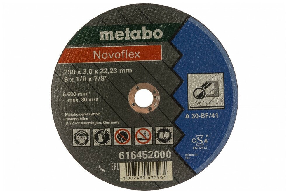Круг отрезной по металлу Metabo Novofleх 230х3 мм 616452000 — сменный расходный материал для ручного электроинструмента. Применяется для резки металлических деталей и поверхностей: тонкостенного профиля и арматуры, листовой стали, профильных труб и фигурных пропилов. Диск универсален в обработке металлов и имеет класс качества A30 «Novoflex».