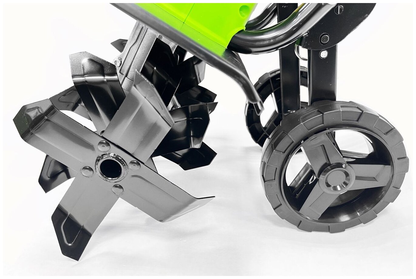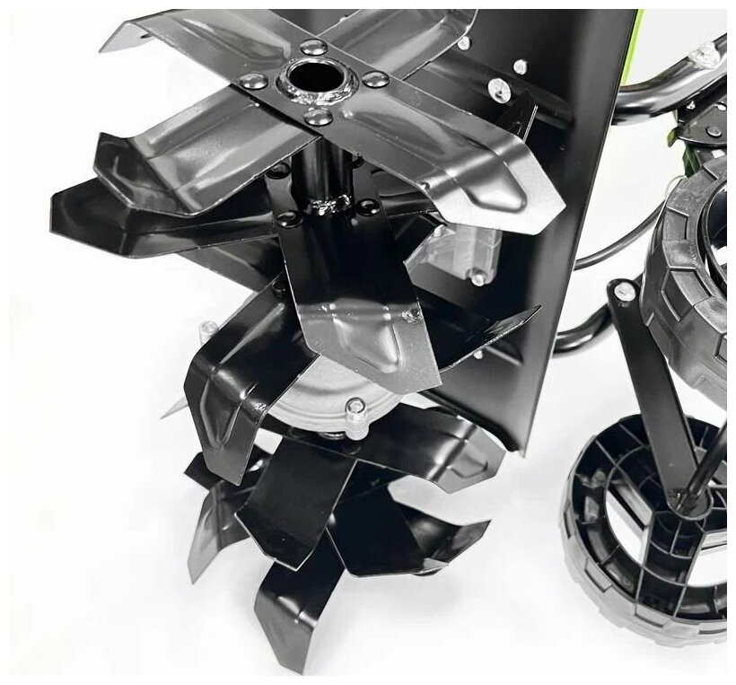 Культиватор оснащен 4-мя специальными фрезами - ножами с максимальной глубиной обработки в 20 см, ширина обработки составляет 40 см. Для экономии места при хранение, ручка культиватора складывается, а для удобства использования предусмотрены опорные колеса.