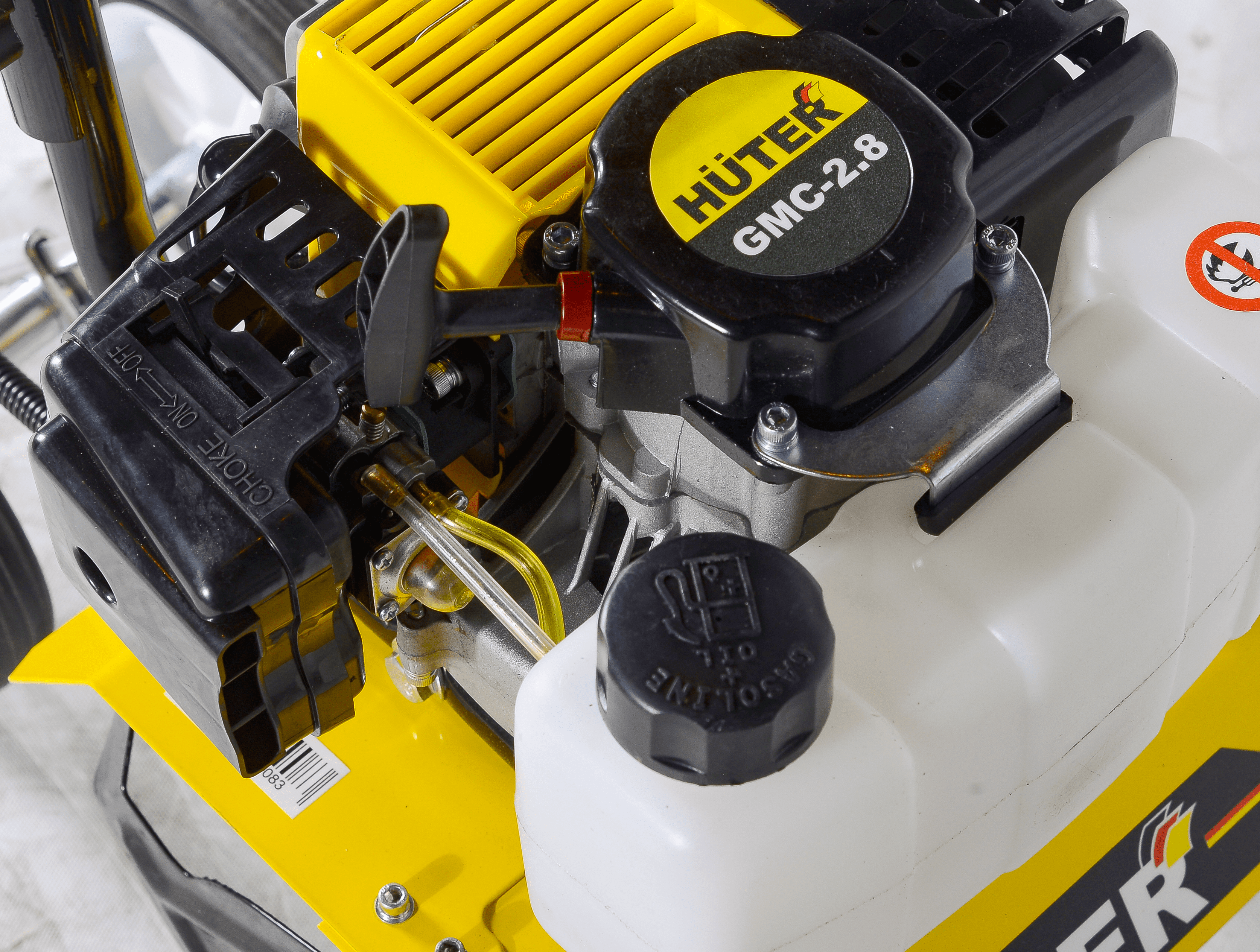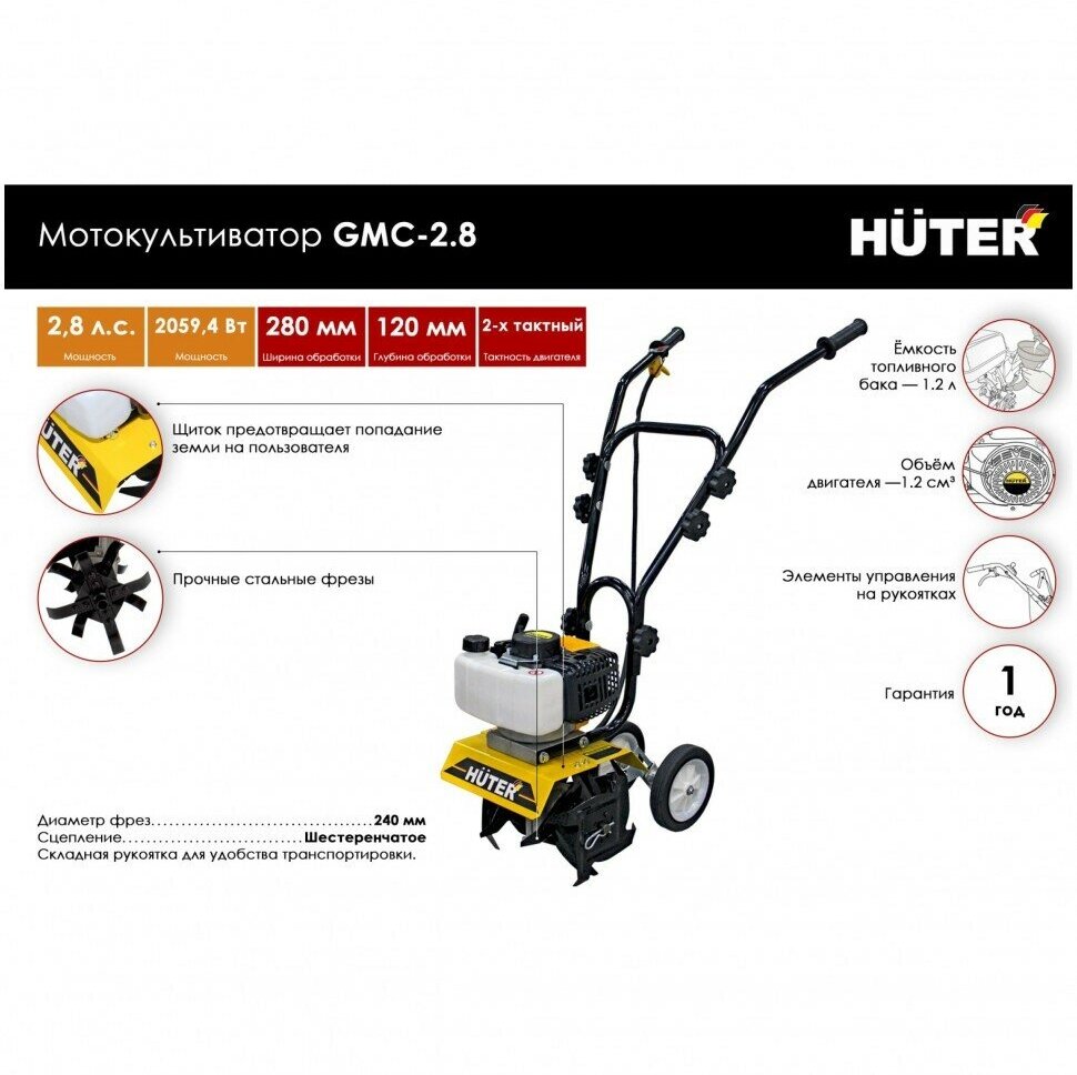 Культиватор Huter GMC-2.8 оснащен бензиновым двигателем, что делает его более мобильным и удобным в использовании.