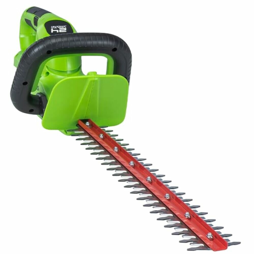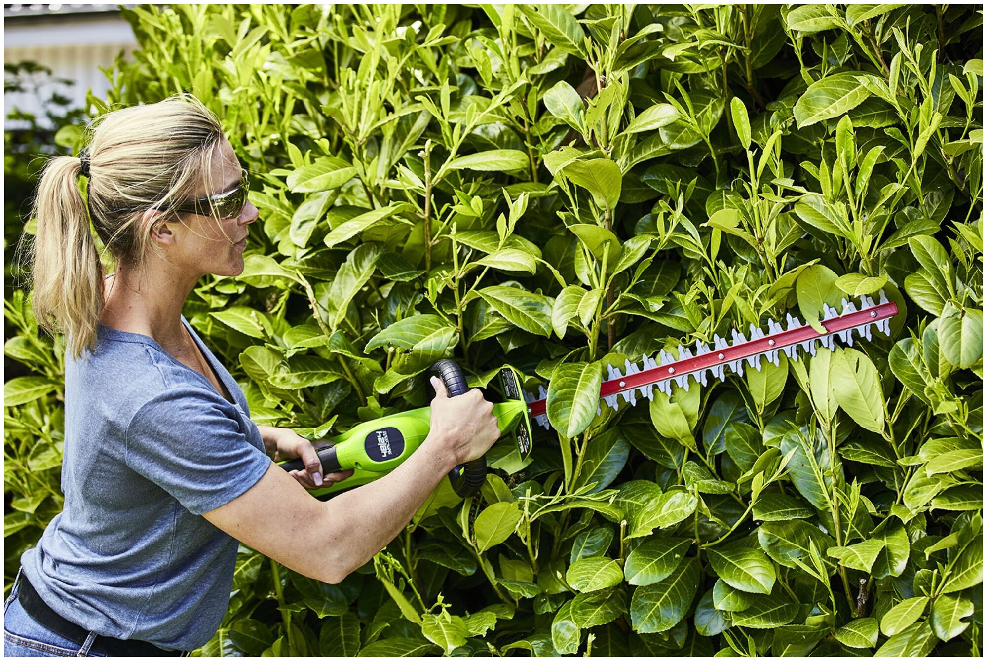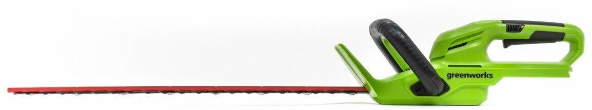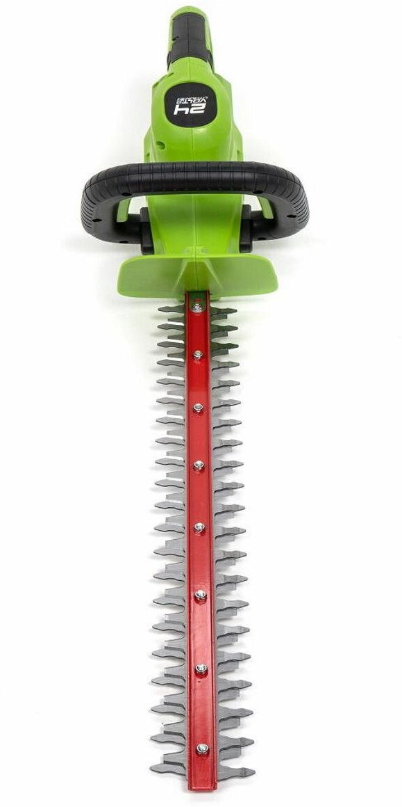 Кусторез аккумуляторный GreenWorks 24V (модель G24HT56) - легкий садовый инструмент. Предназначен для подрезки кустарника, живой изгороди или декоративных деревьев. Основным преимуществом данной модели является малый вес, по сравнению с бензиновыми аналогами (всего 2,6 кг.). Это отличная альтернатива бензиновому или электрическому кусторезу.