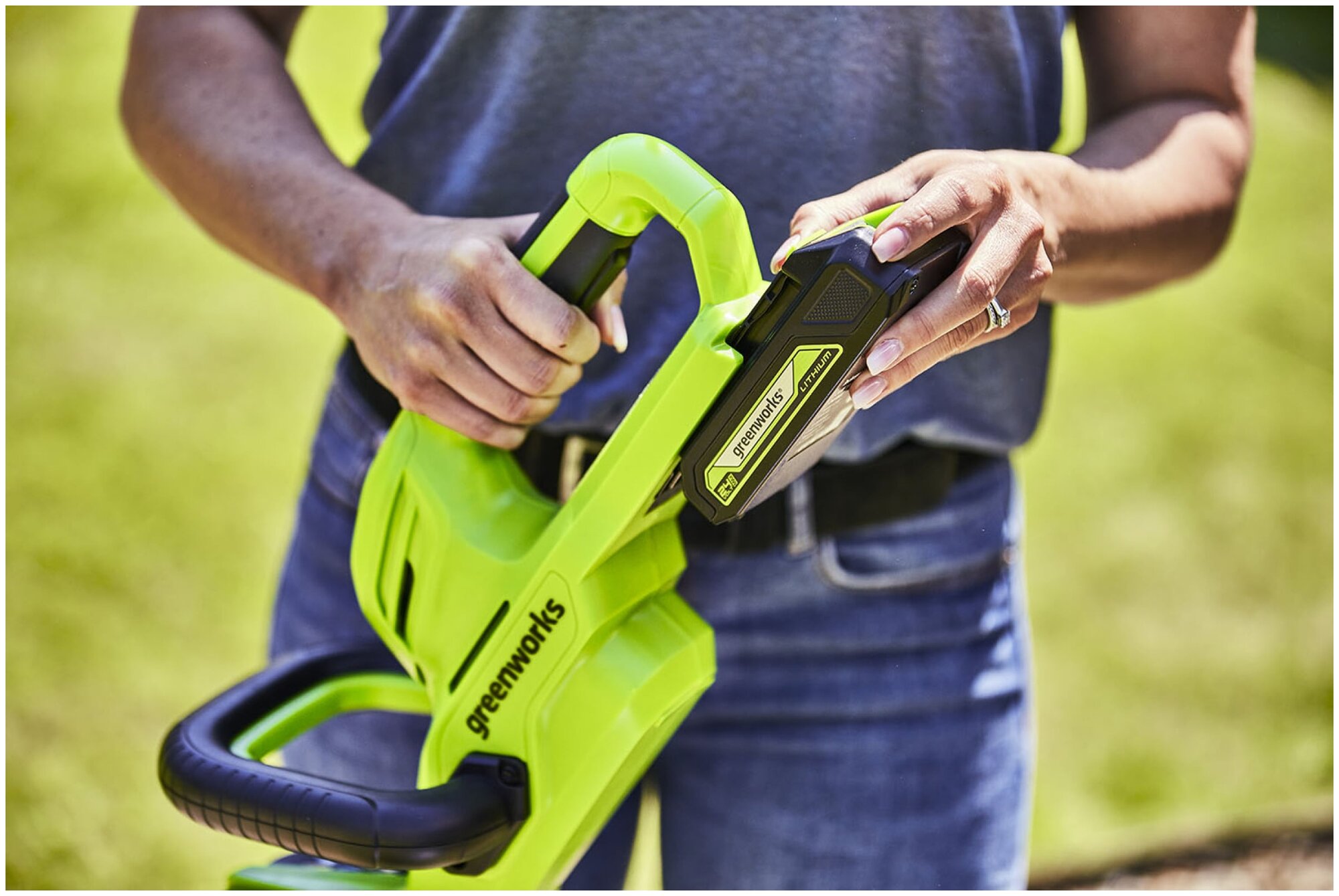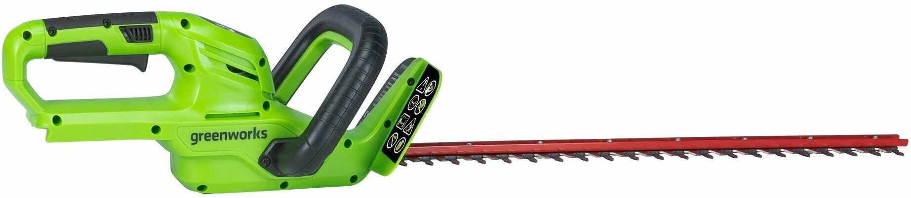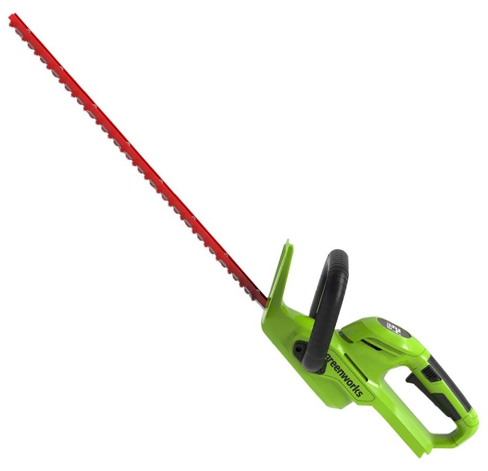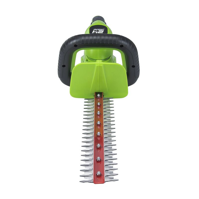 Кусторез аккумуляторный GreenWorks 24V (модель G24HT56) - легкий садовый инструмент. Предназначен для подрезки кустарника, живой изгороди или декоративных деревьев. Основным преимуществом данной модели является малый вес, по сравнению с бензиновыми аналогами (всего 2,6 кг.). Это отличная альтернатива бензиновому или электрическому кусторезу.