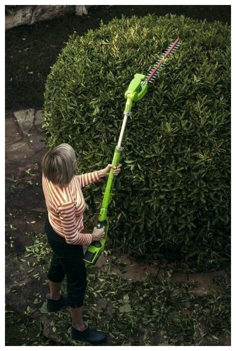 Для защиты пользователя от случайного включения предусмотрены кнопки предохранители. Двигатель оснащается системой защиты от перегрузок - это продлит срок службы вашего устройства. Телескопический садовый кусторез является одним из 20-ти устройств системы GreenWorks G-24V и совместим с аккумуляторами на 2 или 4 А/ч из этой серии.