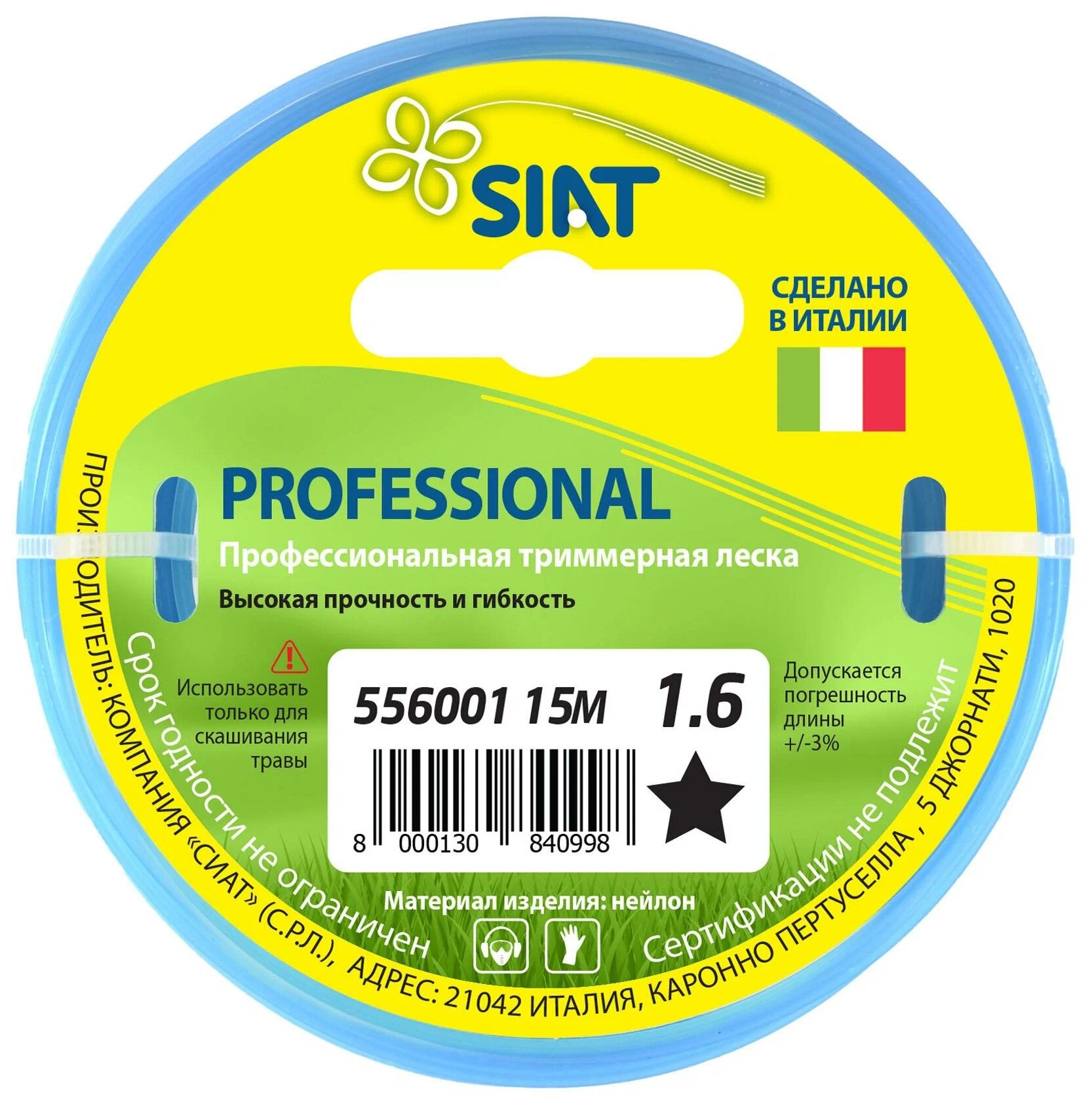 Леска SIAT 556001 применяется при работе триммерами. Является режущим элементом и заправляется в триммерную головку. Леска различается по диаметру и форме сечения. Правильный подбор толщины лески и ее сечения для определенных работ существенно влияет на скорость кошения и износ лески. Корд представляет собой мононить с сечением в виде звезды, имеет высокую износостойкость и отличную режущую способность благодаря острым краям лески. Выполнен из качественных материалов, имеет длительный срок эксплуатации.