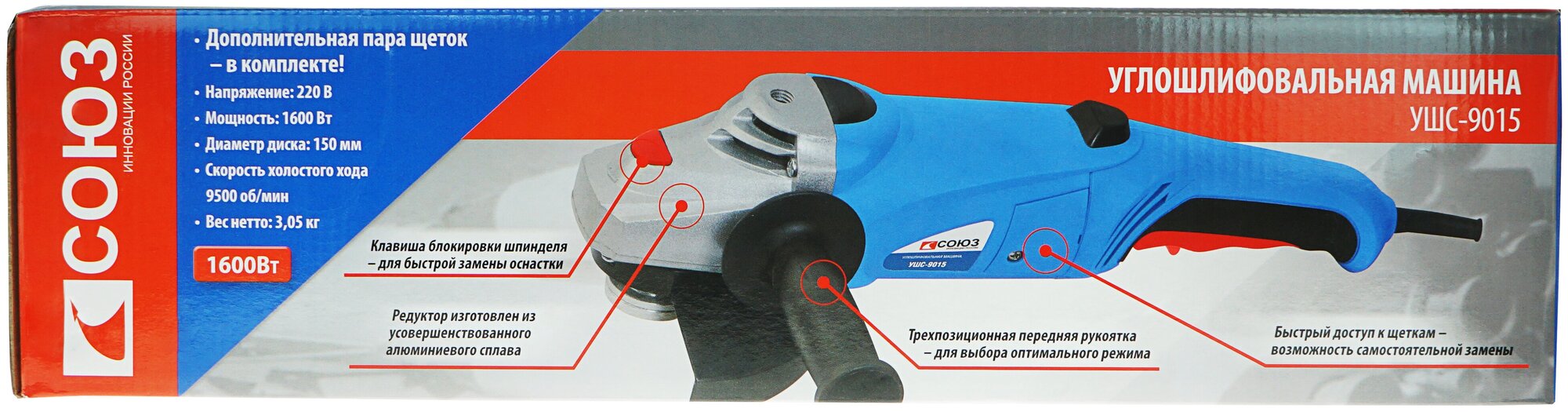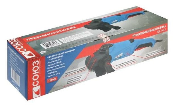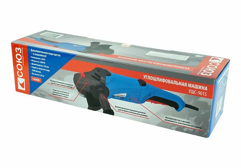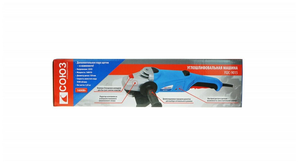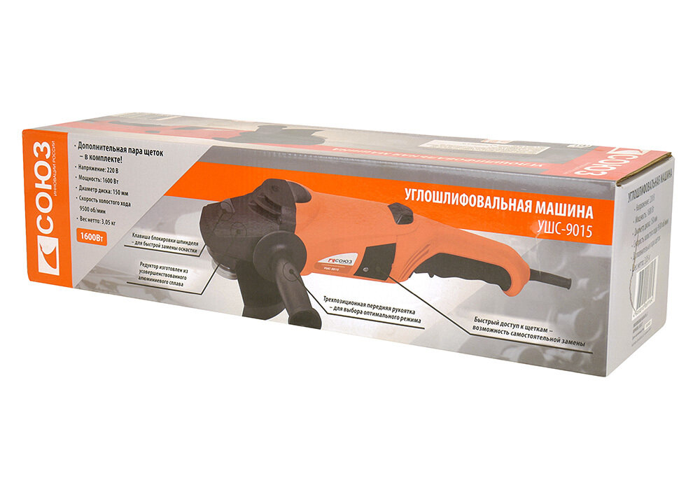 Болгарка (УШМ) СОЮЗ УШС-9015 Brand: Союз Описание: Артикул: 347906 Краткие характеристики: Родина бренда: Россия Производитель: Код товара: 347906 Вес: 3.705 кг Высота: 115 мм Болгарка (УШМ) СОЮЗ УШС-9015 Brand: Союз Описание: Артикул: 347906 Технические характеристики Единица измерения шт Сертификаты https Сертификаты на опасные вещества https Преимущество 1 Дополнительная рукоятка может быть установлена в 3-х положениях для удобства выполнения различных задач Длина кабеля питания (м) 2 Напряжение питания (В) 220 Посадочный размер (мм) 22,2 Вид упаковки Коробка Габариты в упаковке (ДхШхВ, см) 46x13x11,5 Максимальная мощность (Вт) 1 600 Особенности Удлиненная рукоять для удобного хвата 3-и позиции для установки рукоятки Комплектация Защитный кожух Боковая рукоятка Фланцевый ключ Шестигранный ключ Дополнительные угольные щетки (комплект, 2шт) Инструкция по эксплуатации Обороты на холостом ходу (об/мин) 9 500 Блокировка шпинделя Да Диаметр диска (мм) 150 Описание Мощный инструмент с улучшенным управлением для решения основных общестроительных задач. Инструмент эффективен в любых задачах при резке, зачистке, шлифовке поверхностей изделий из металла, керамической плитки, кирпича. Эргономичный корпус из АБС-пластика, стойкий к ударам и низким температурам, удлиненная рукоять для удобного хвата - обеспечивает долгую и комфортную работу в любых условиях эксплуатации. Дополнительные преимущества благодаря возможности установки боковой ручки на корпусе редуктора в 3 положениях. Металлический защитный кожух легко переставляется и обеспечивает безопасность труда. Уменьшенный корпус редуктора позволяет выполнить более глубокий рез. Блокировка шпинделя обеспечивает быструю смену оснастки и повышает производительность труда. Безопасный двухполюсный включатель с фиксацией облегчает работу в непрерывном режиме и обеспечивает мгновенное отключение инструмента одним нажатием при необходимости. Усиленная защита от пыли оптимизированная внутренняя аэродинамическ