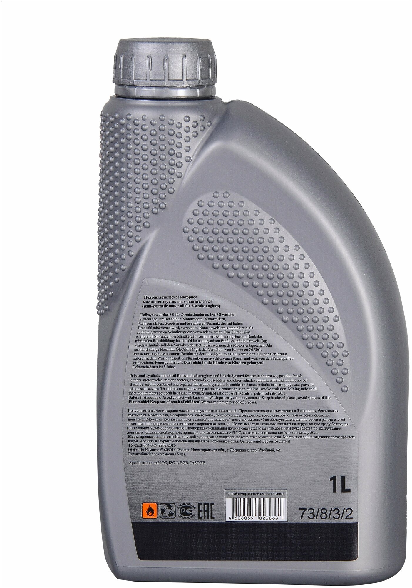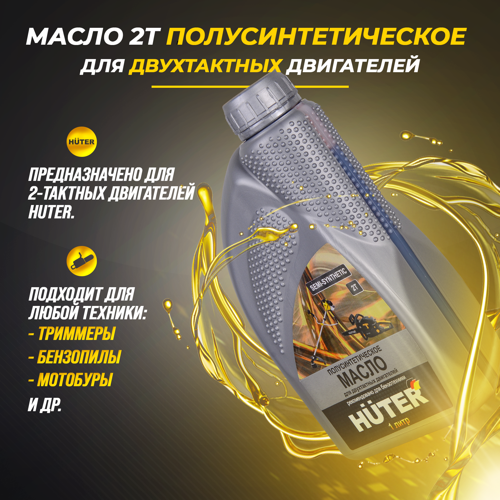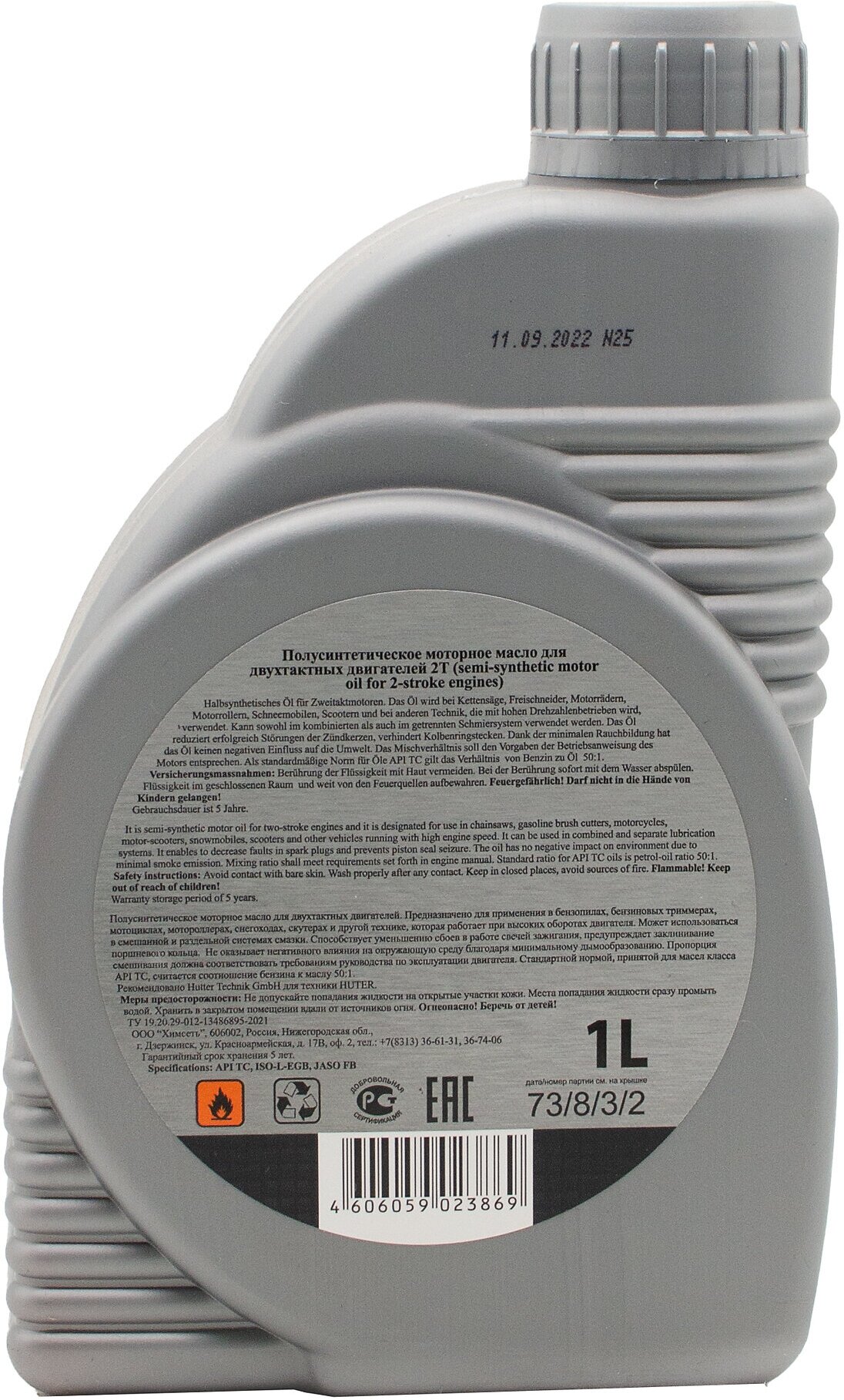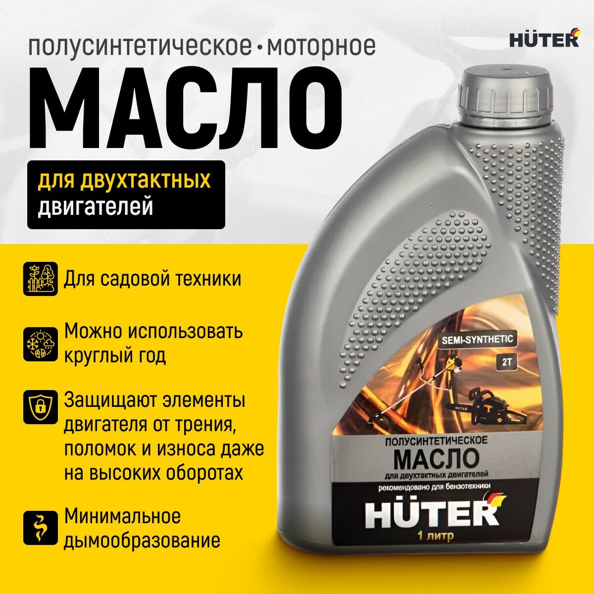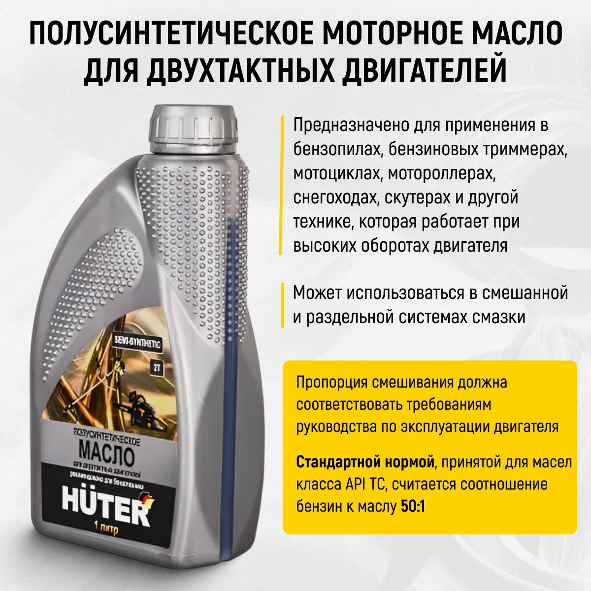 Масло 2Т полусинтетическое для двухтактных двигателей Huter разрешено использовать в садовом инструменте и мототехнике. По классификации API оно относится к типу TC. Эта категория масел по тестам предотвращает повреждения от преждевременного зажигания, пригорание поршневых колец и задиры на цилиндрах в высоконагруженных двухтактных двигателях. Стандарты ISO-L-EGB и JASO FB определяют качество смазки, моющий эффект, уровень выхлопов и чистоту цилиндров после сгорания топливной смеси. Для ее приготовления необходимо руководствоваться инструкцией по эксплуатации техники. Для двухтактных ДВС без отдельной системы смазки ма
