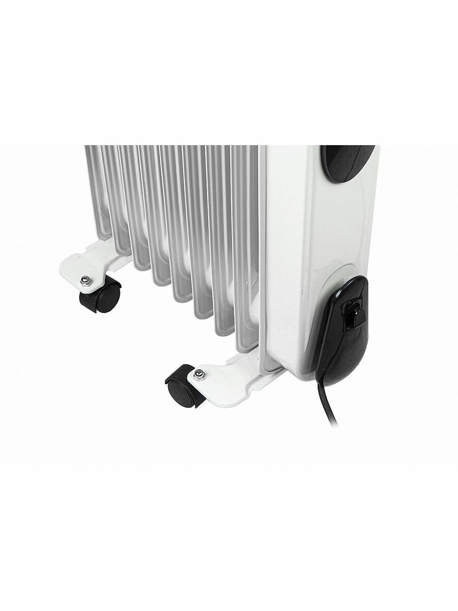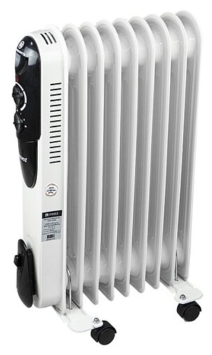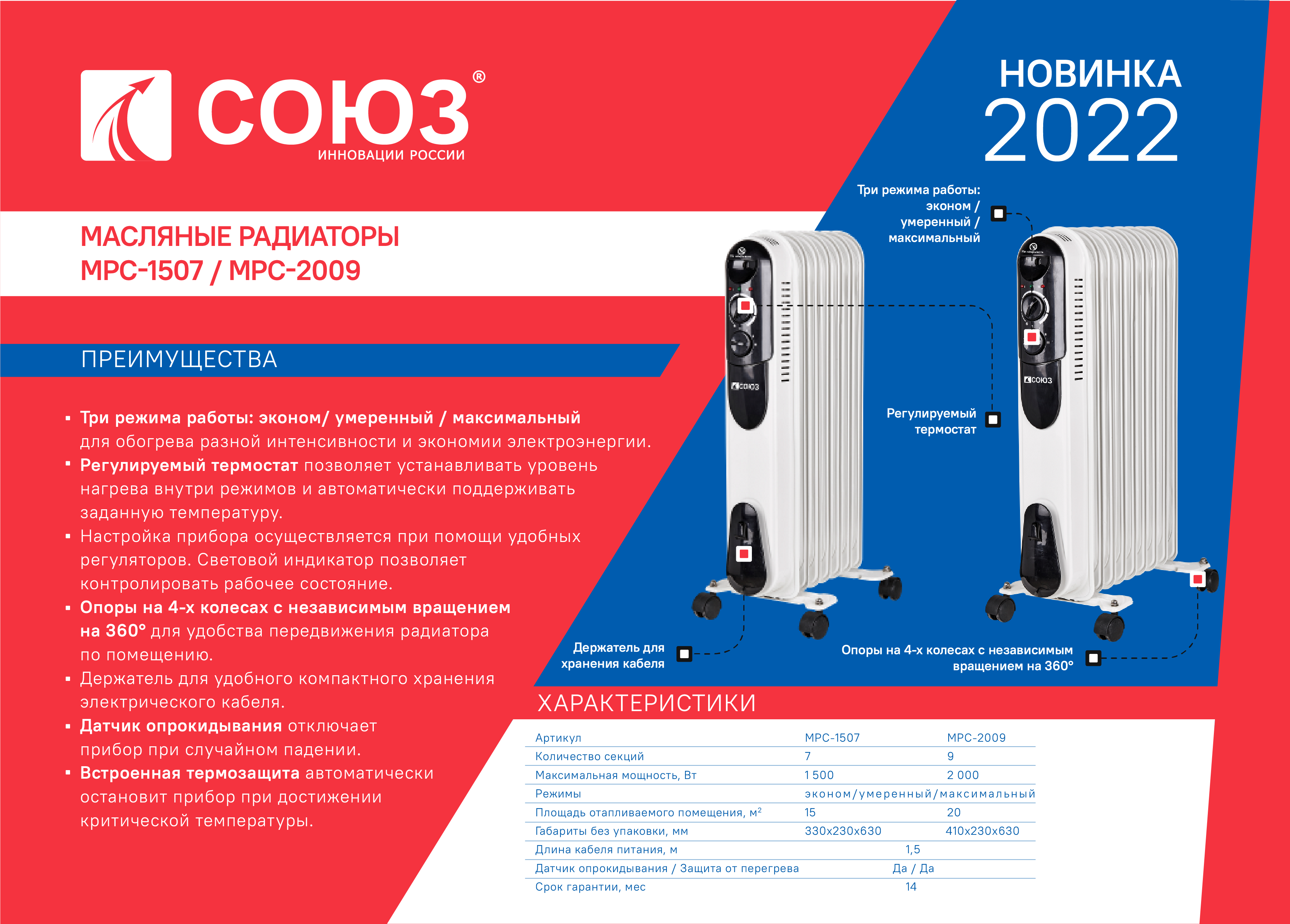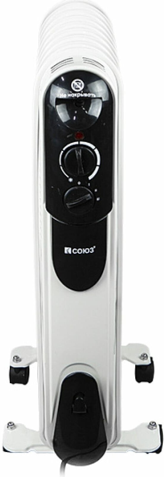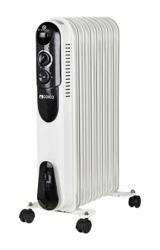 СОЮЗ МРС-2009 — современный и эргономичный масляный радиатор на девять секций — предназначен для обогрева небольших помещений площадью до 20 м2. Благодаря нагревательному элементу мощностью 2 кВт обогреватель быстро набирает рабочую температуру, а большое количество секций, позволяют эффективно и равномерно распределять тепло. Модель имеет простое и интуитивно понятное управление с помощью механических регуляторов, расположенных на передней панели. С помощью одного регулятора пользователь выбирает оптимальный режим нагрева из трех возможных: эконом/умеренный/максимальный. Назначение второго регулятора — управление настройкой термостата, задача которого — автоматическое поддержание постоянной температуры в помещении. Для визуального контроля включенного устройства предусмотрен отдельный индикатор питания, также размещенный на панели управления. Устройство оснащено термозащитой и датчиком опрокидывания, что предотвращает риск возникновения пожароопасных ситуаций. За счет компактных габар