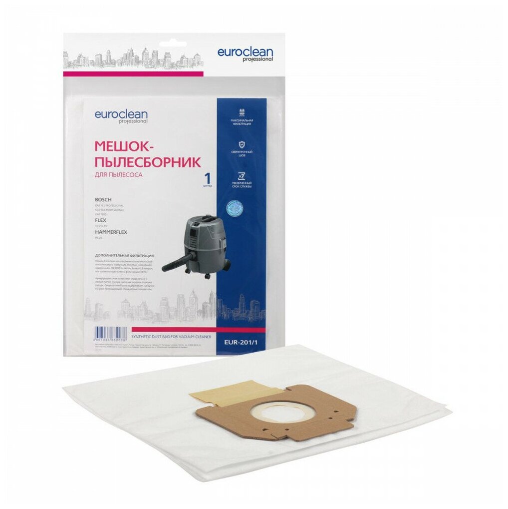 Мешок Euro Clean изготавливается из многослойного нетканого материала ProClean, способного задерживать до 99.99% частиц более 0.3 микрон, что соответствует классу фильтрации HEPA.