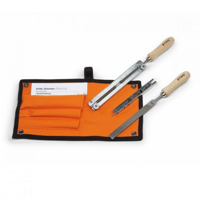 Заточной набор состоит из зажимной державки с круглым напильником, плоского напильника и калибра в прочном футляре.