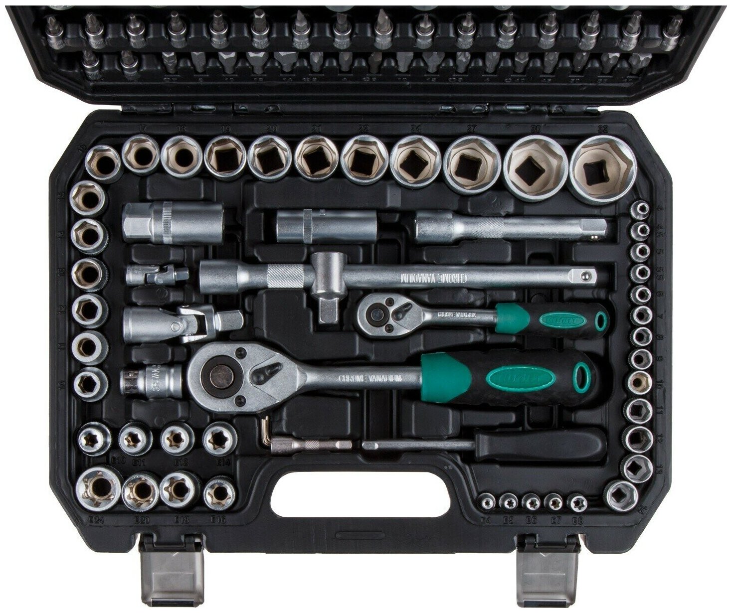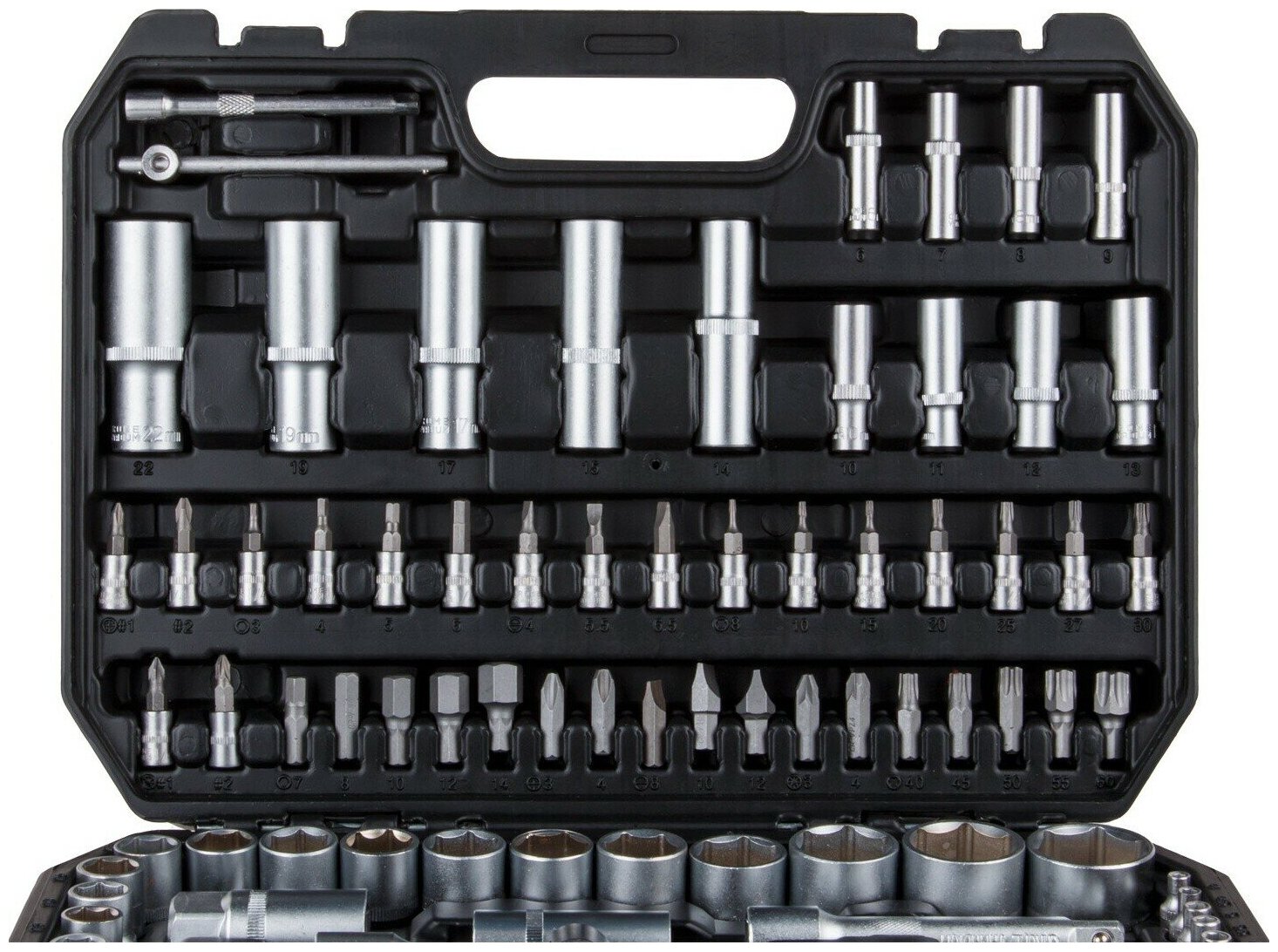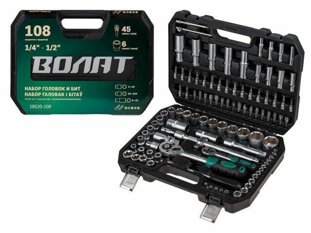 Характеристики Количество в наборе: 108 шт Тип головок: 6-гранные; Е-тип; биты Присоединительный размер: 1/4 + 1/2 дюйма Количество граней: 6 Система измерения: метрическая Min размер головки: 6 мм Max размер головки: 32 мм Min размер головки (дюйм): нет Max размер головки (дюйм): нет Вес молотка: нет г Комбинированные ключи: нет Клещи: нет Трещотка: есть Torx: бита/головка Свечной ключ: нет Свечные головки: 16 мм/21 мм Материал упаковки: пластик Размер посадки головки: 1/4; 1/2 дюйма Дюймовые головки в комплекте: нет Тип ключа: шестигранные Хвостовик бит: 5/16 (тип C)/1/4 квадрат Посадочный размер трещотки: 1/4; 1/2 дюйма Комплектация Головка торцевая 1/4": 4, 4.5, 5, 5.5, 6, 7, 8, 9, 10, 11, 12, 13, 14 мм; Головка торцевая длинная 1/4": 6, 7, 8, 9, 10, 11, 12, 13 мм; Головка торцевая 1/4": E4, E5, E6, E7, E8; Головка с насадкой HEX 1/4": H3, H4, H5, H6; Головка с насадкой TORX 1/4": T8, T10, T15, T20, T25, T30; Головка с насадкой SL 1/4": SL4, SL5.5, SL7; Головка с насадкой PH 1/4": PH1, PH2; Головка с насадкой PZ 1/4": PZ1, PZ2; Головка торцевая 1/2": 10, 11, 12, 13, 14, 15, 16, 17, 18, 19, 20, 21, 22, 23, 24, 27, 30, 32 мм; Головка торцевая длинная 1/2": 14, 15, 17, 19, 22 мм; Головка торцевая 1/2": E10, E11, E12, E14, E16, E18, E20, E24; Свечная головка 1/2": 16, 21 мм; Насадка 5/16" HEX: H7, H8, H10, H12, H14; Насадка 5/16" TORX: T40, T45, T50, T55, T60; Насадка 5/16" SL: SL8, SL10, SL12; Насадка 5/16" PH: PH3, PH4; Насадка 5/16" PZ: PZ3, PZ4; Трещотка 1/4"; Удлинитель 1/4" 50 мм; Удлинитель 1/4" 100 мм; Кардан 1/4"; Вороток-отвертка 1/4" 150 мм; Вороток 1/4" с плавающей головкой 115 мм; Трещотка 1/2"; Переходник (держатель для бит) 1/2"х5/16"(HEX); Переходник 3/8"(F)х1/2"(М) с отверстием; Удлинитель 1/2" 125 мм; Удлинитель 1/2" 250 мм; Кардан 1/2"; Ключ шестигранный Г-обр: 1.5, 2, 2.5 мм; Кейс
