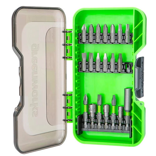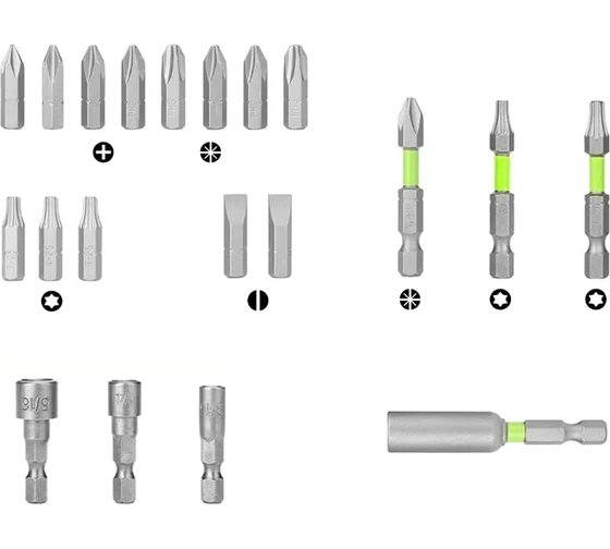 Набор содержит биты, торцевые головки и адаптеры востребованных размеров для производительной работы в мастерской или на строительном объекте со всеми представленными на рынке безударными и ударными дрелями-шуруповертами и ударными винтовёртами.
