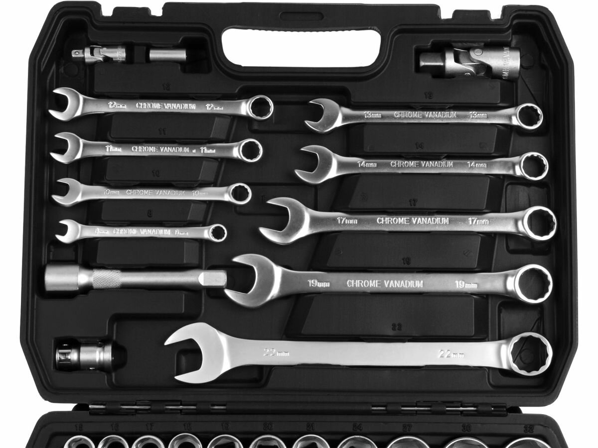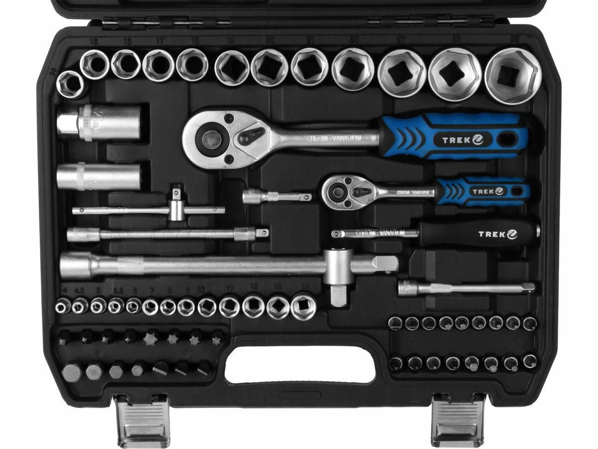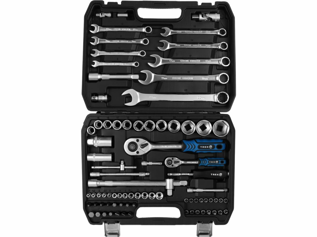 Набор инструментов 1/4", 1/2" 6 граней 82 предмета TREK (TR22082) — это многофункциональный комплект, предназначенный для ремонта и обслуживания автомобилей. Этот набор включает в себя инструменты с размерами 1/4" и 1/2", что делает его универсальным для различных задач. Рабочие части набора изготовлены из углеродистой стали, что обеспечивает высокую прочность и долговечность инструментов. Финишная обработка в виде сатинирования придает им не только эстетичный вид, но и защищает от коррозии. Все головки имеют шестигранный профиль, что обеспечивает надежное сцепление с крепежом и минимизирует риск срыва граней.