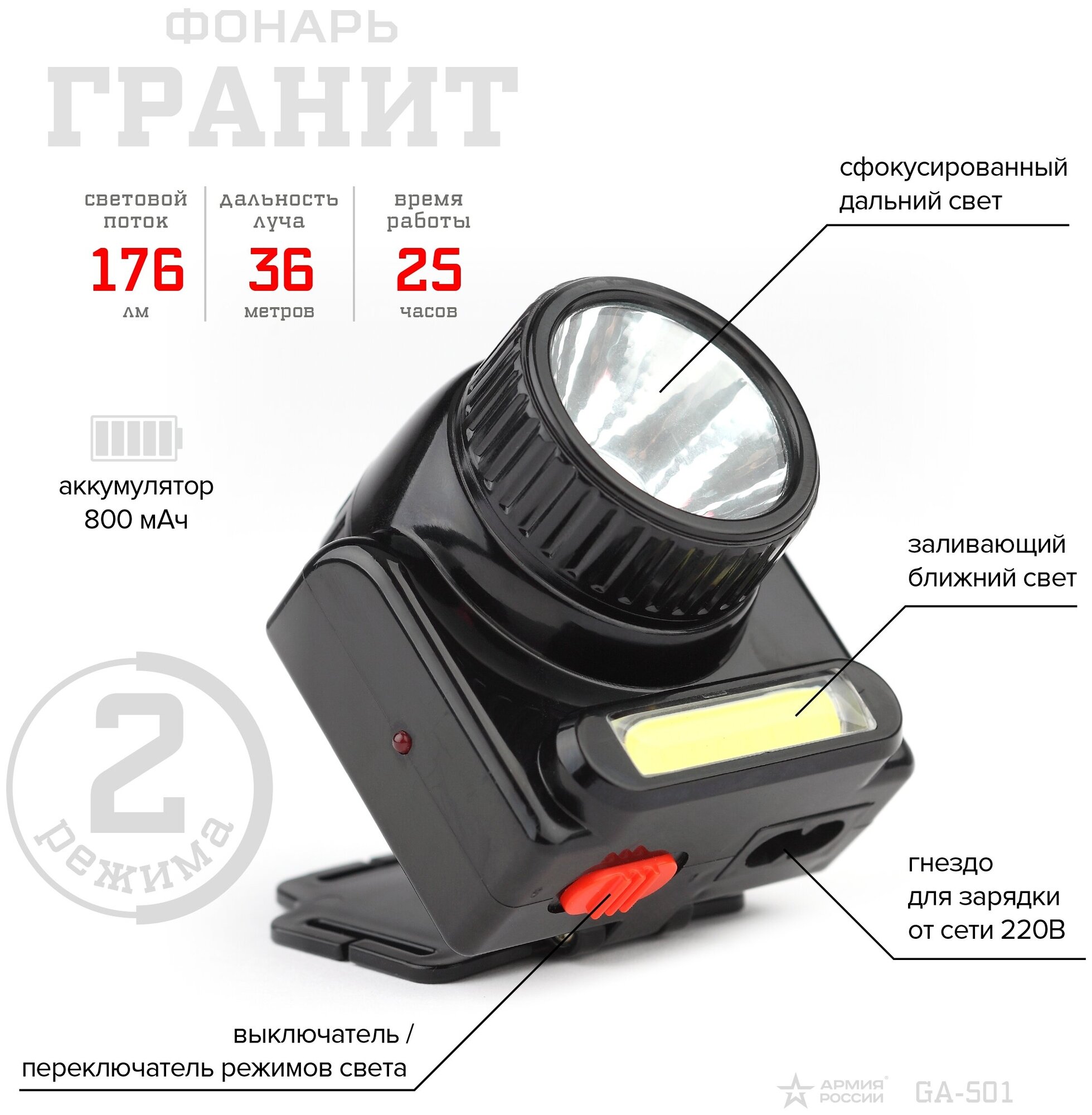 Налобный фонарь ЭРА GA-501 армия россии Гранит Б0030185 - мощный налобный светодиодный фонарь в подарочной коробке. Два режима - ближний свет на мультикристальных светодиодах СОВ и дальний свет на классических LED. В комплекте - удобный шнур для зарядки аккумулятора от электросети и мягкий регулируемый ремешок с фирменной звездой "Армия России". Этот фонарь - часть серии ЭРА Армия России, которая является совместным проектом отечественного бренда ЭРА и АО "Военторг", действующего на основании лицензии Министерства обороны РФ. Мощный аккумулятор (800 мАч) непрерывно работает без подзарядки 25 часов. Режимы переключаются акцентированной красной кнопкой. Пользователь может выбрать либо дальний направленный свет (длина луча - 36 метров!), либо ближнее заливающее освещение, особая яркость которого достигается использованием технологии СОВ ("мультикристалл на плате") - промышленный свет, адаптированный для универсальных целей. Название фонаря - отражение одного из известнейших достижений российской военной техники. Гранит - это сверхзвуковая противокорабельная крылатая ракета с повышенной дальностью действия. Технические характеристики Армия России GA-501 Армия России Гранит Б0030185 Тип налобный Тип аккумулятора кислотно-свинцовый Материал корпуса пластик Емкость 0,8 А*ч Защита от влаги нет Защита от удара да Взрывозащита да Защита от перезаряда да Источник света светодиод Цвет черный Количество режимов работы 2 Количество аккумуляторов в комплекте 1 Батарейки в комплекте нет Длина 70 мм Время работы 25.000 ч Элементы питания встроенный аккумулятор Количество и напряжение элементов питания 1х4В Степень защиты IP20 Световой поток 176 Лм Дистанция освещения 36 м Резьба под штатив нет дюйм Количество светодиодов/ламп 2 шт Вес нетто 0,177 кг Габариты без упаковки 70х60х72 мм Преимущества Армия России GA-501 Армия России Гранит Б0030185 Материал ЭРА GA-501 армия россии Гранит Б0030185: пластик; Тип лампы: светодиоды 3Вт COB + 3Вт LED; Аккумулятор в комплекте; Практичная черная расцветка; Время работы: 25 000 часов; Дальность луча: 36 метров. Комплектация Адаптер; Аккумулятор; Коробка.
