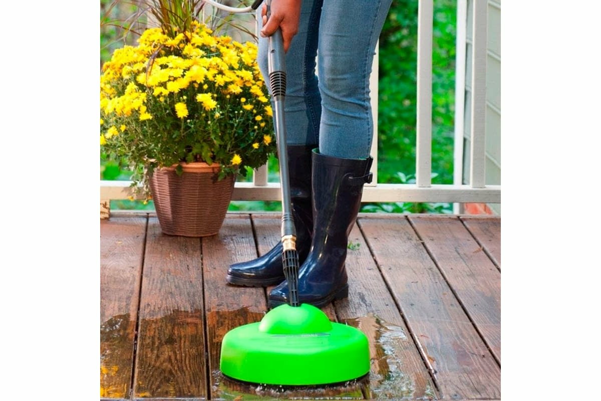 Отлично подходит для мытья пола в гараже, дорожек из бетона и плитки, мытья патио. Крепится к универсальному разъему быстрого соединения 1/4 дюйма на трубке пистолета.