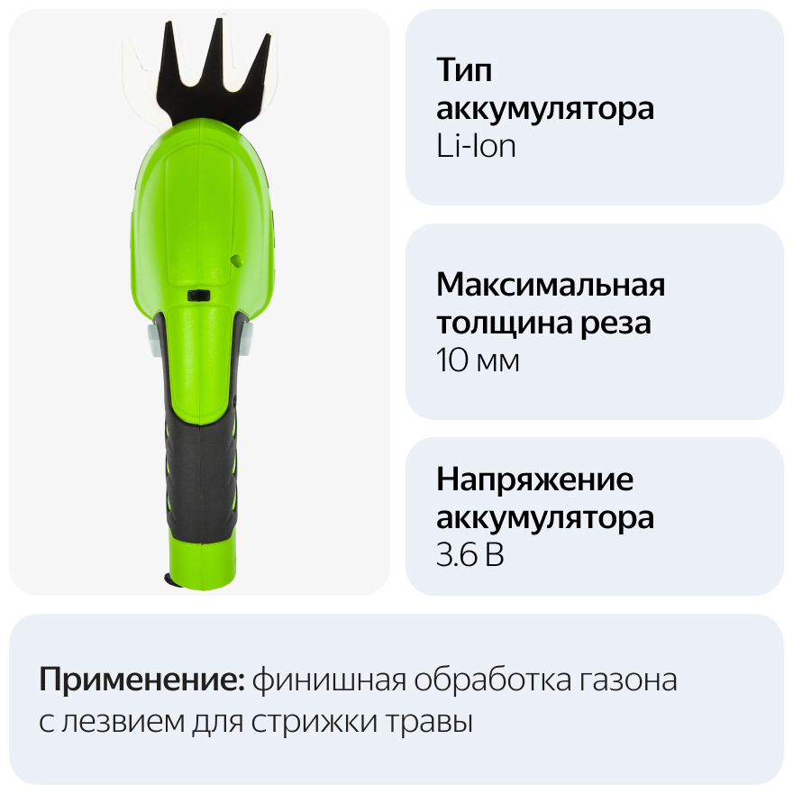 Аккумуляторные садовые ножницы Greenworks 2903307 используются в бытовых целях. Укомплектованы лезвием для стрижки травы и лезвием-кусторезом, которые имеют алмазную заточку. Одной зарядки инструмента хватает на 30 минут работы. Для контроля степени заряда предусмотрен светодиодный индикатор.Ножницы отличаются компактностью и легкостью - весят всего 700 грамм. Они идеально подходят для обрезания кромок газона в труднодоступных местах. Источник питания - встроенная литий-ионная батарея напряжением 3.6 В.